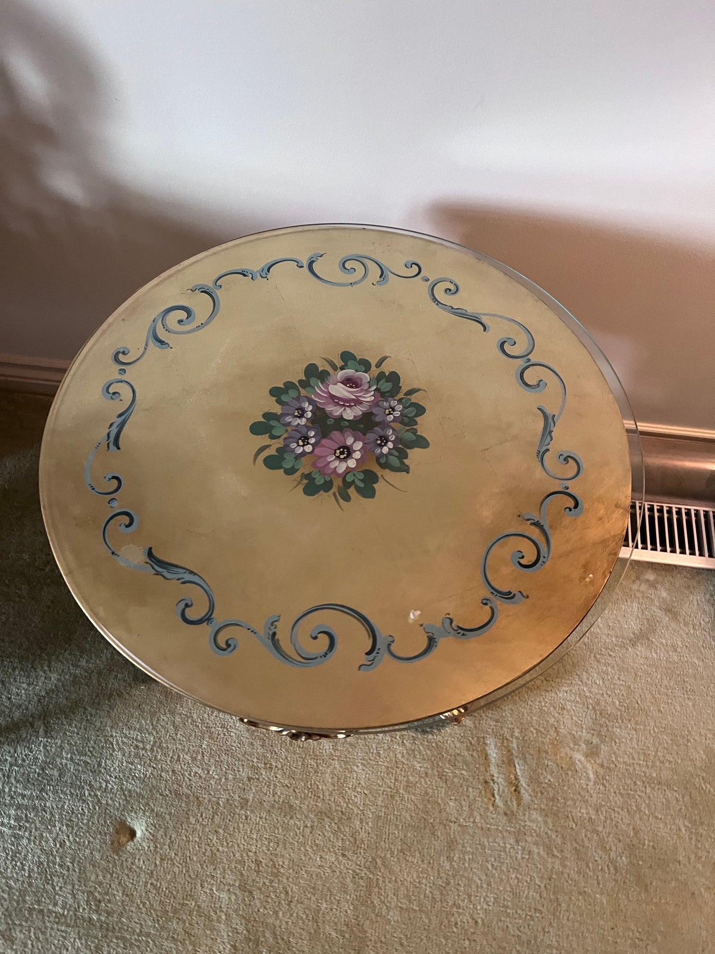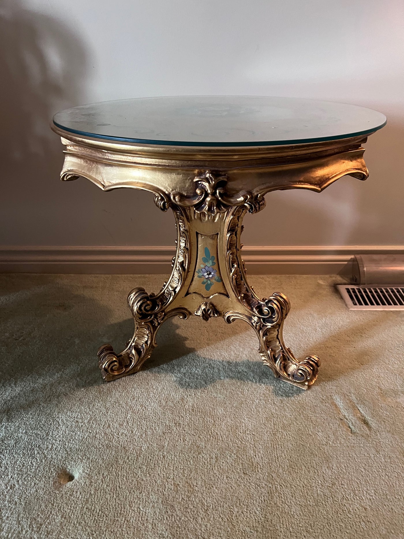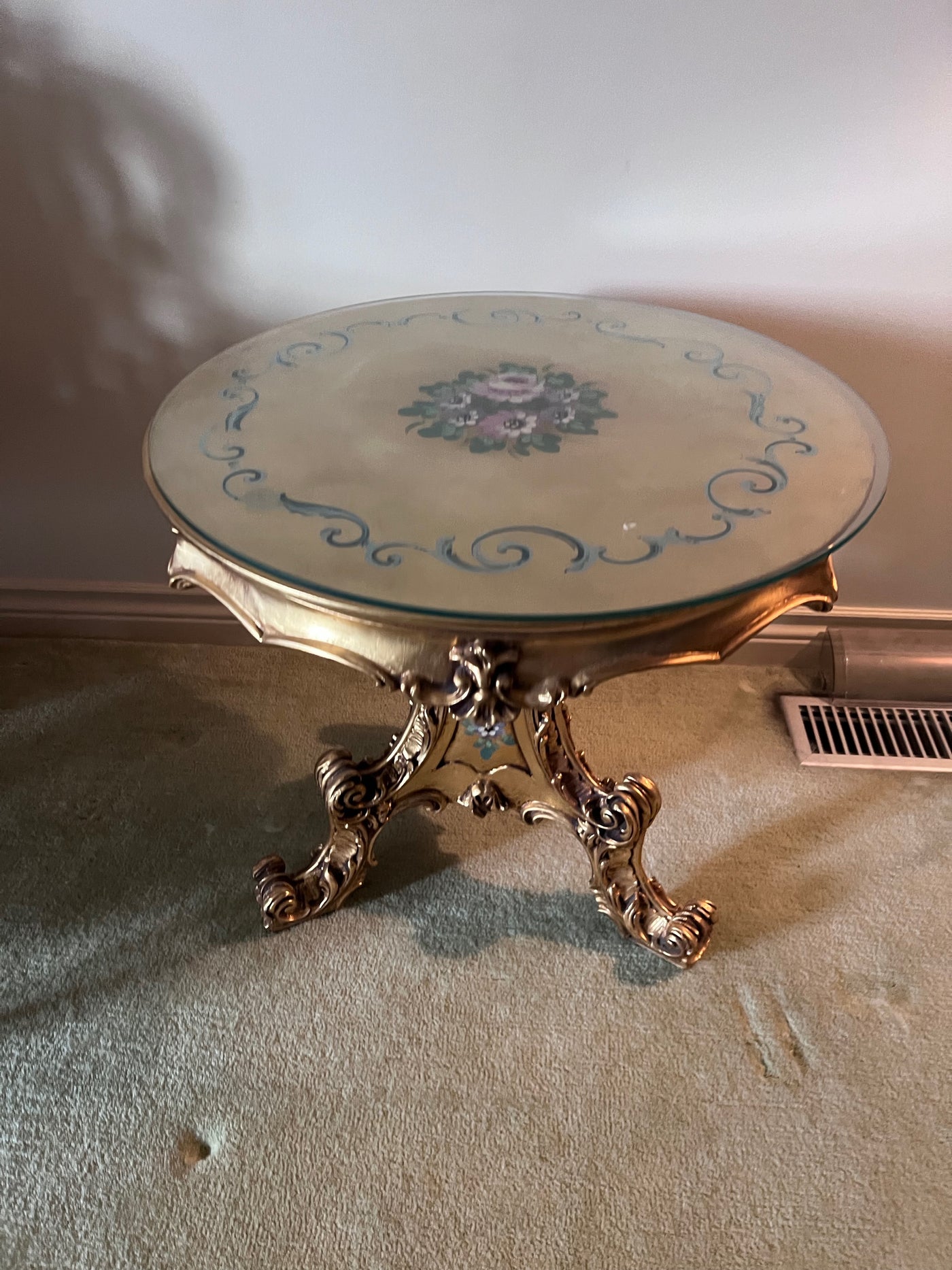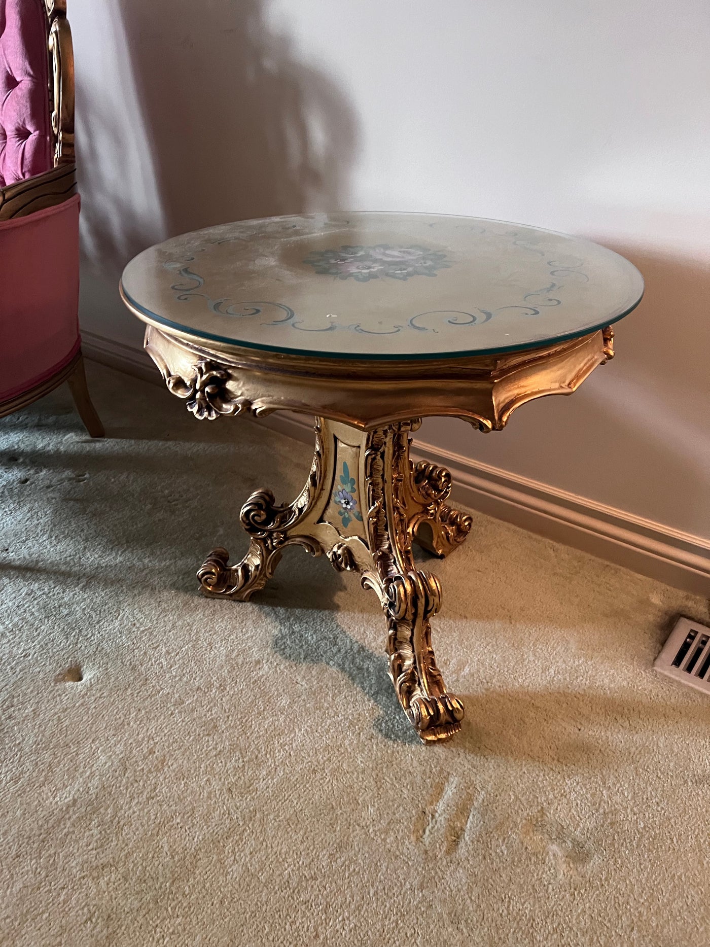 Vintage Gold Side Table with Inlay Design, Glass Top.