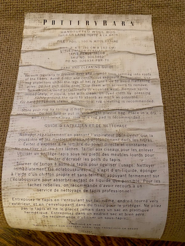 Pottery Barn Handtufted 100% Wool Rug- 3ft x 5ft.