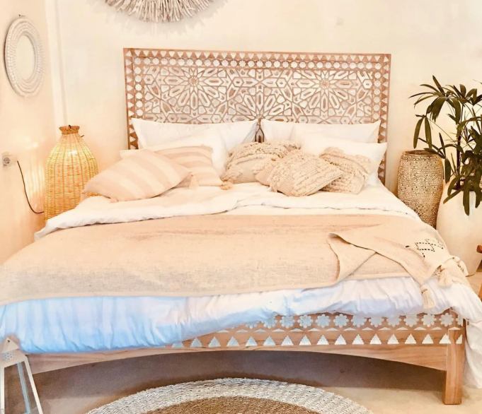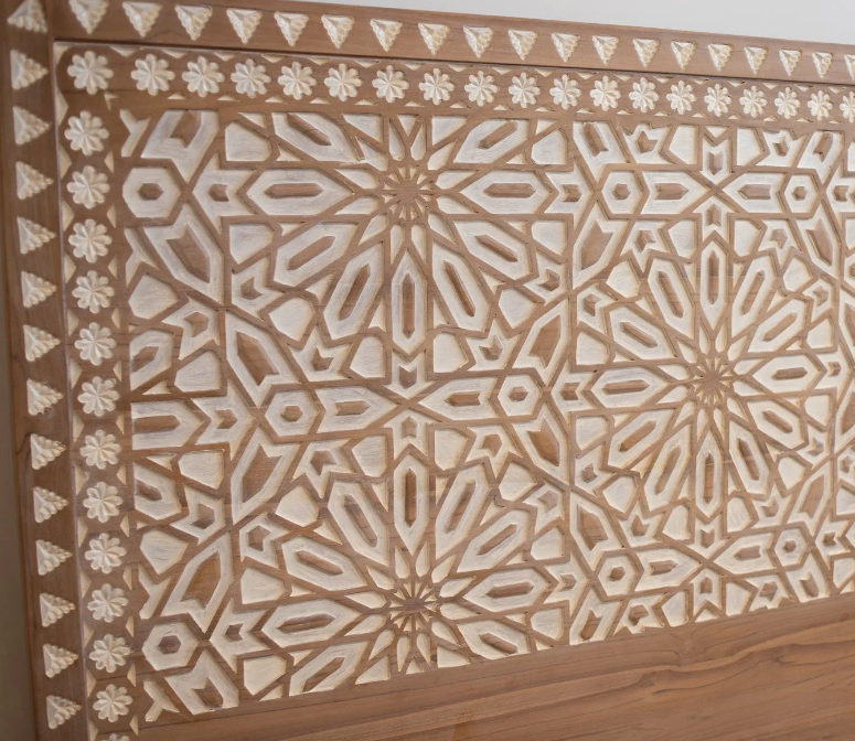 This handcarved bedroom centerpiece features a two-toned motif - inspired by a dramatic Moroccan entryway - carved along its headboard, footboard and rails.
