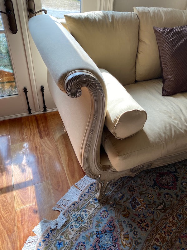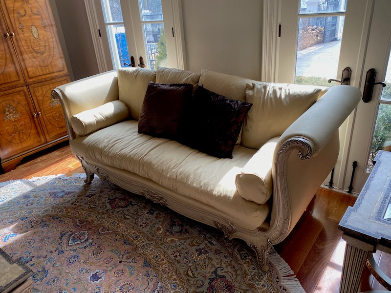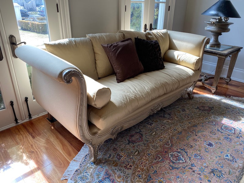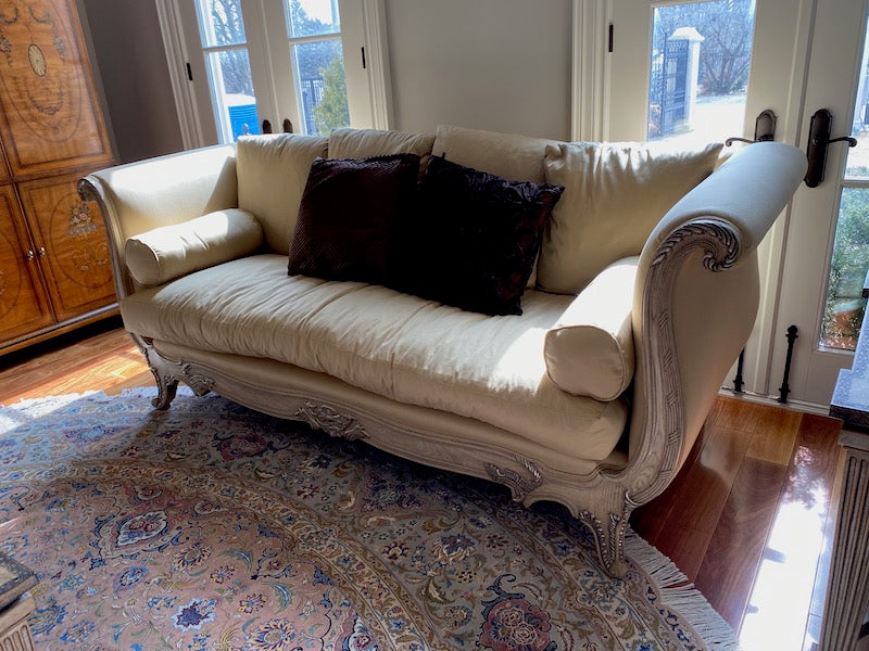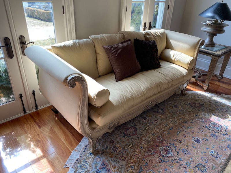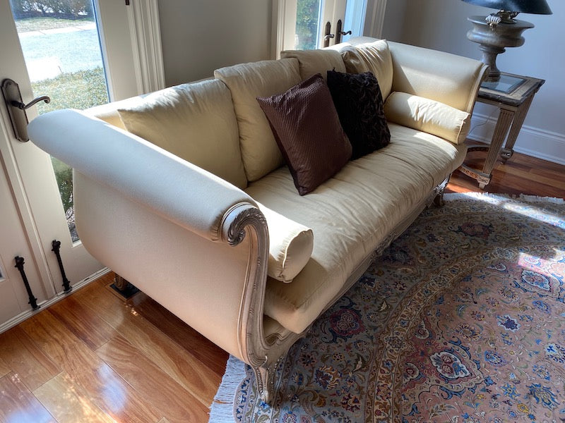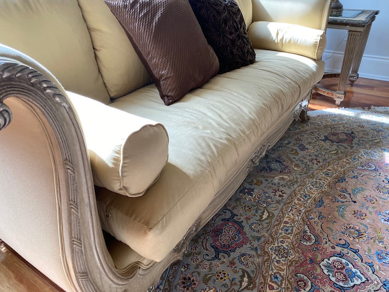 The Art Shoppe Sofa- Beige Upholstery, Rolled Arms & Curved Wood Frame. In beautiful condition!