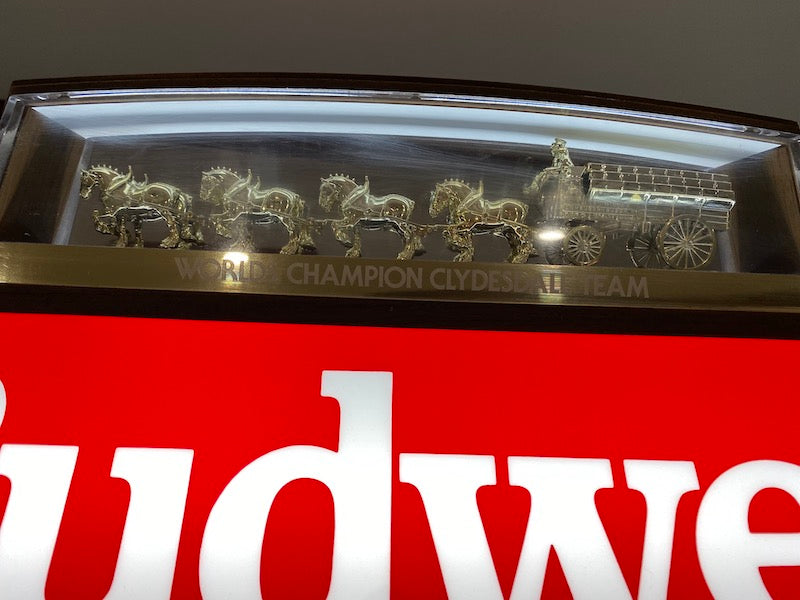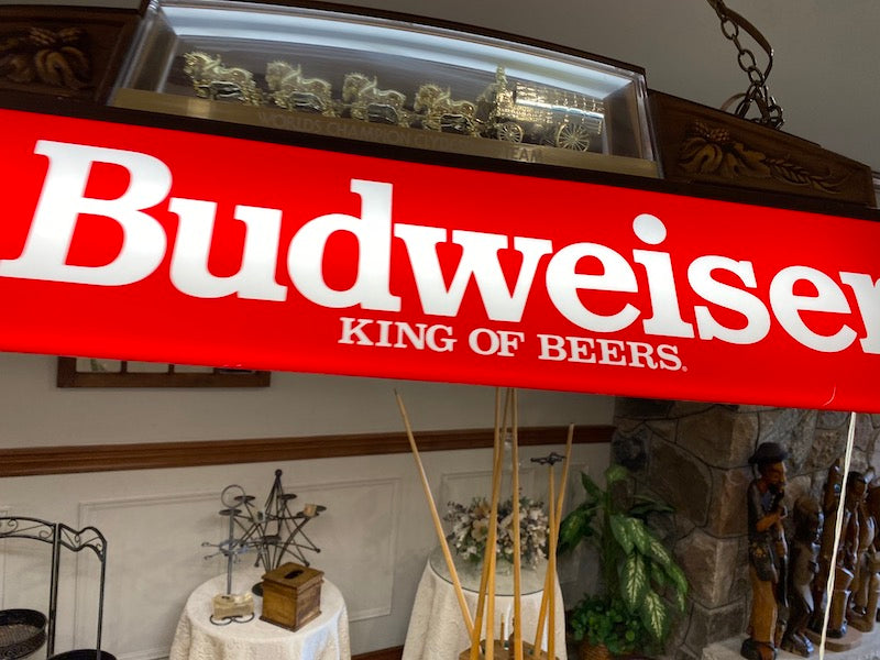 Budweiser 'King of Beers' Worlds Champion Clydesdale Team- Vintage Pool Table Light Fixture. The clock shown on the front face of fixture is battery powered.