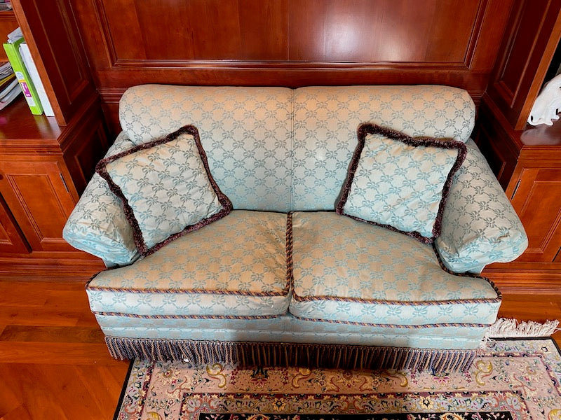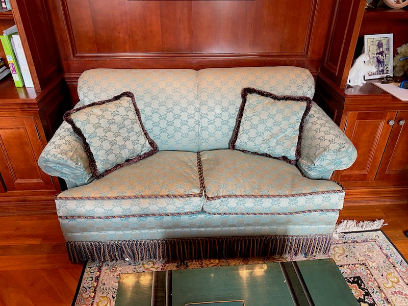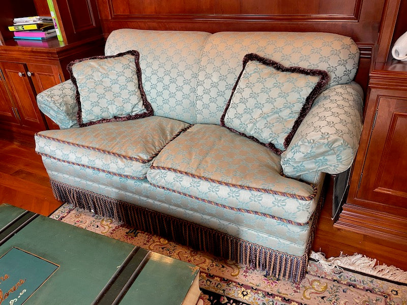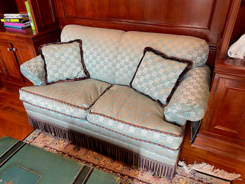 Custom Upholstered Down Filled Love Seat. Light blue silk-like fabric, with a rope trim and frills on the bottom.