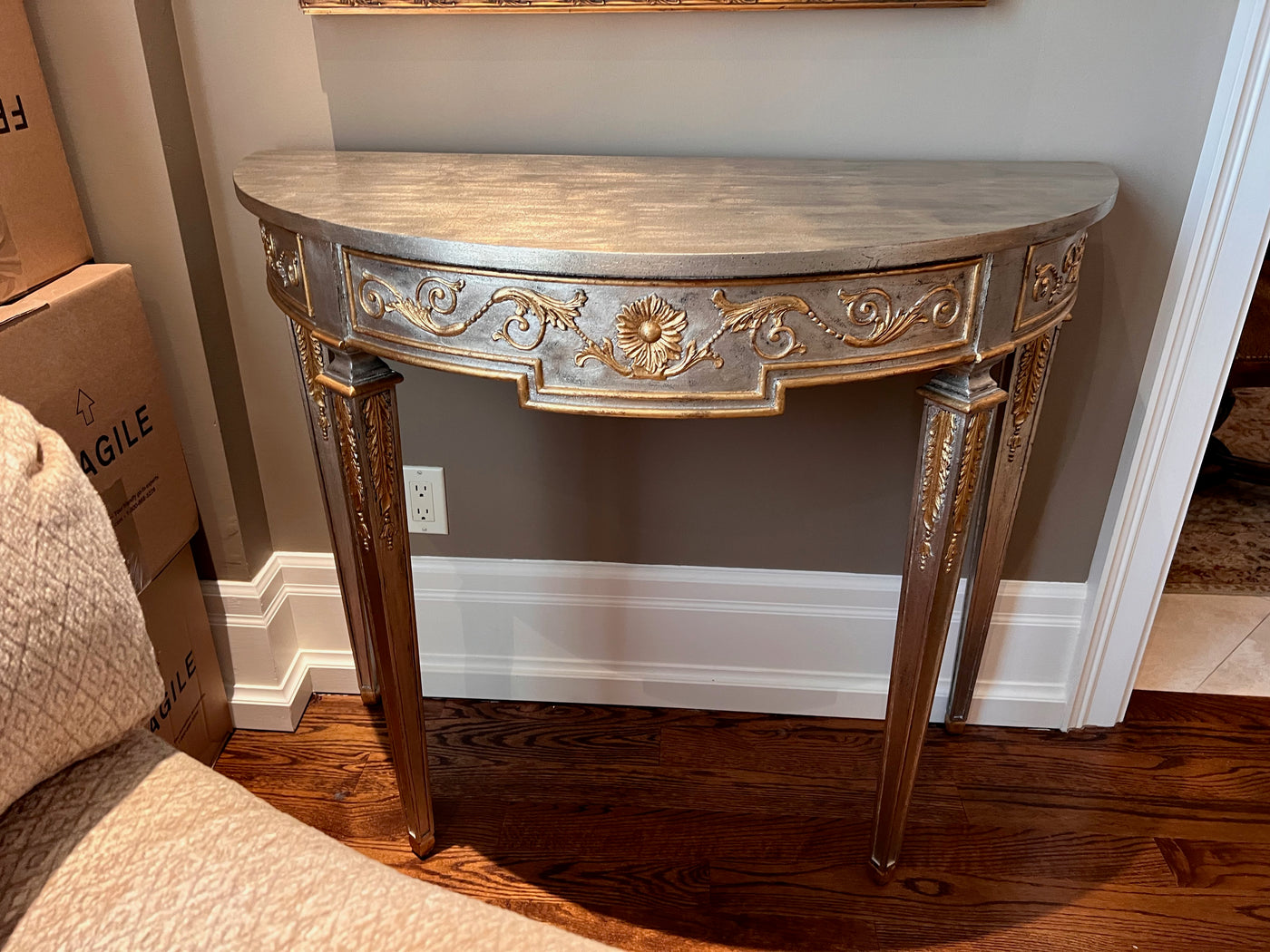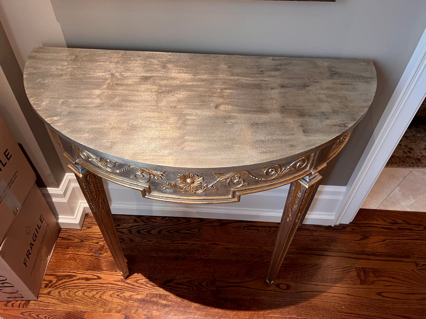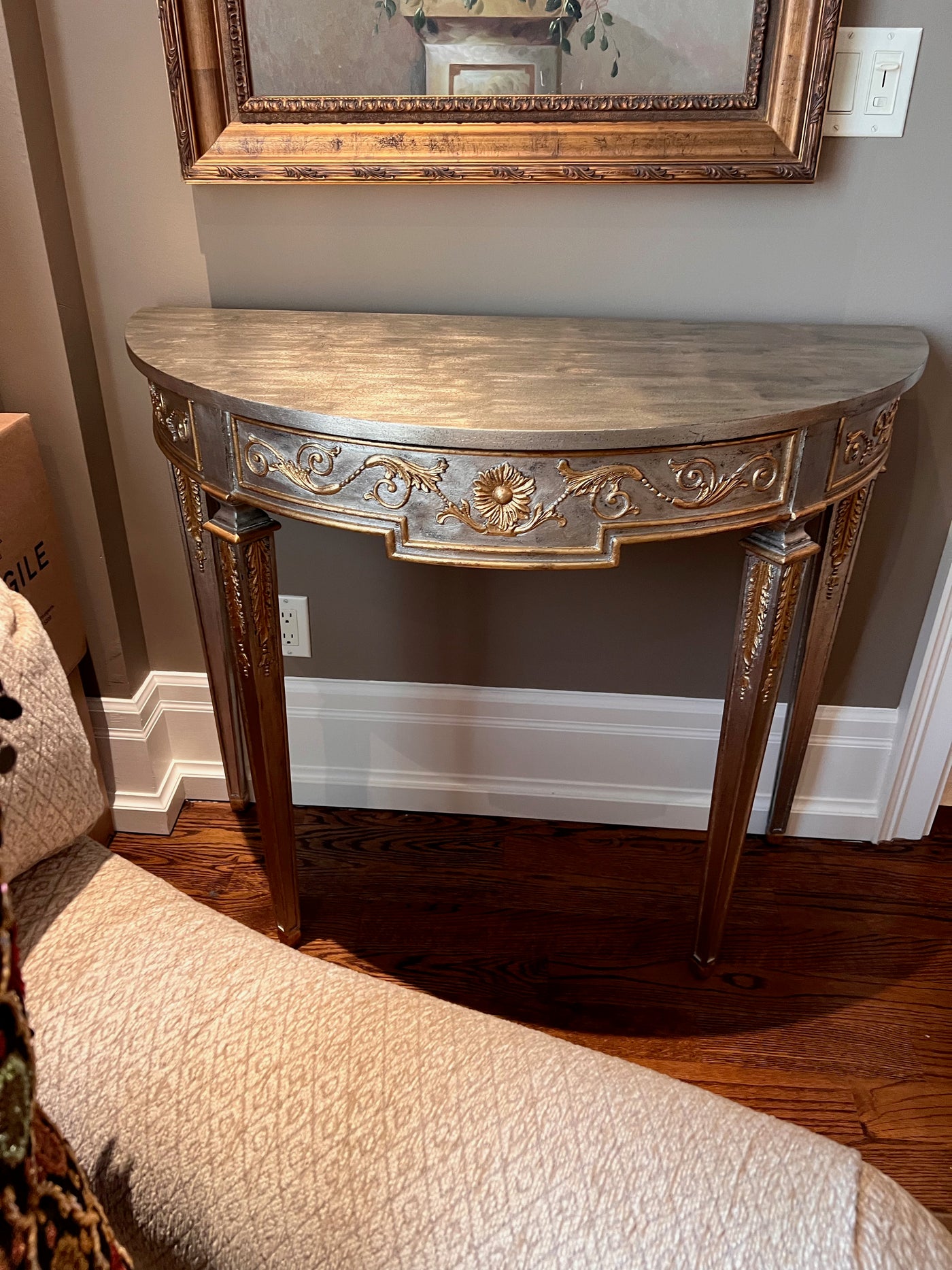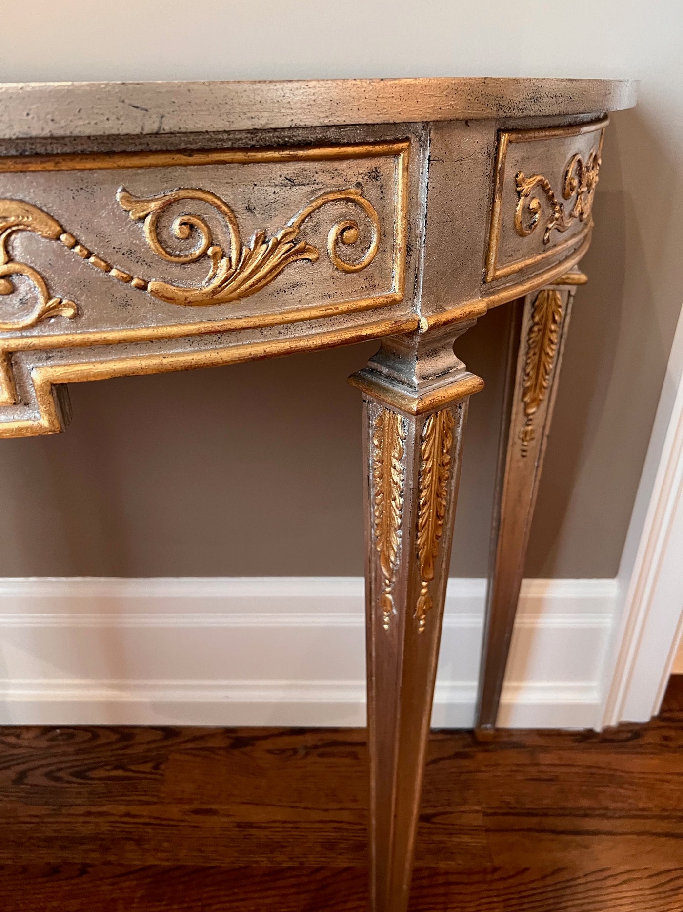 Maitland Smith Demilune Console Table. Beautiful silver and gold tones. Excellent contemporary piece that can fit with a Traditional or be mixed in with a modern style.
