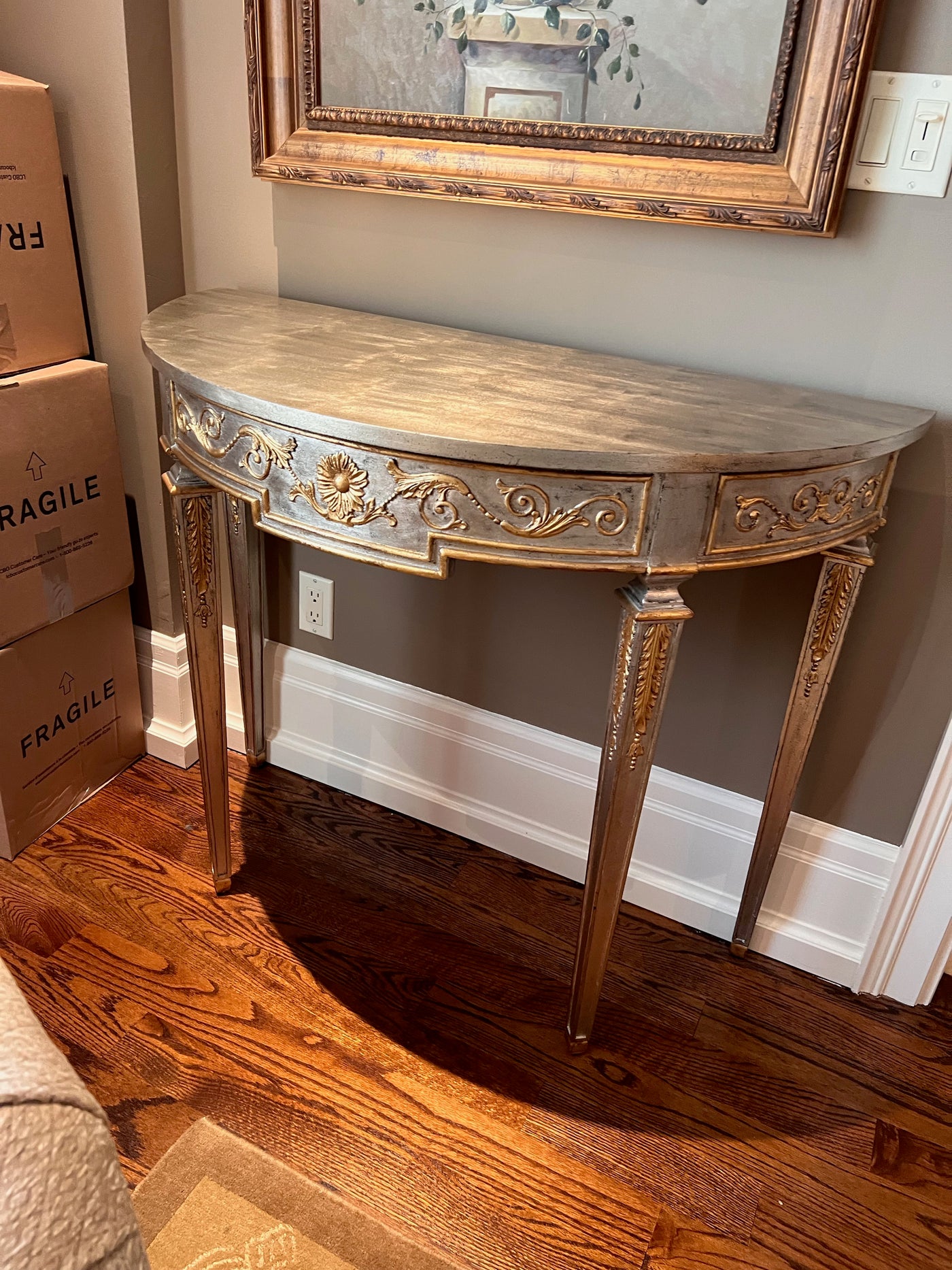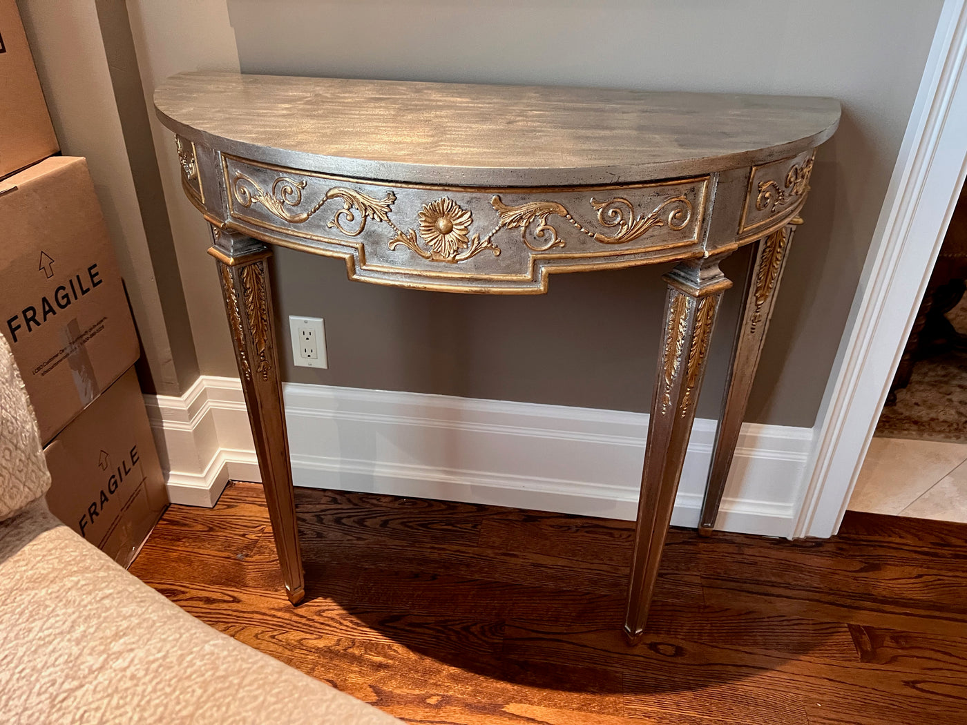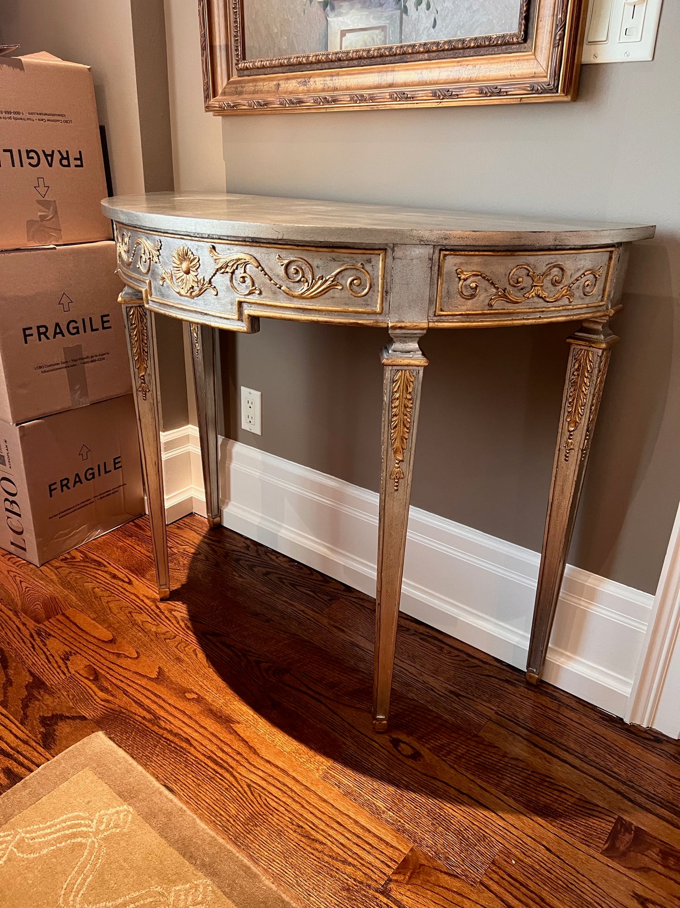 Maitland Smith Demilune Console Table. Beautiful silver and gold tones. Excellent contemporary piece that can fit with a Traditional or be mixed in with a modern style.