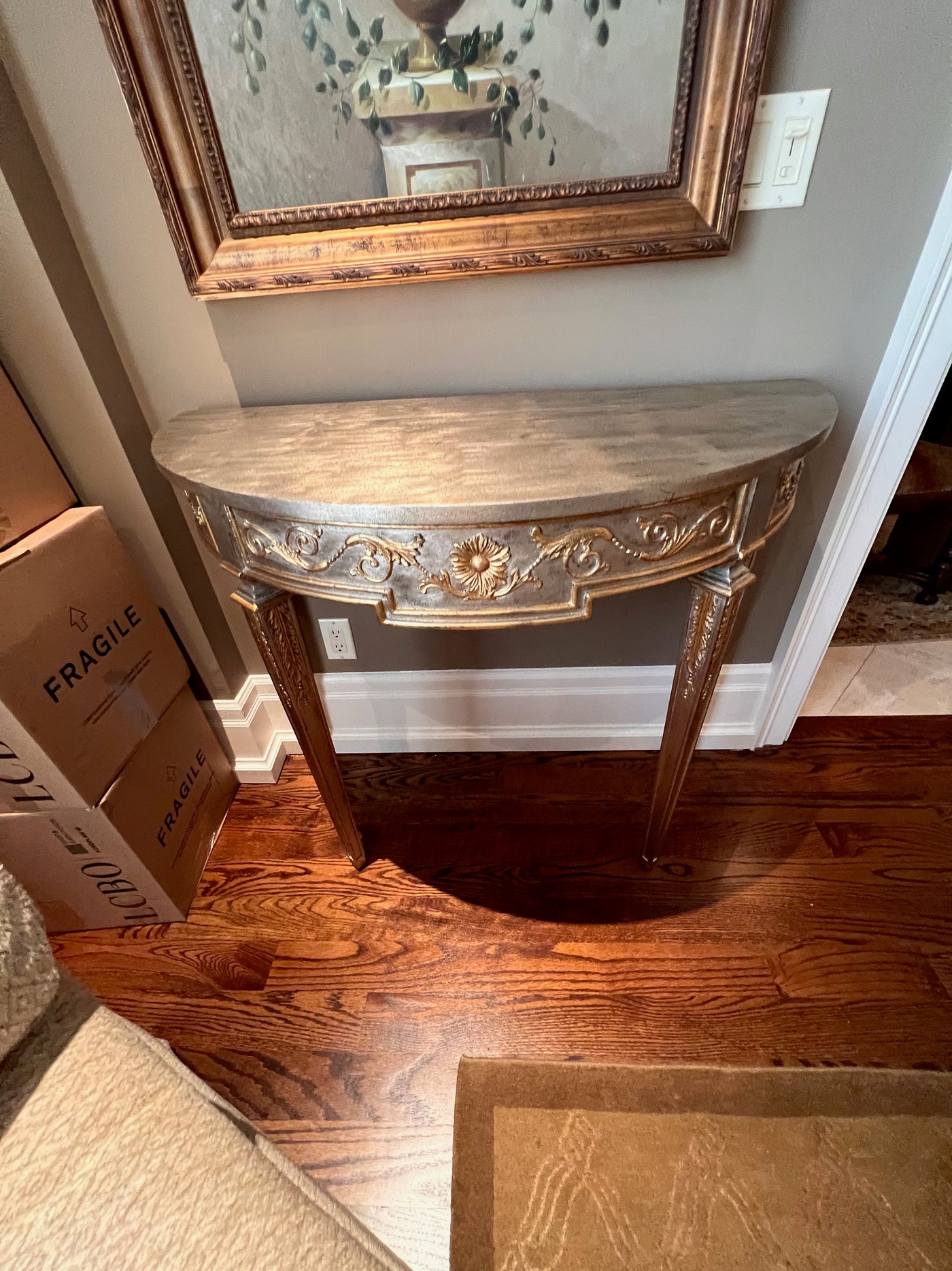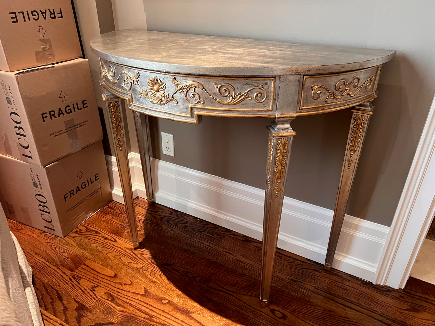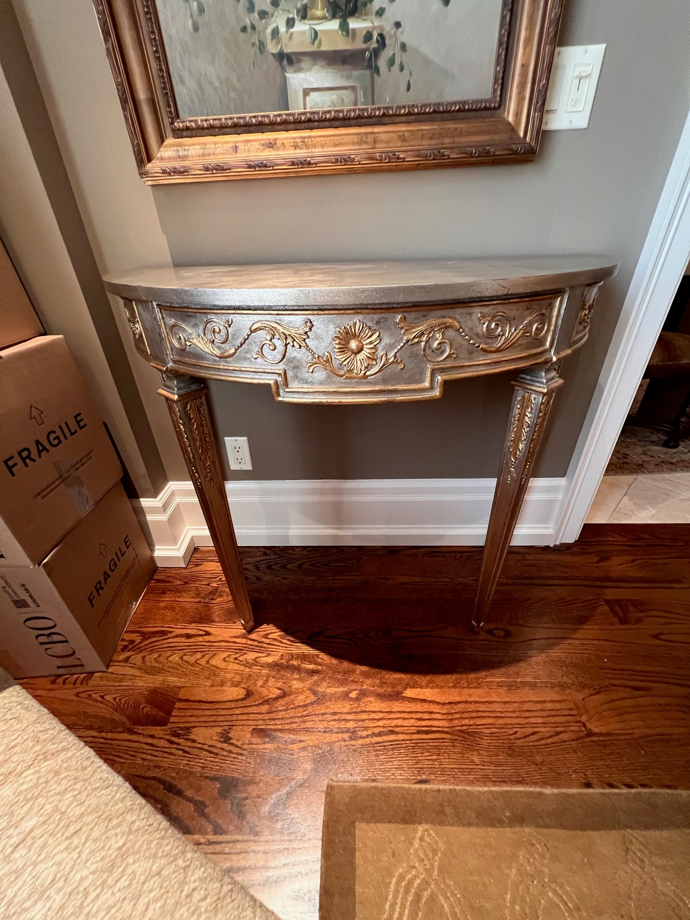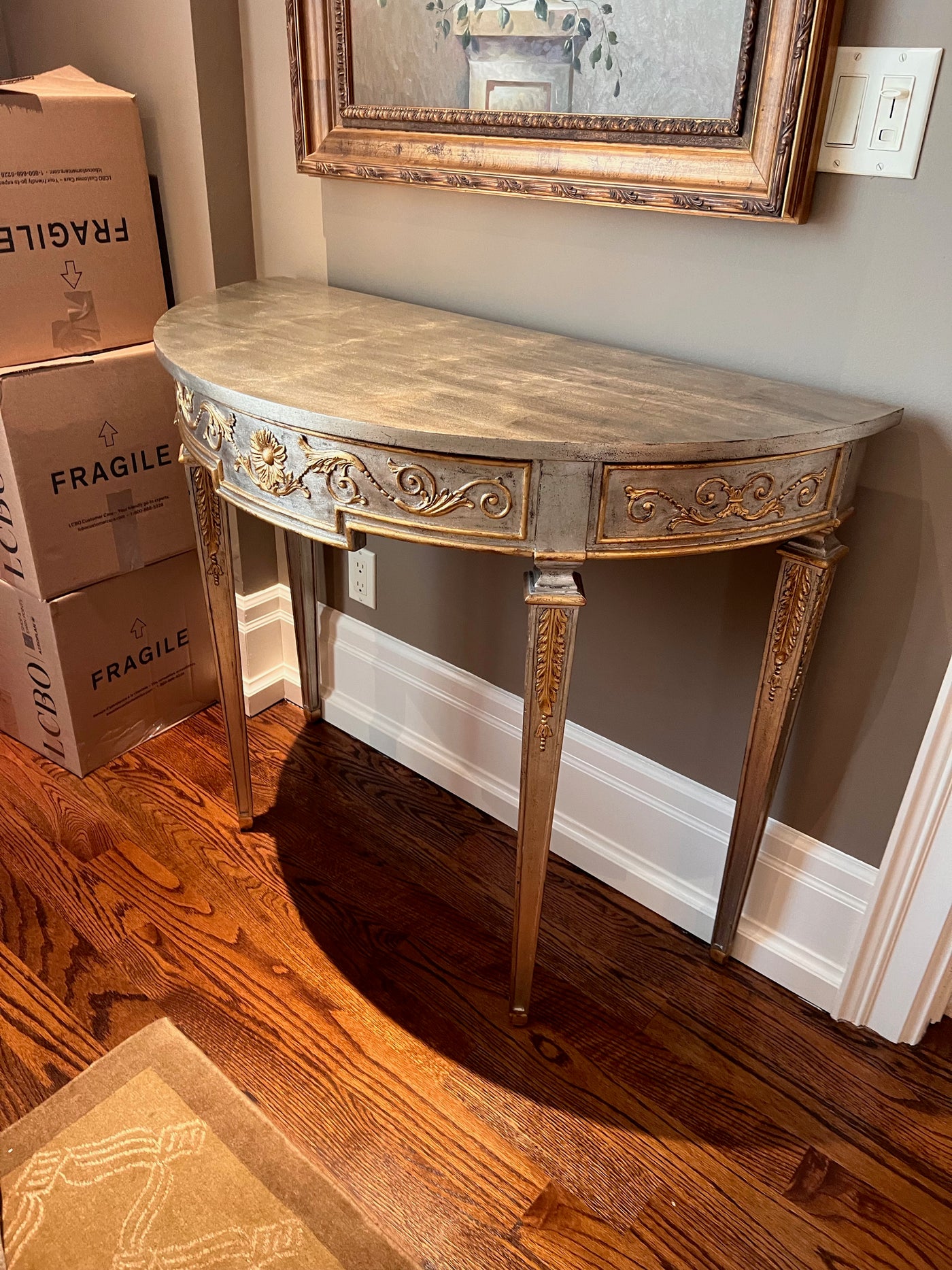 Maitland Smith Demilune Console Table. Beautiful silver and gold tones. Excellent contemporary piece that can fit with a Traditional or be mixed in with a modern style.