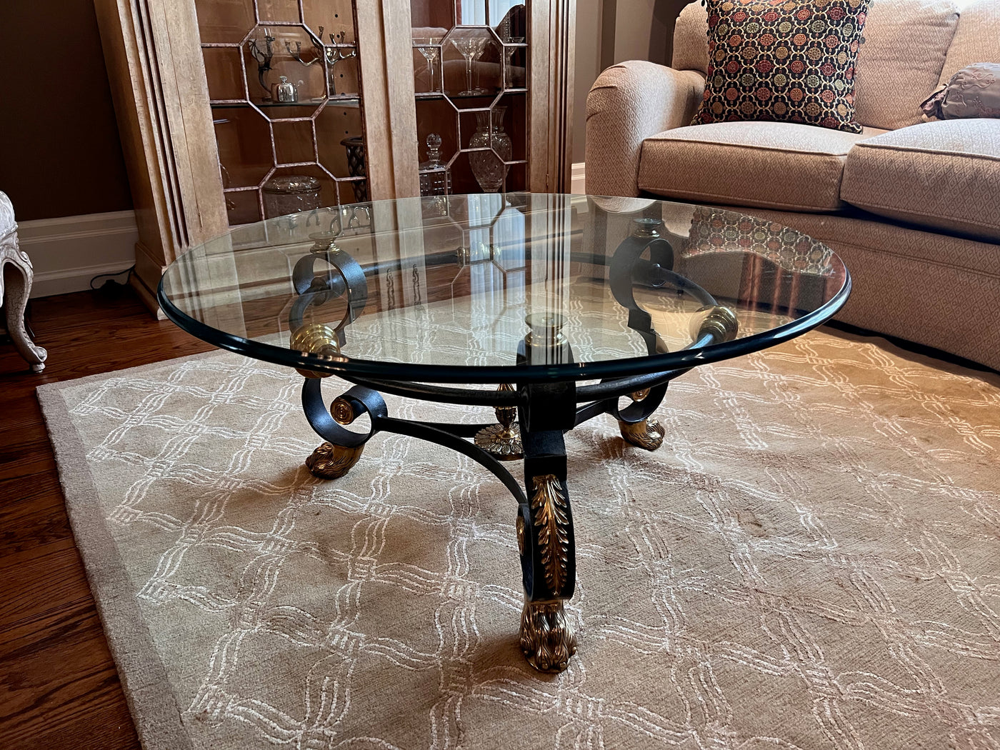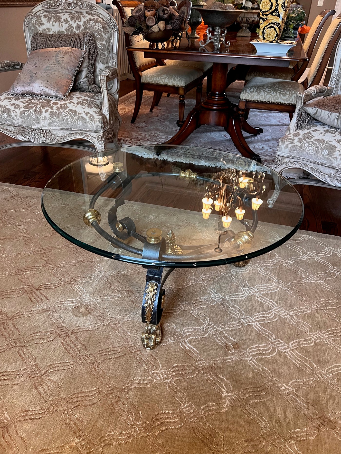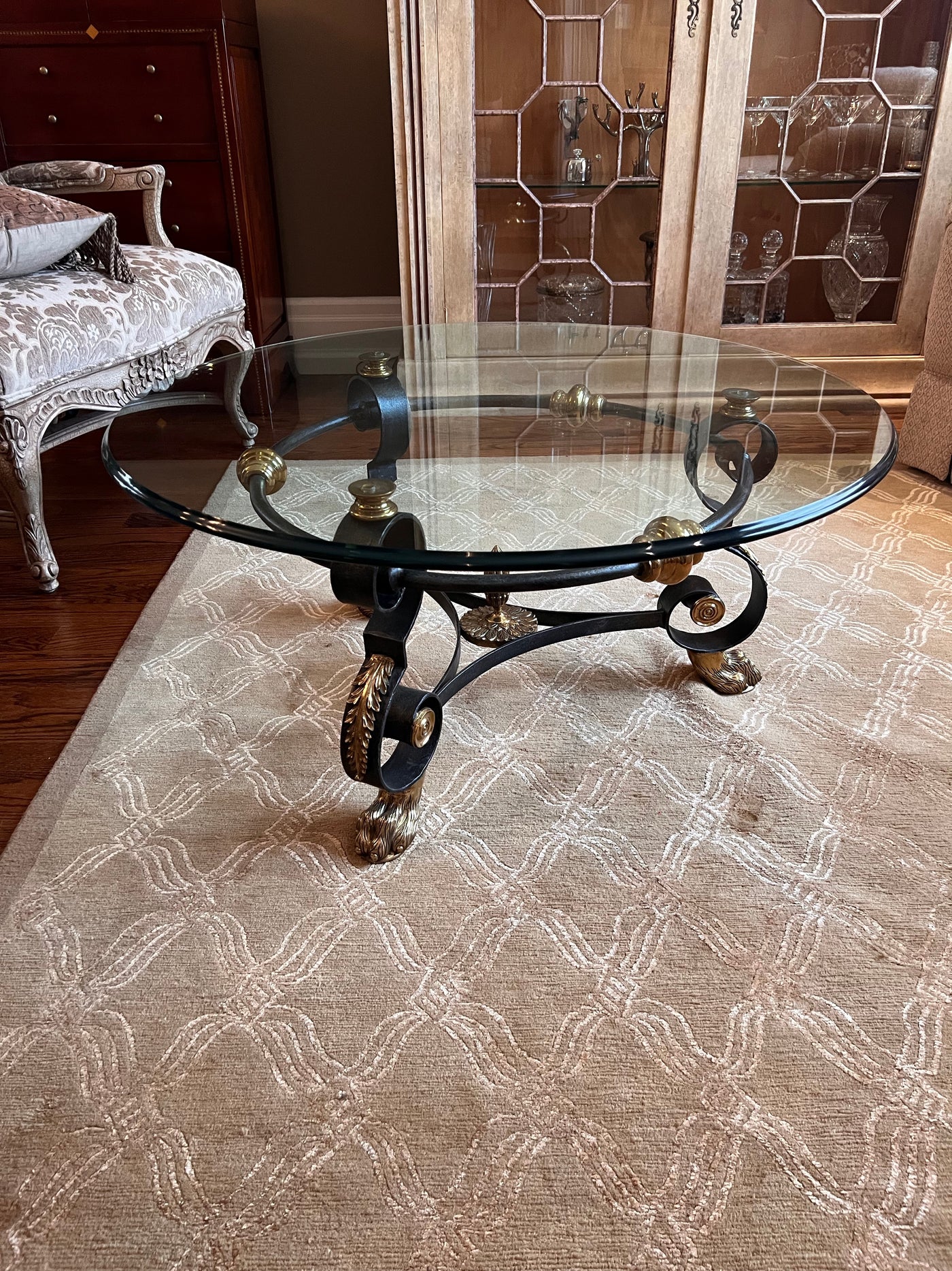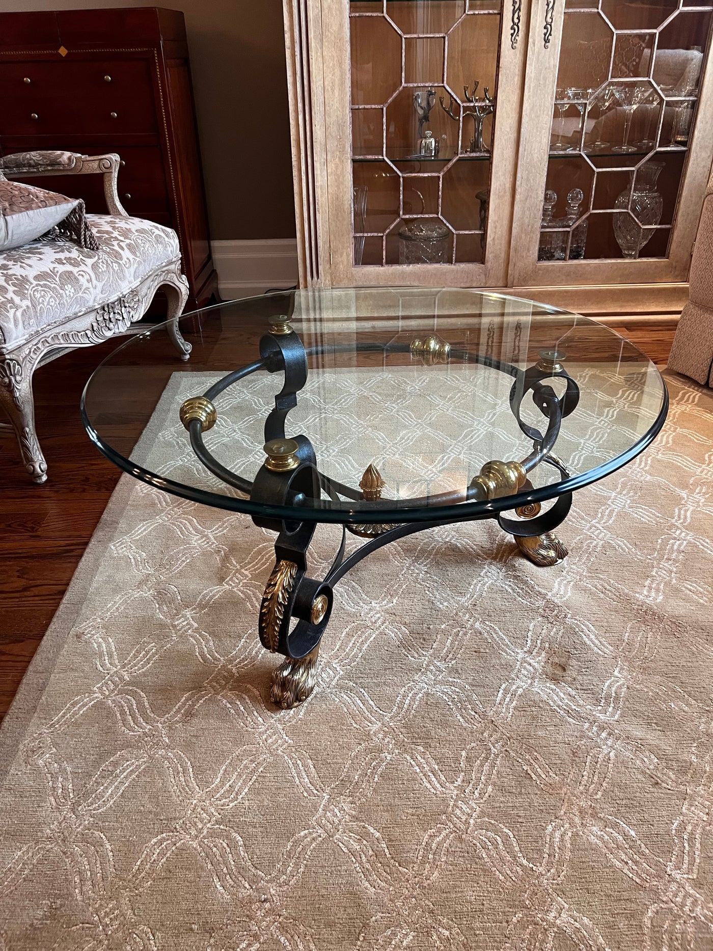 Maitland-Smith Round Glass Cocktail Table. Glass top can be removed for transport. Base is wrought iron.