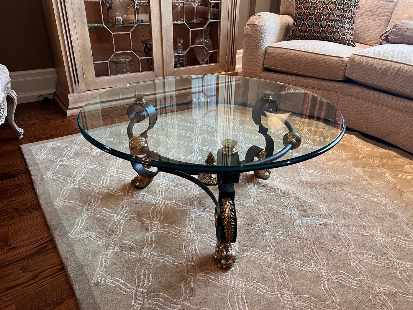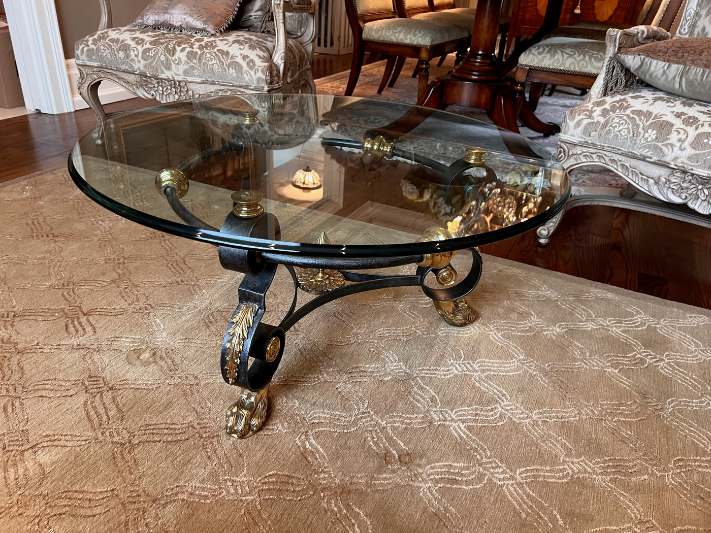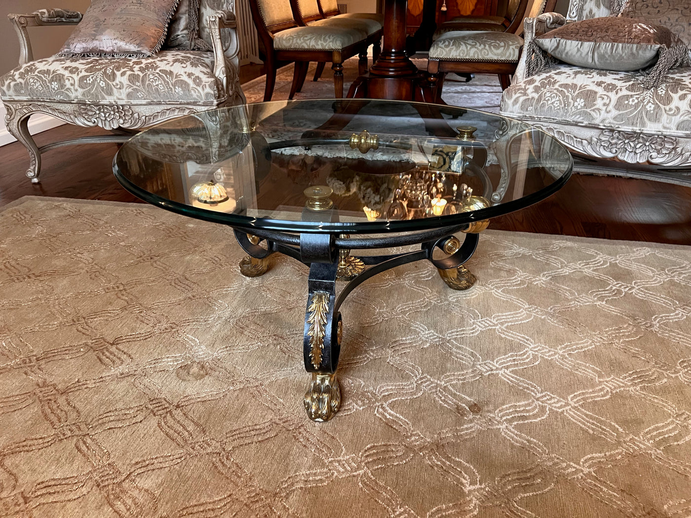 Maitland-Smith Round Glass Cocktail Table. Glass top can be removed for transport. Base is wrought iron.