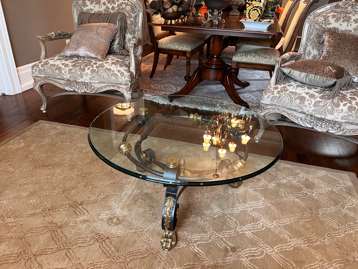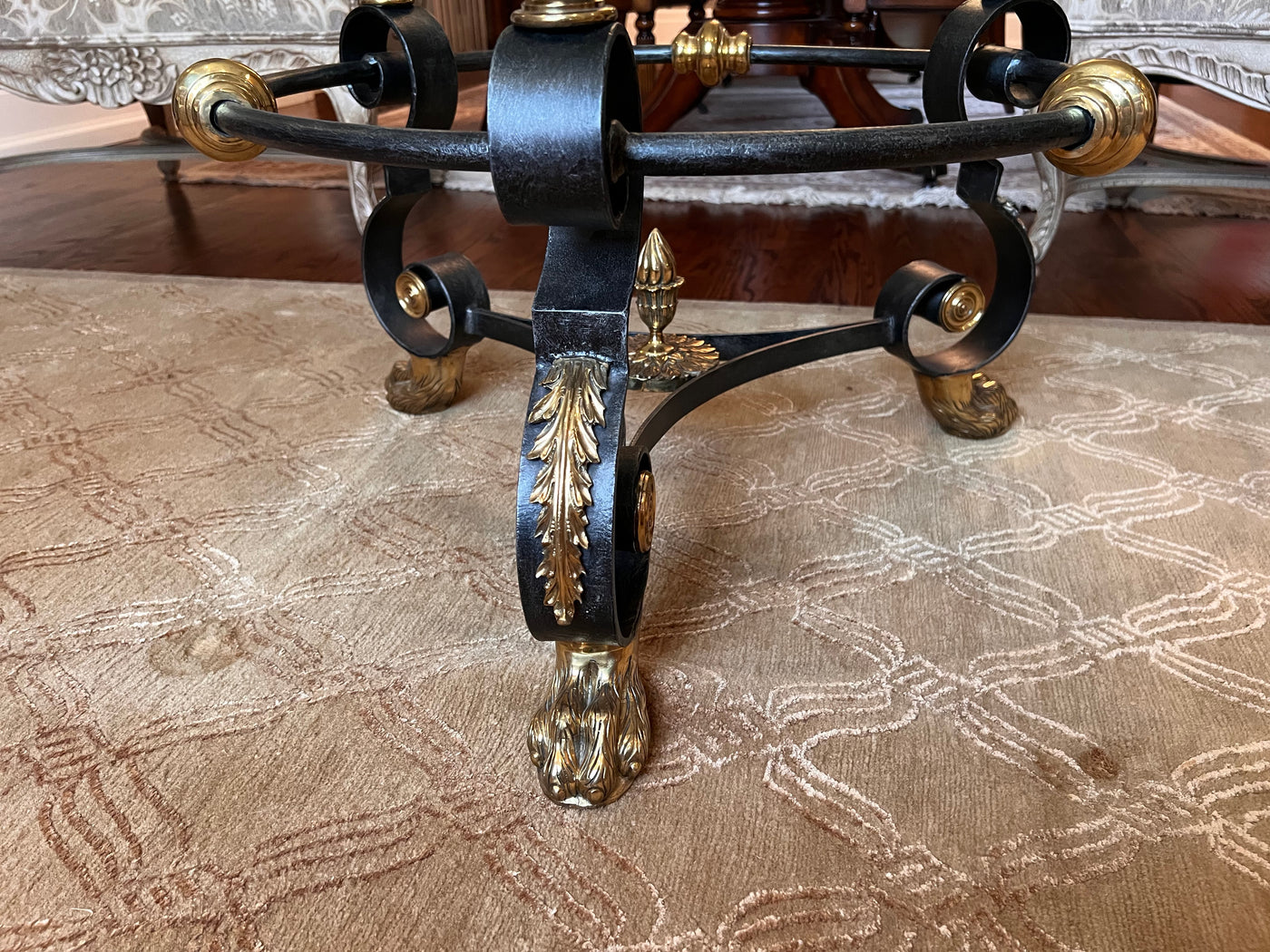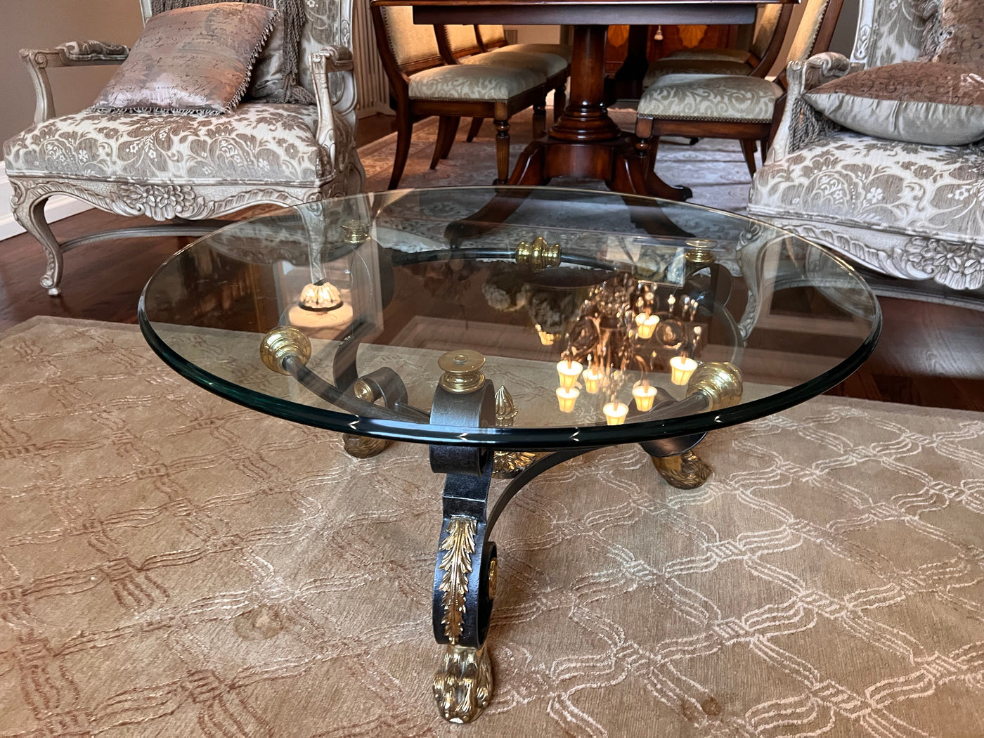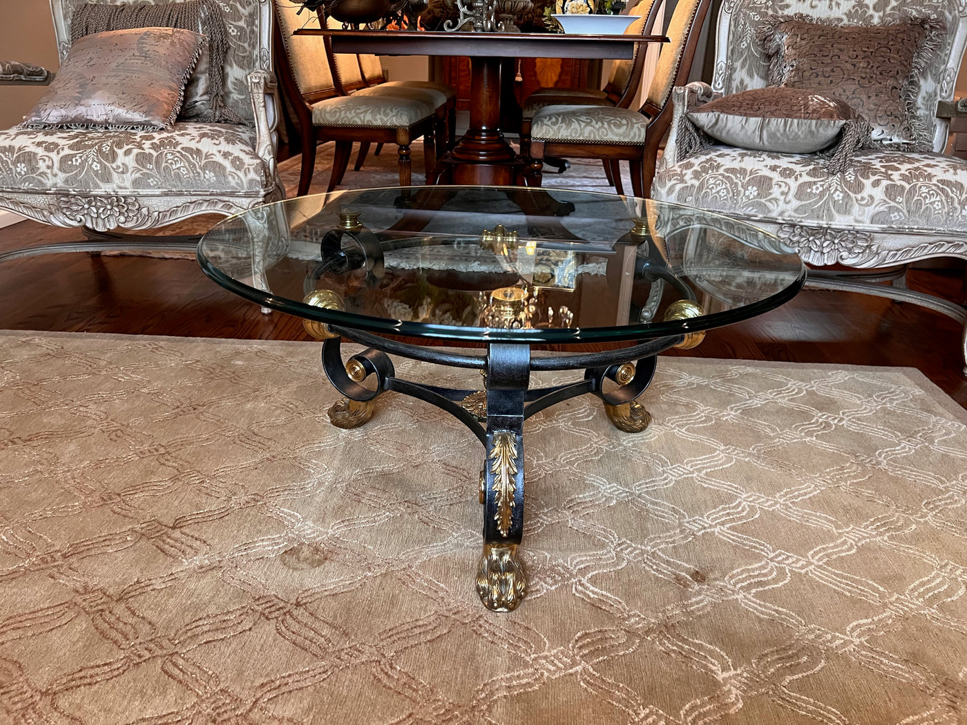 Maitland-Smith Round Glass Cocktail Table. Glass top can be removed for transport. Base is wrought iron.