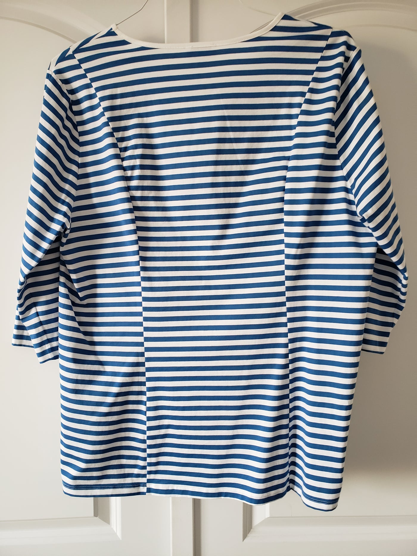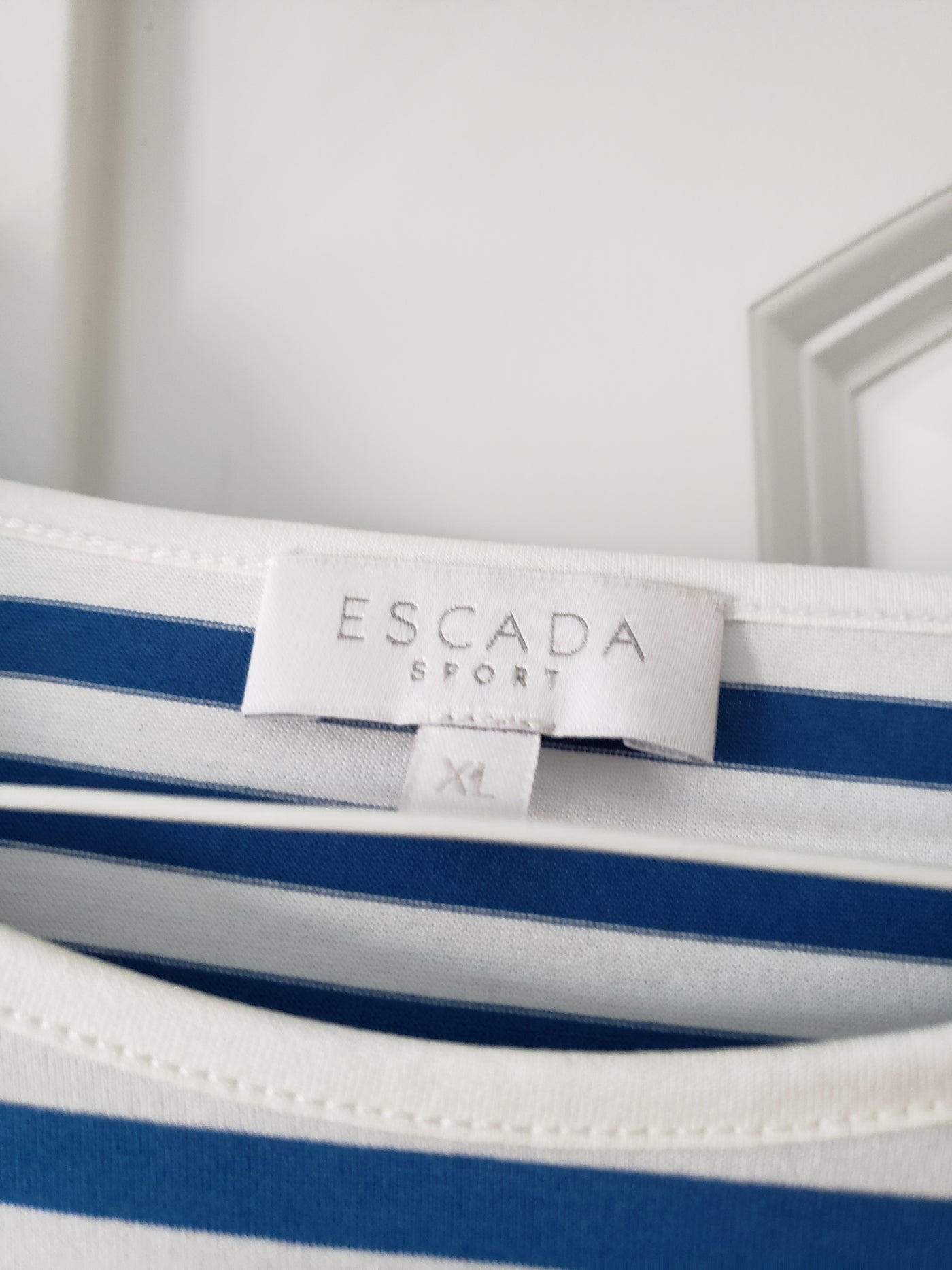 Escada Blue and White Short Sleeved Top. Brand new, blue and cream striped spring/summer elegant top.