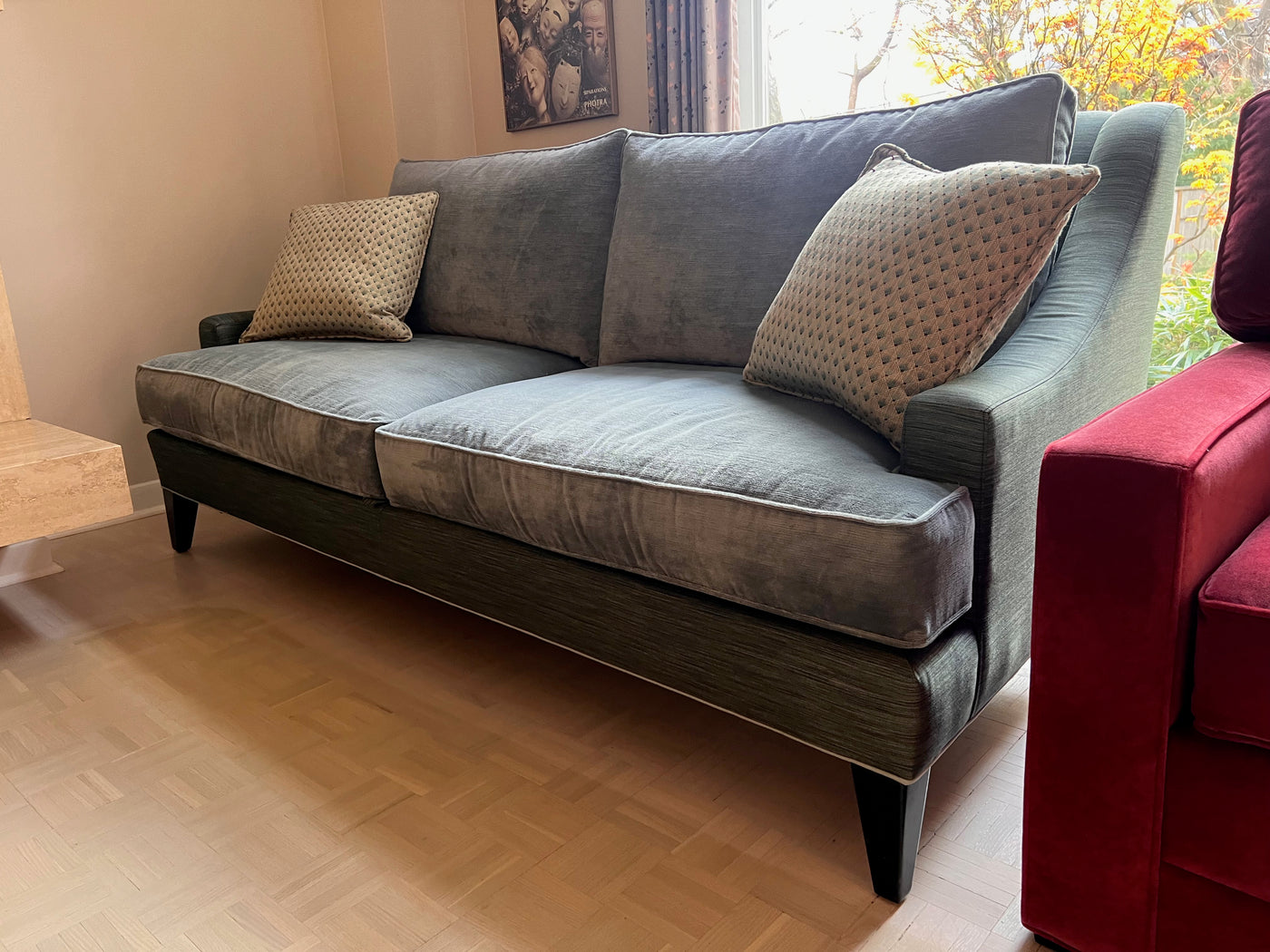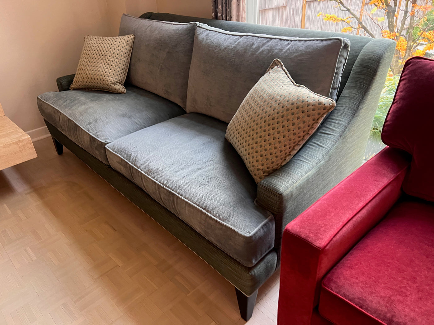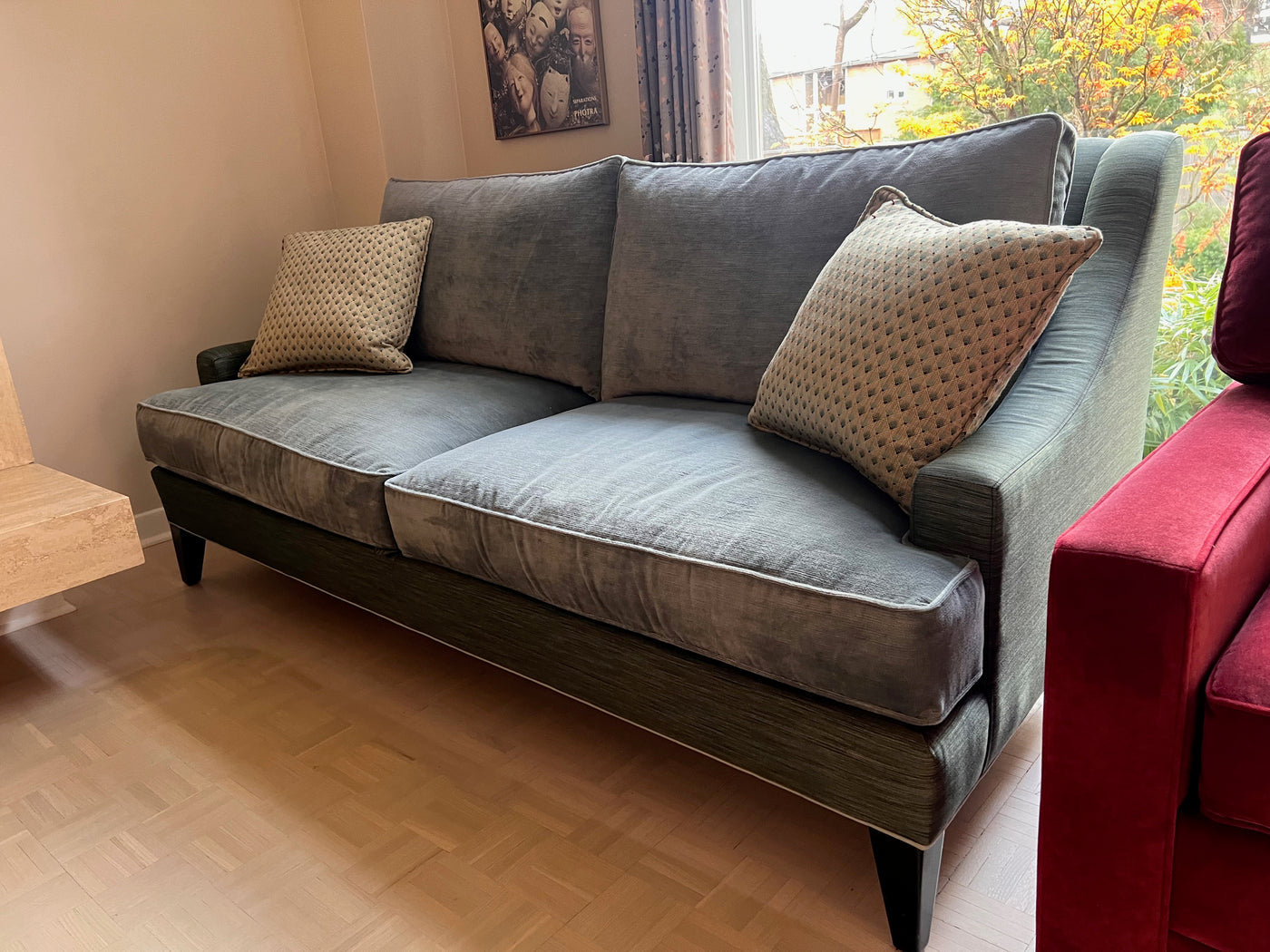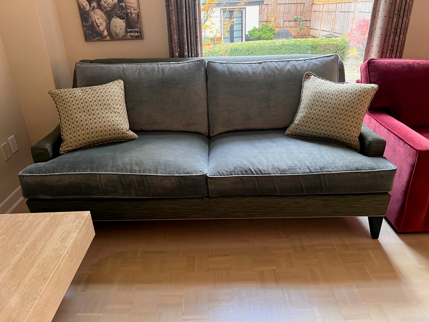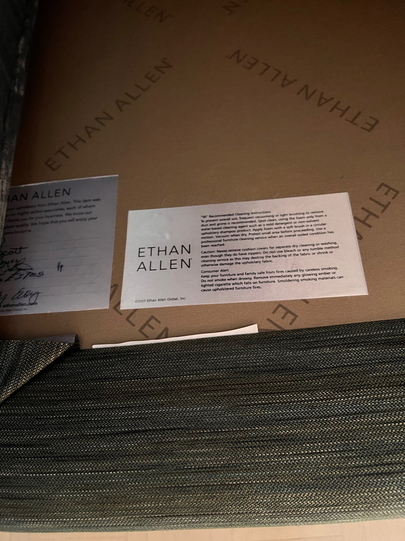 Ethan Allen Grey/Green Sofa (*retail $3800). Please note the design of the cushions are slightly different than the frame of the sofa-- this is intentional.