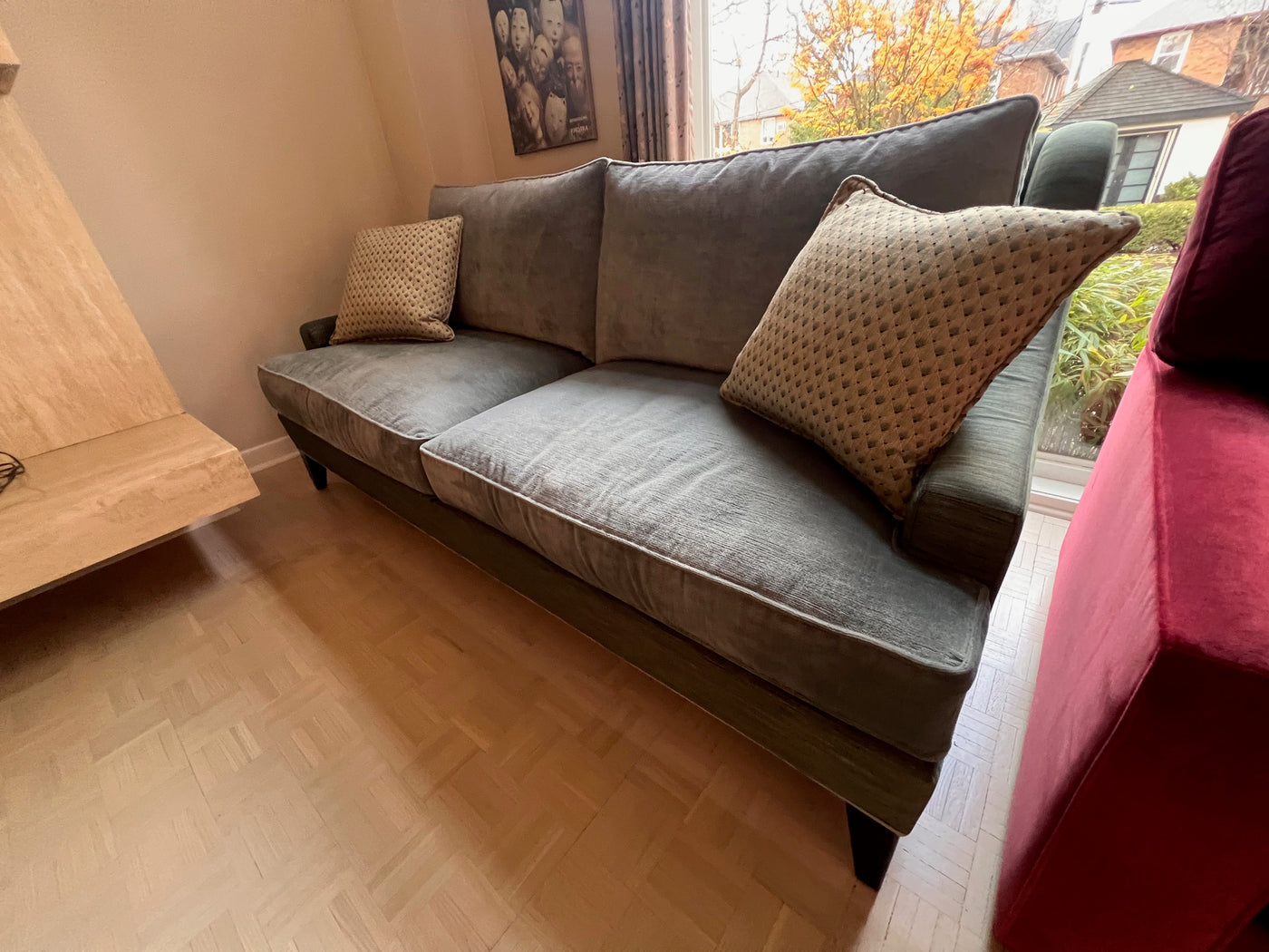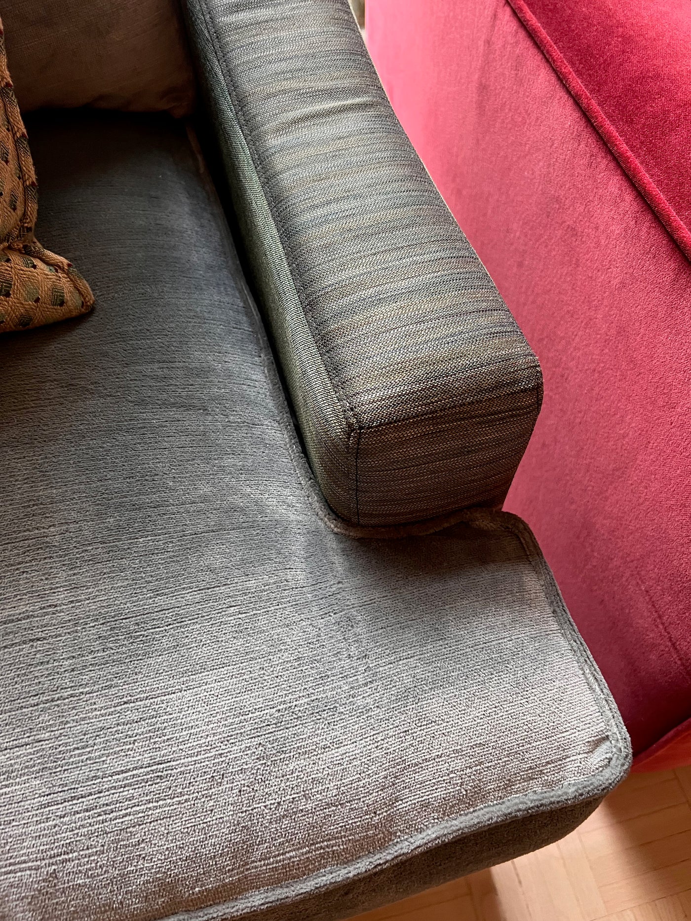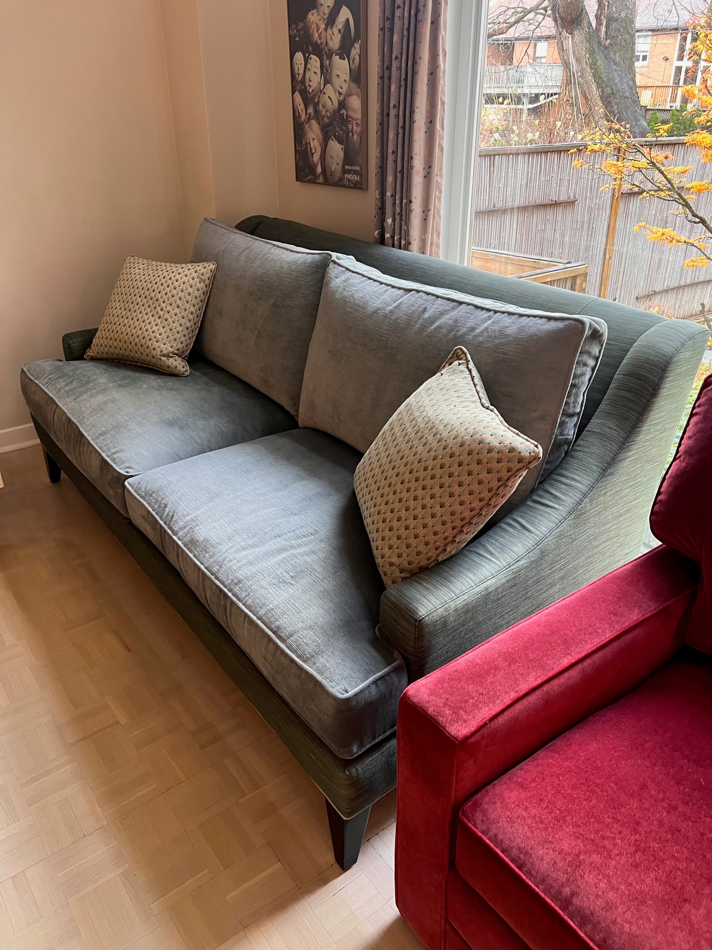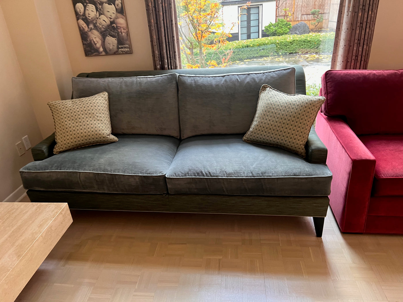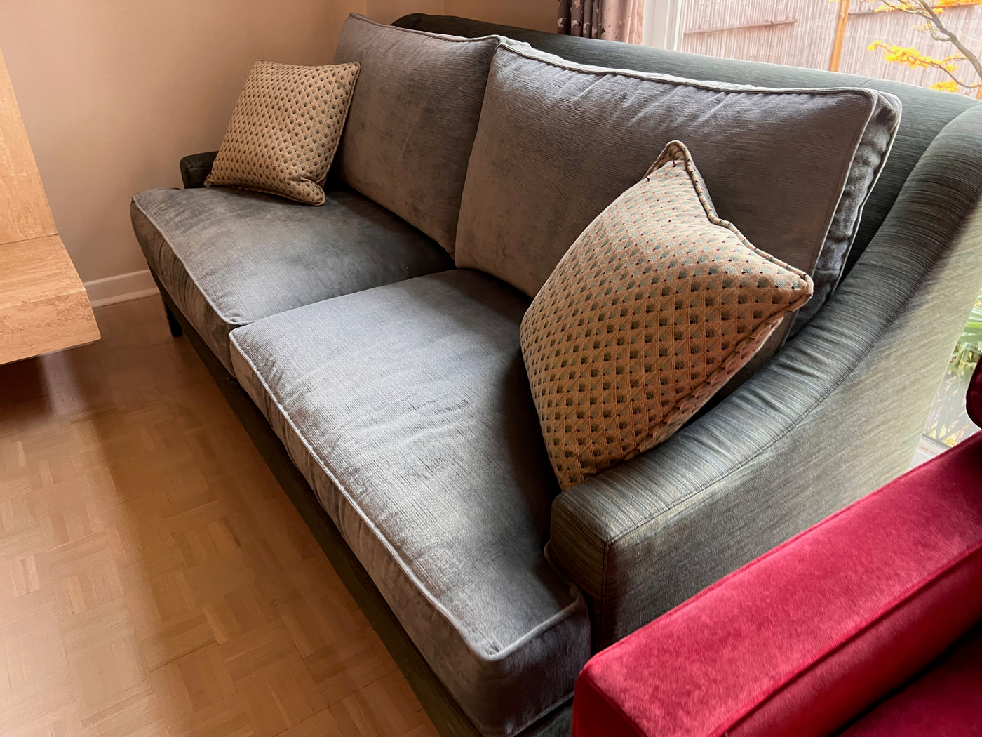 Ethan Allen Grey/Green Sofa (*retail $3800). Please note the design of the cushions are slightly different than the frame of the sofa-- this is intentional.