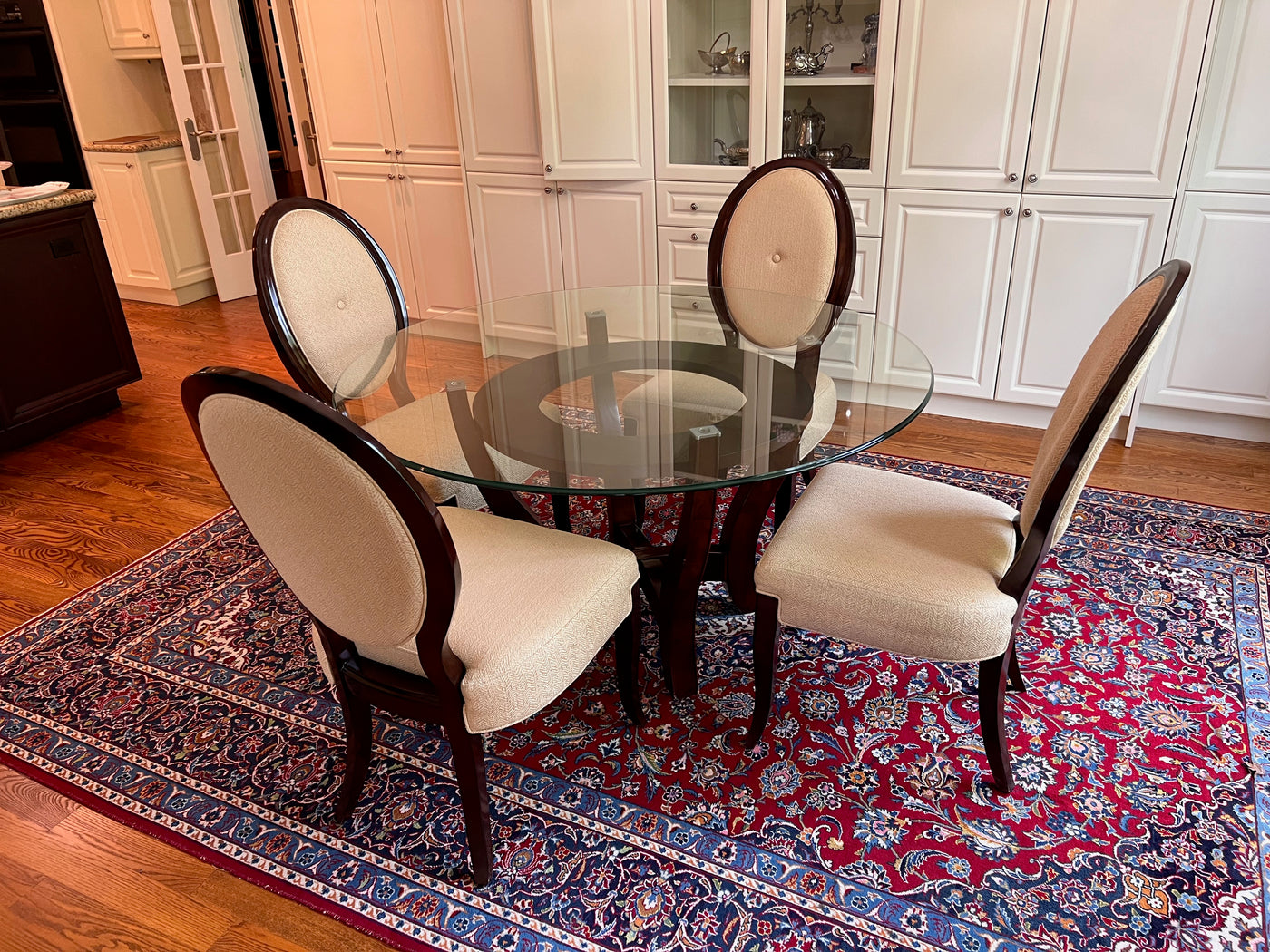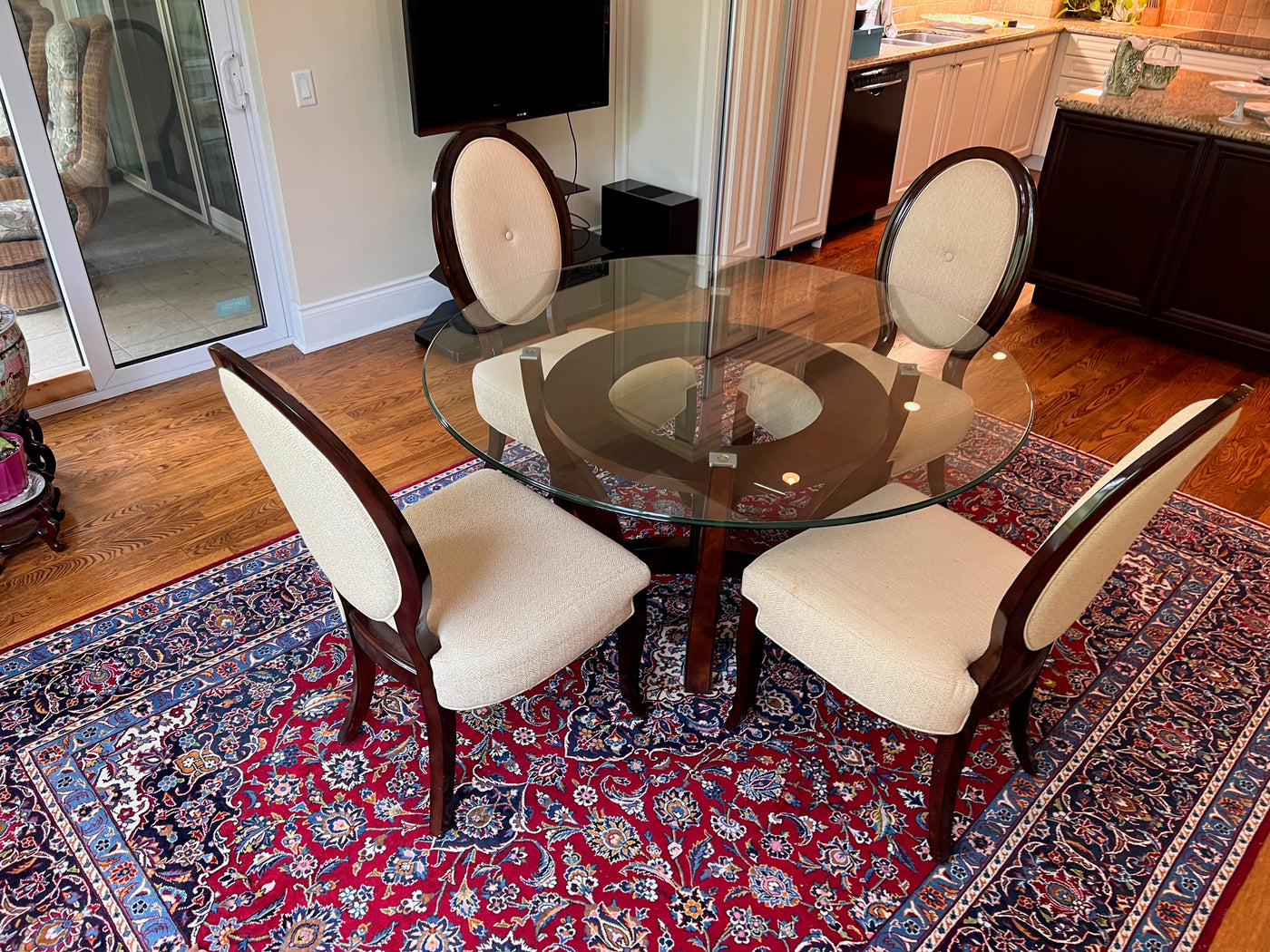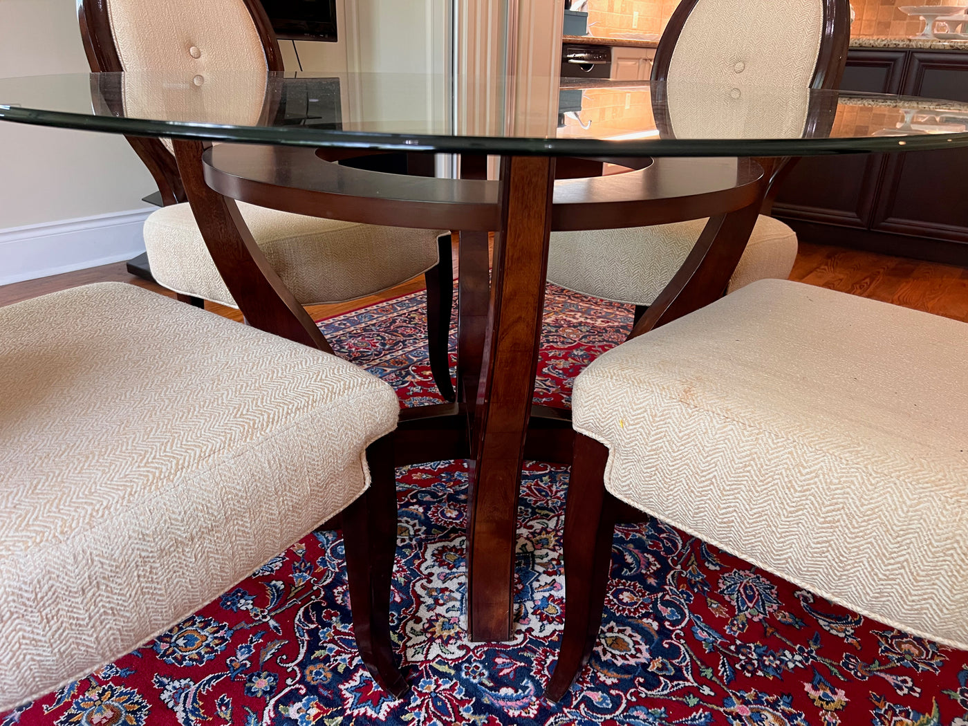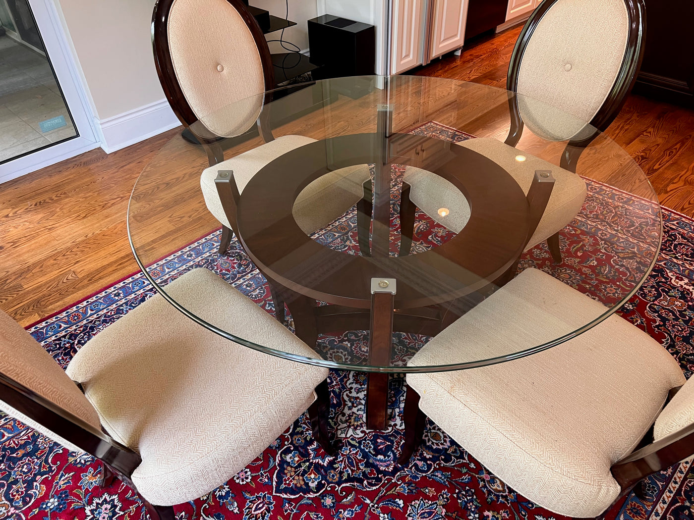 Round Glass Dining Table + 4 Schnadig Chairs. Table is in good condition however a few chairs do have some minor stains.