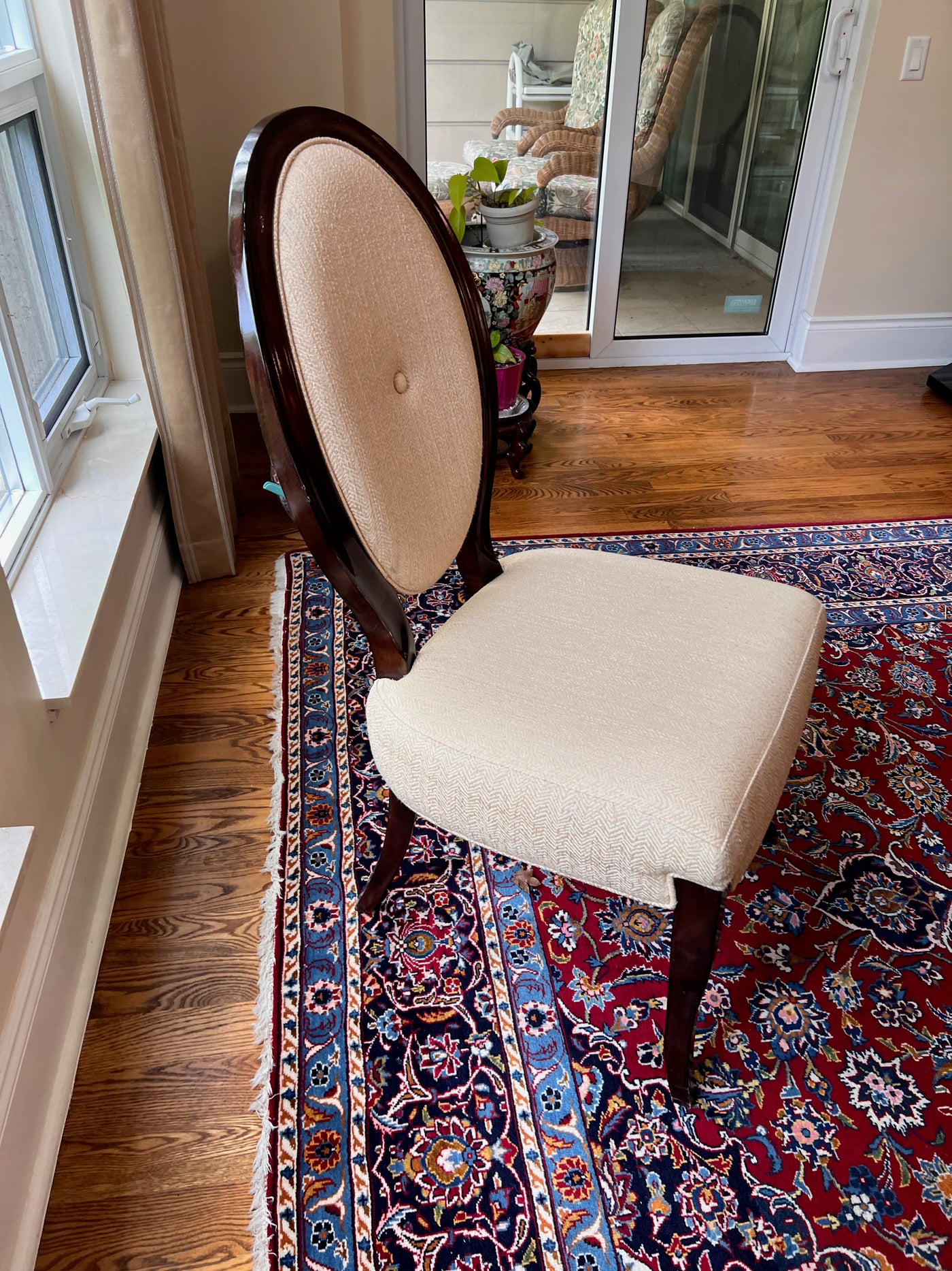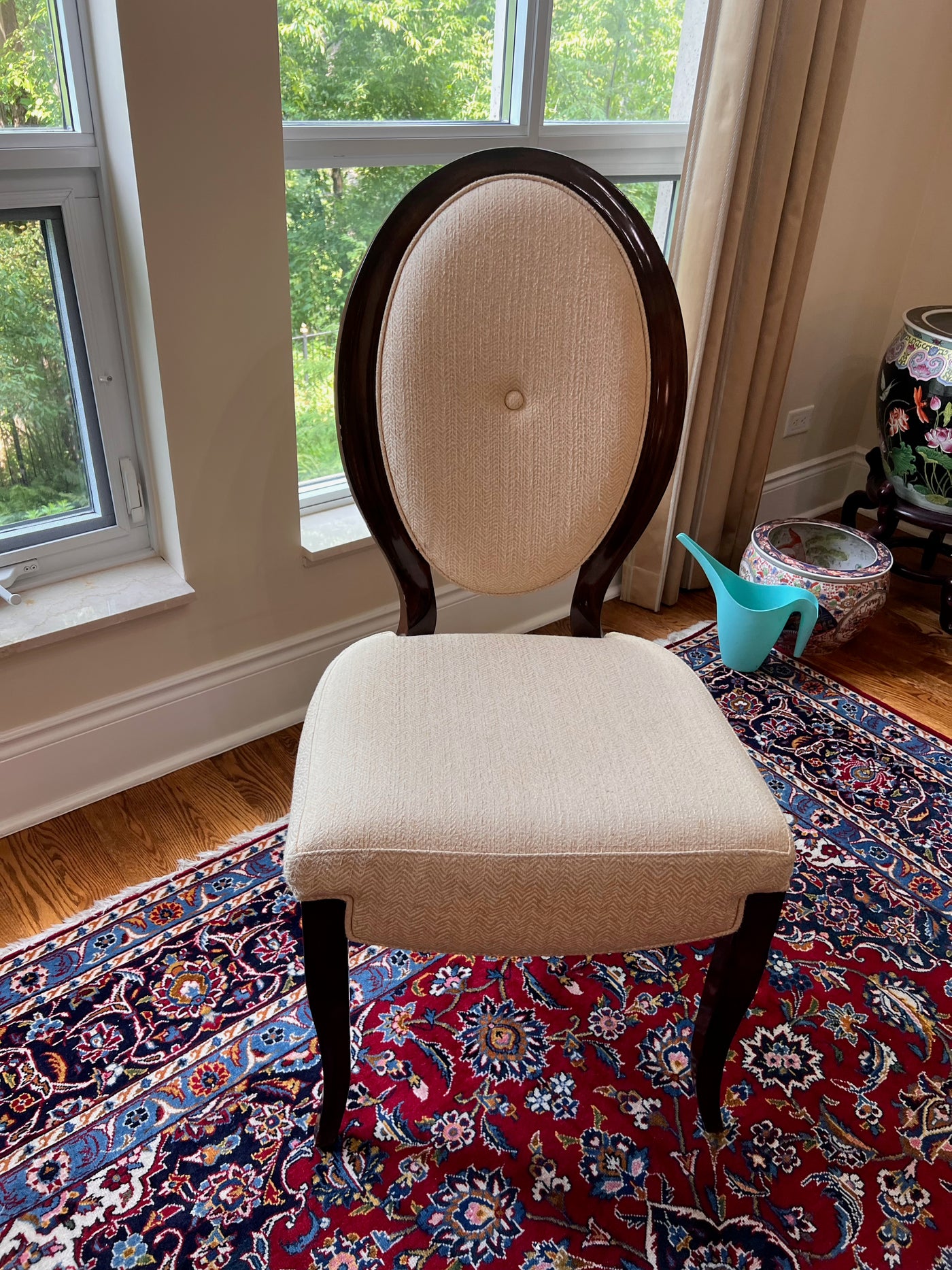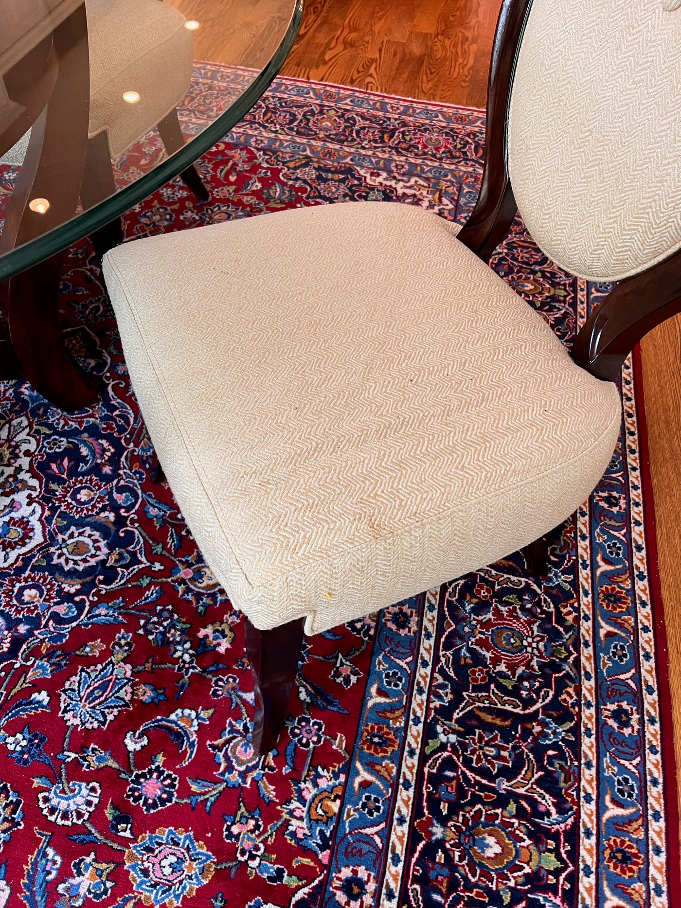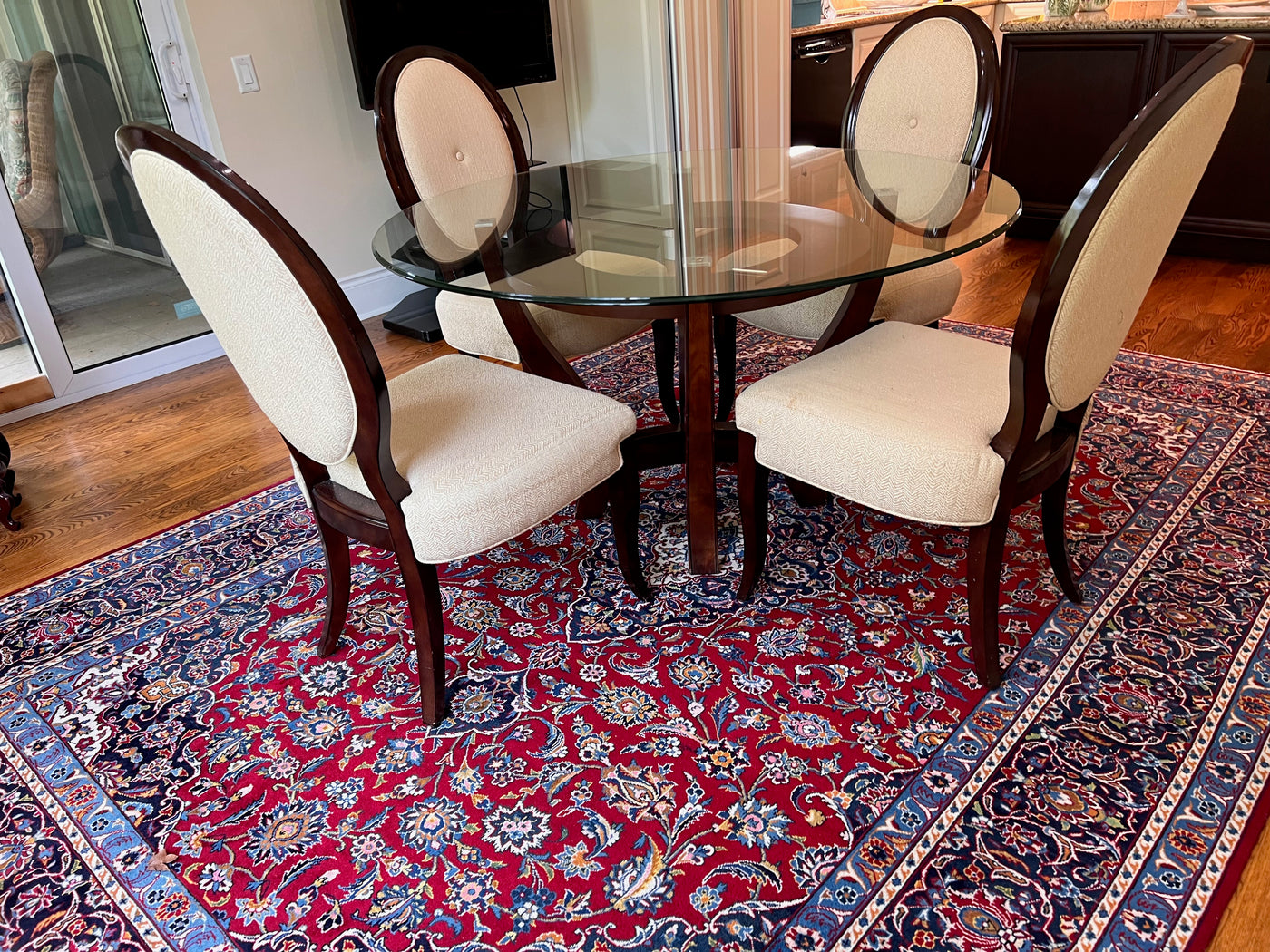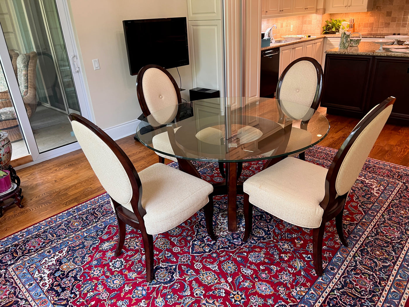 Round Glass Dining Table + 4 Schnadig Chairs. Table is in good condition however a few chairs do have some minor stains.