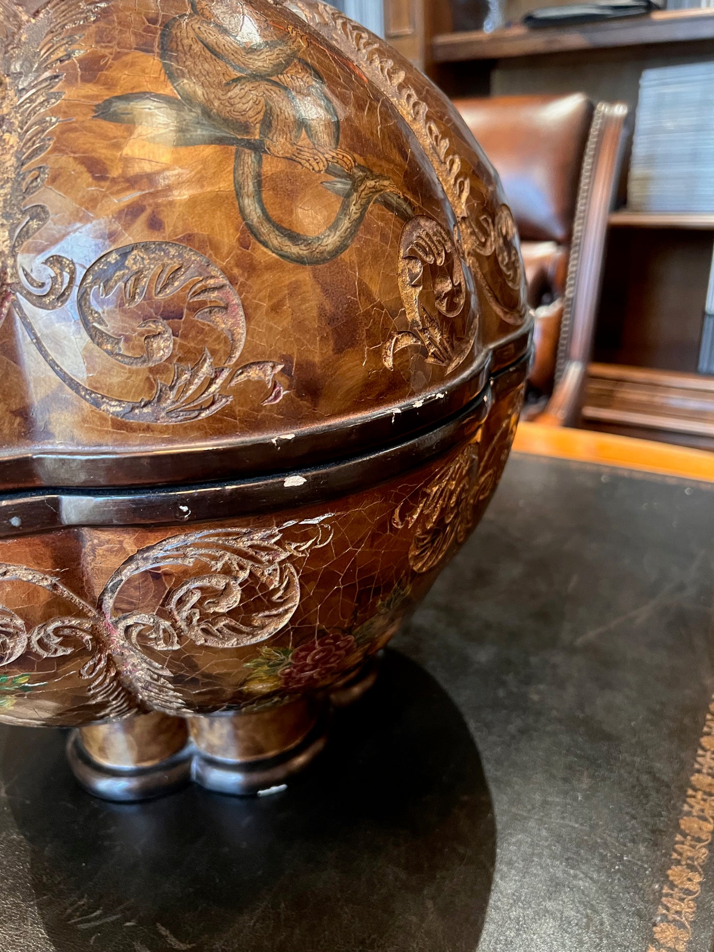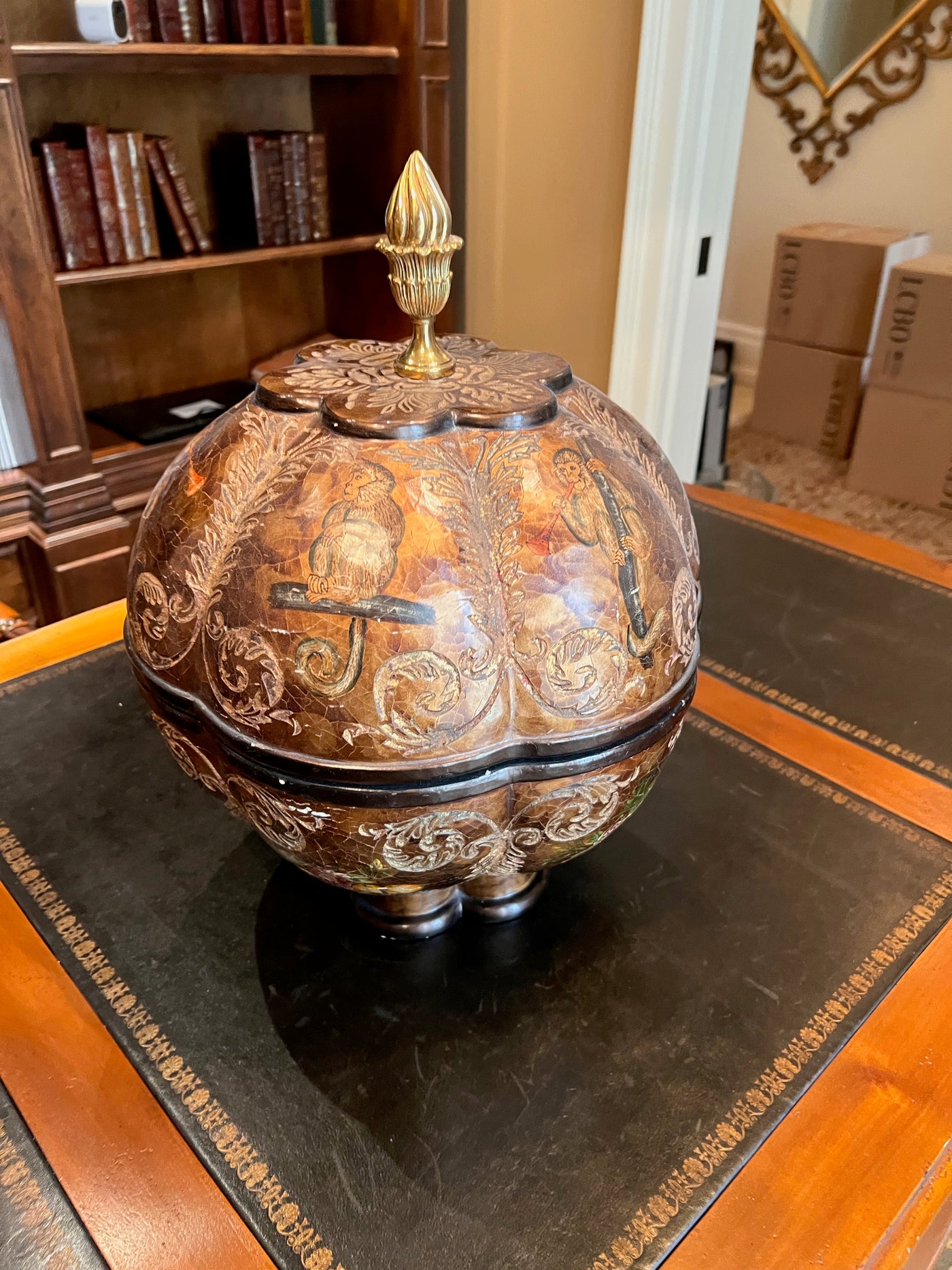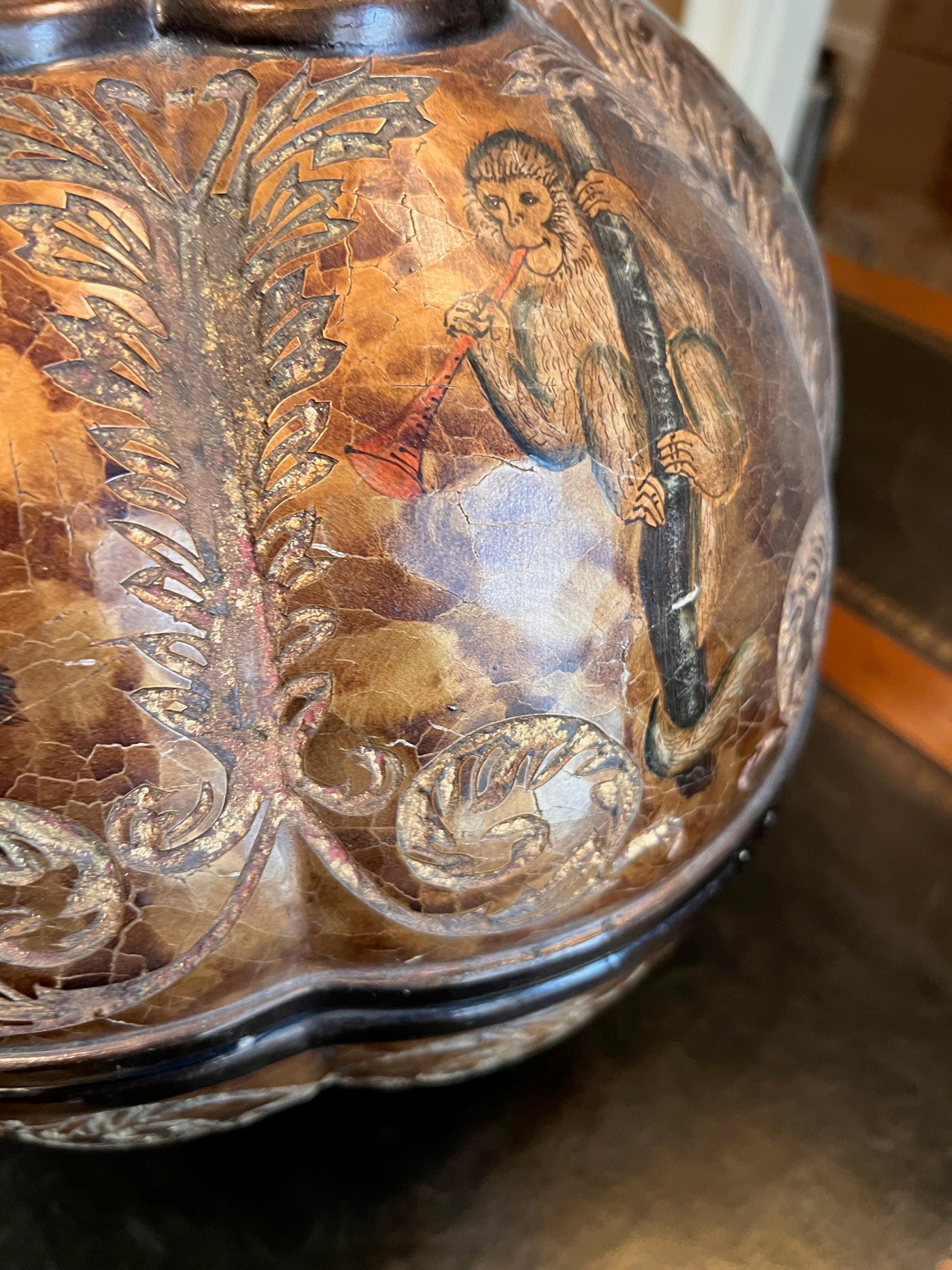 Maitland Smith Round Lidded Box with Painted Monkey Motif. There is a "crackling" style throughout that is intention and NOT damaged.