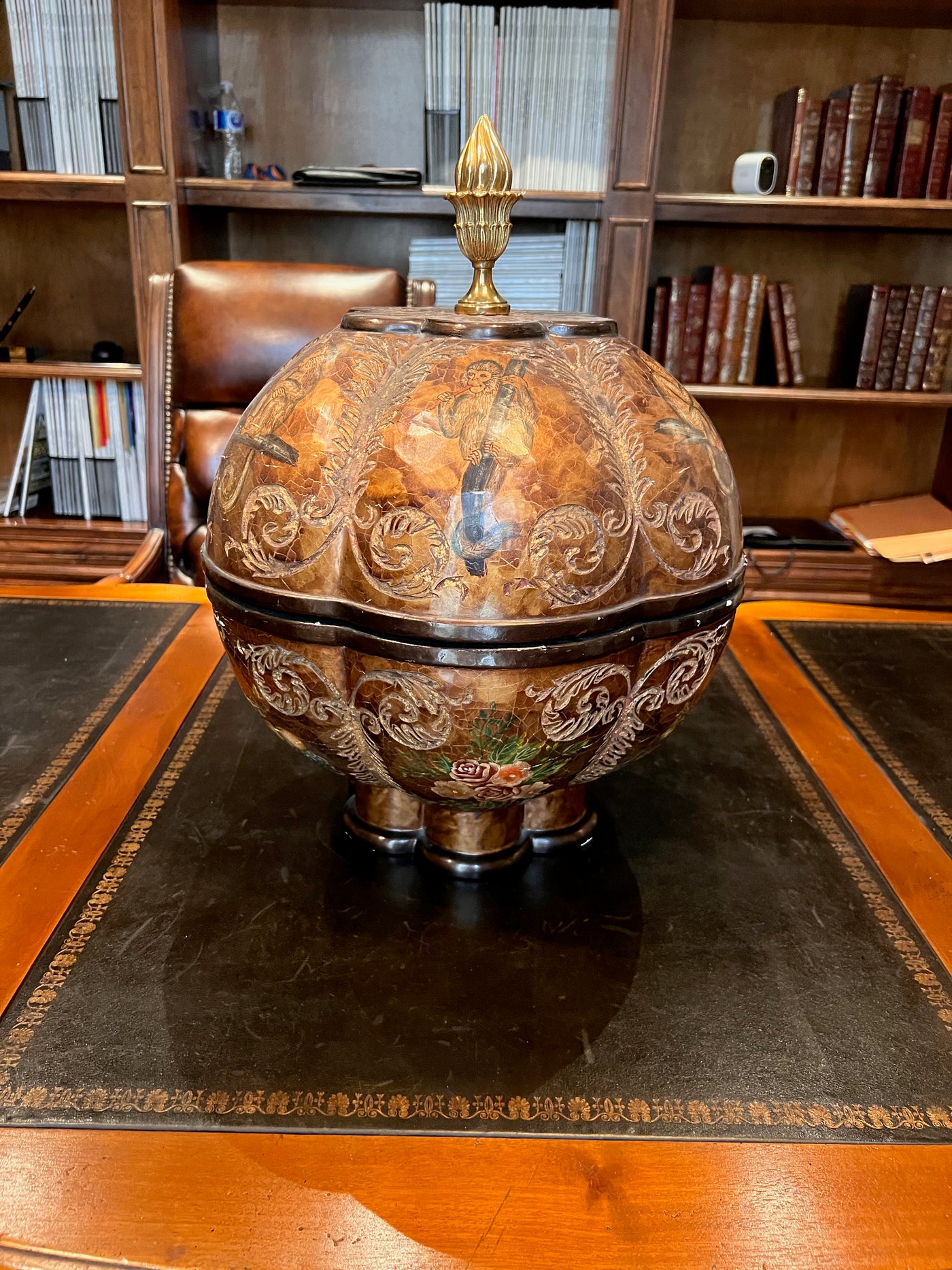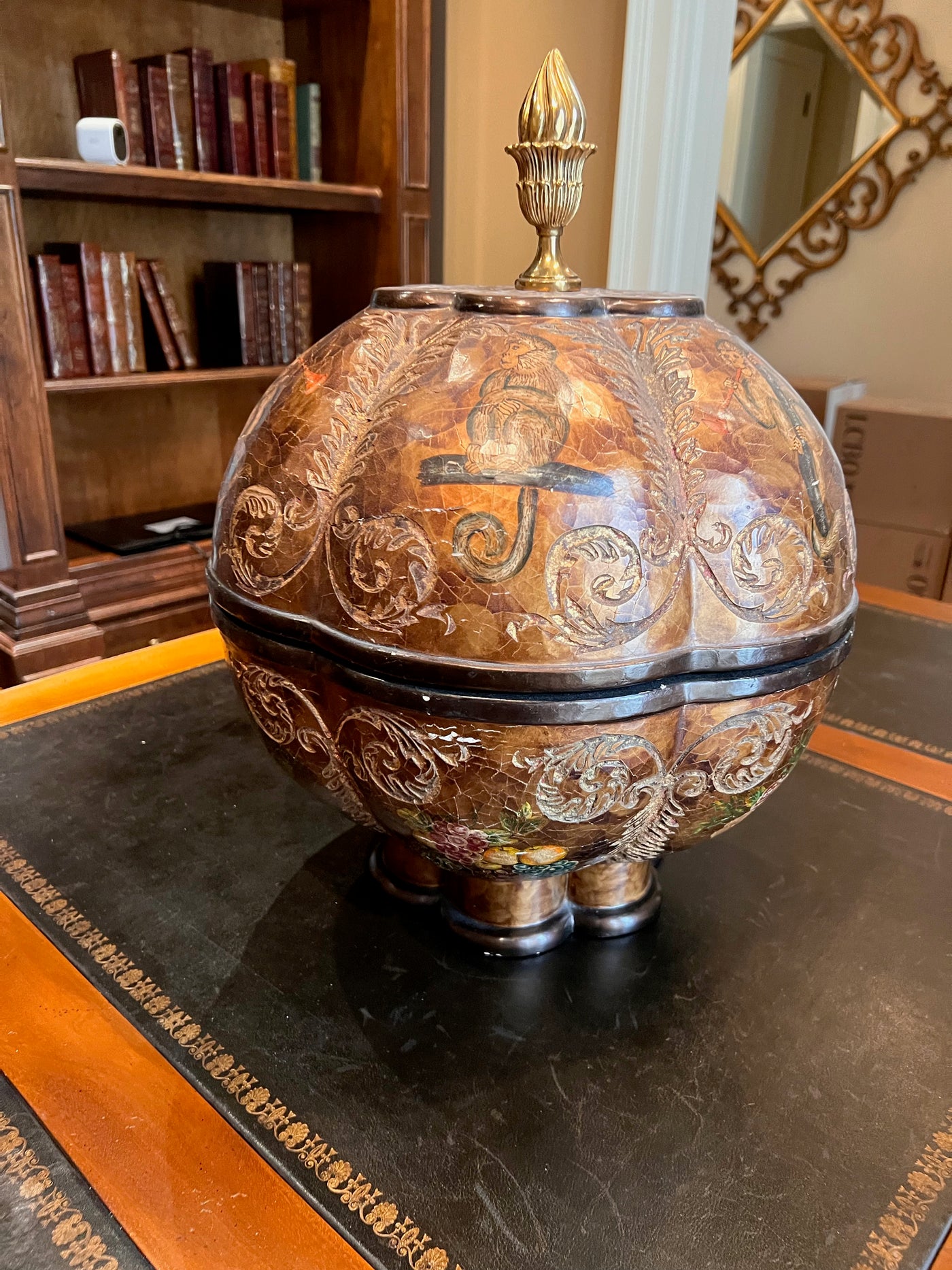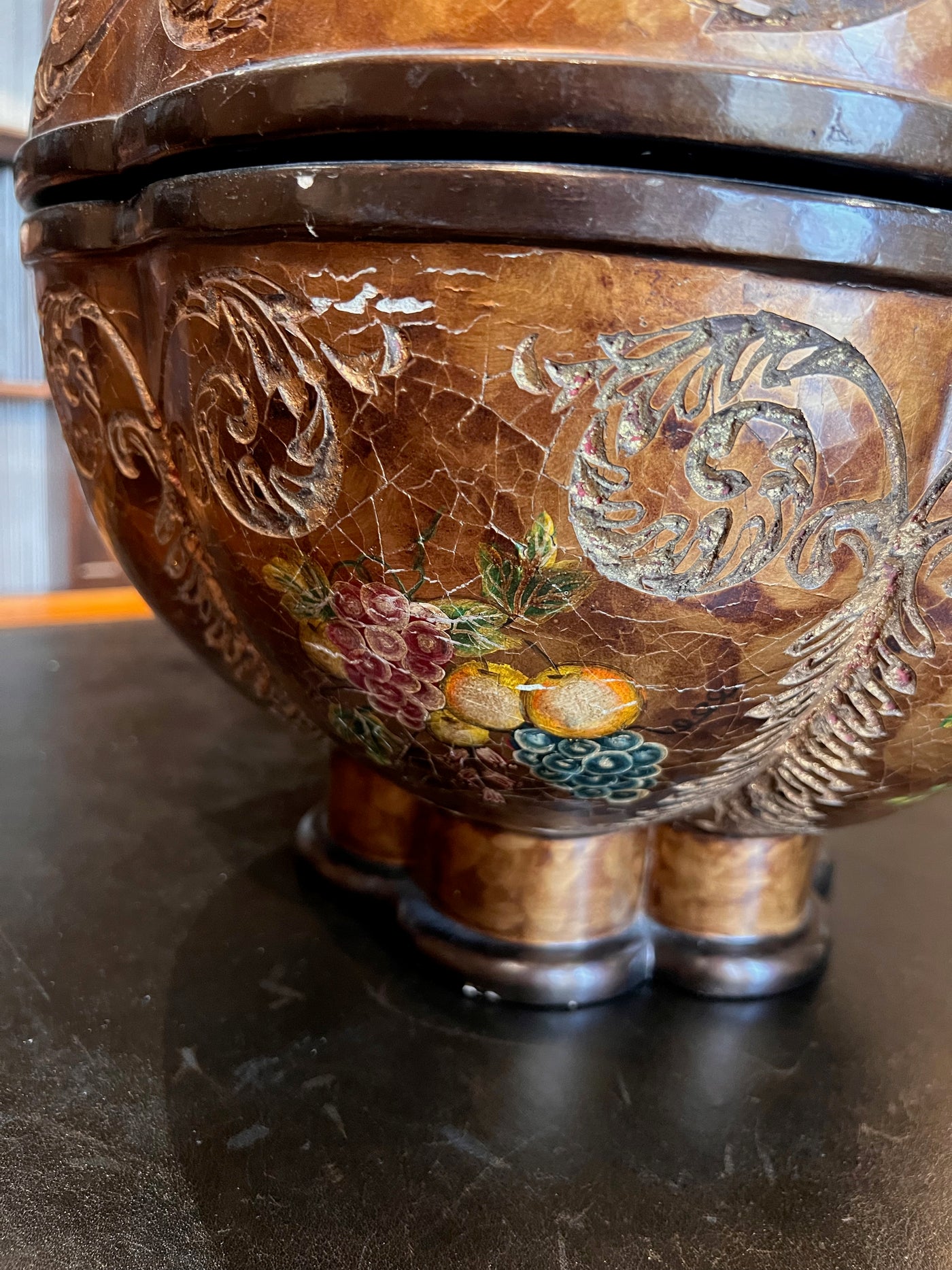 Maitland Smith Round Lidded Box with Painted Monkey Motif. There is a "crackling" style throughout that is intention and NOT damaged.