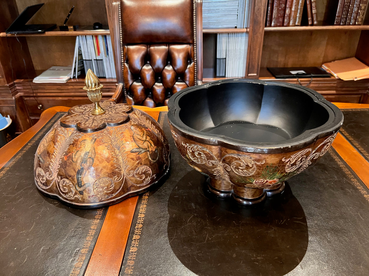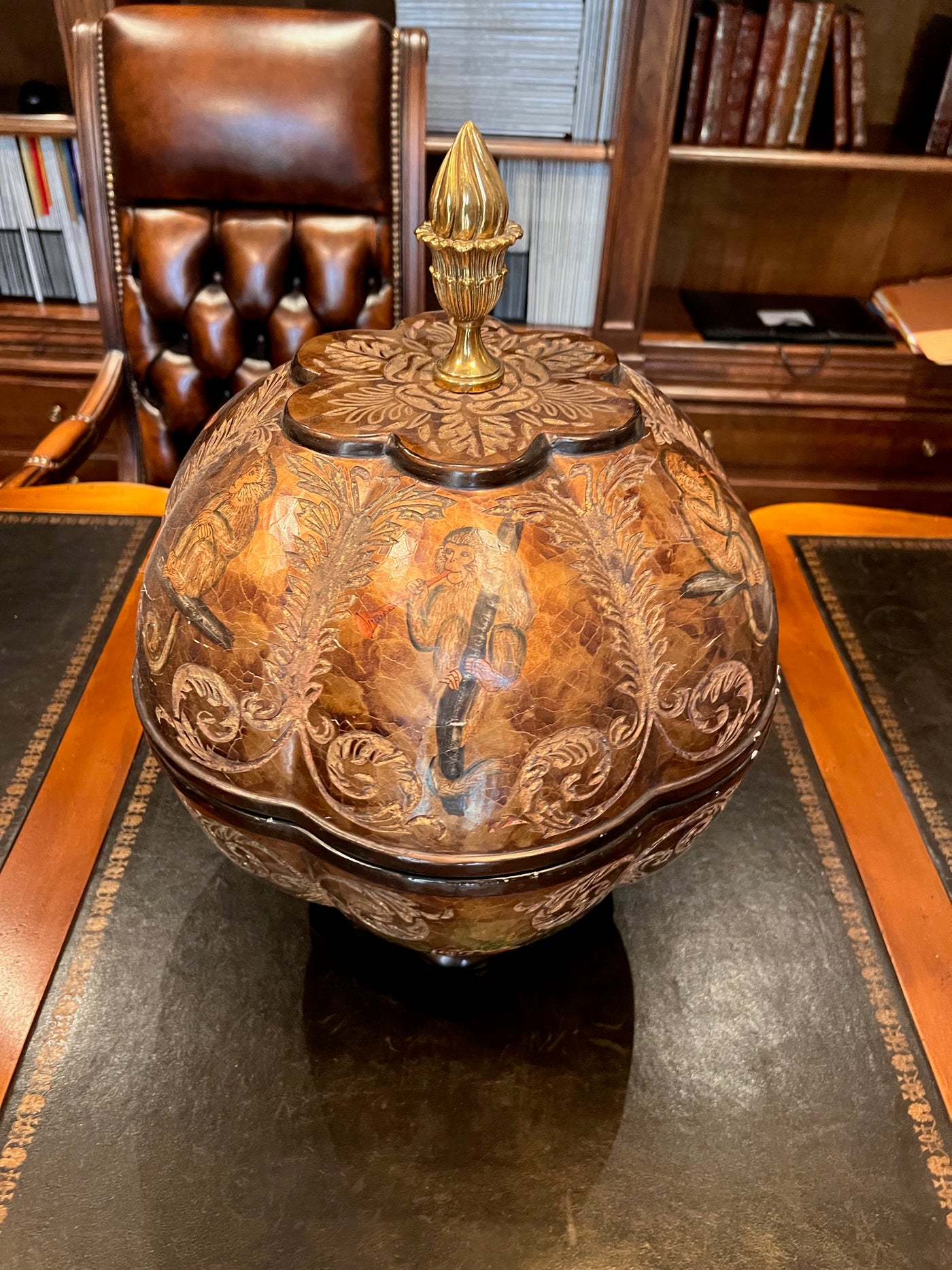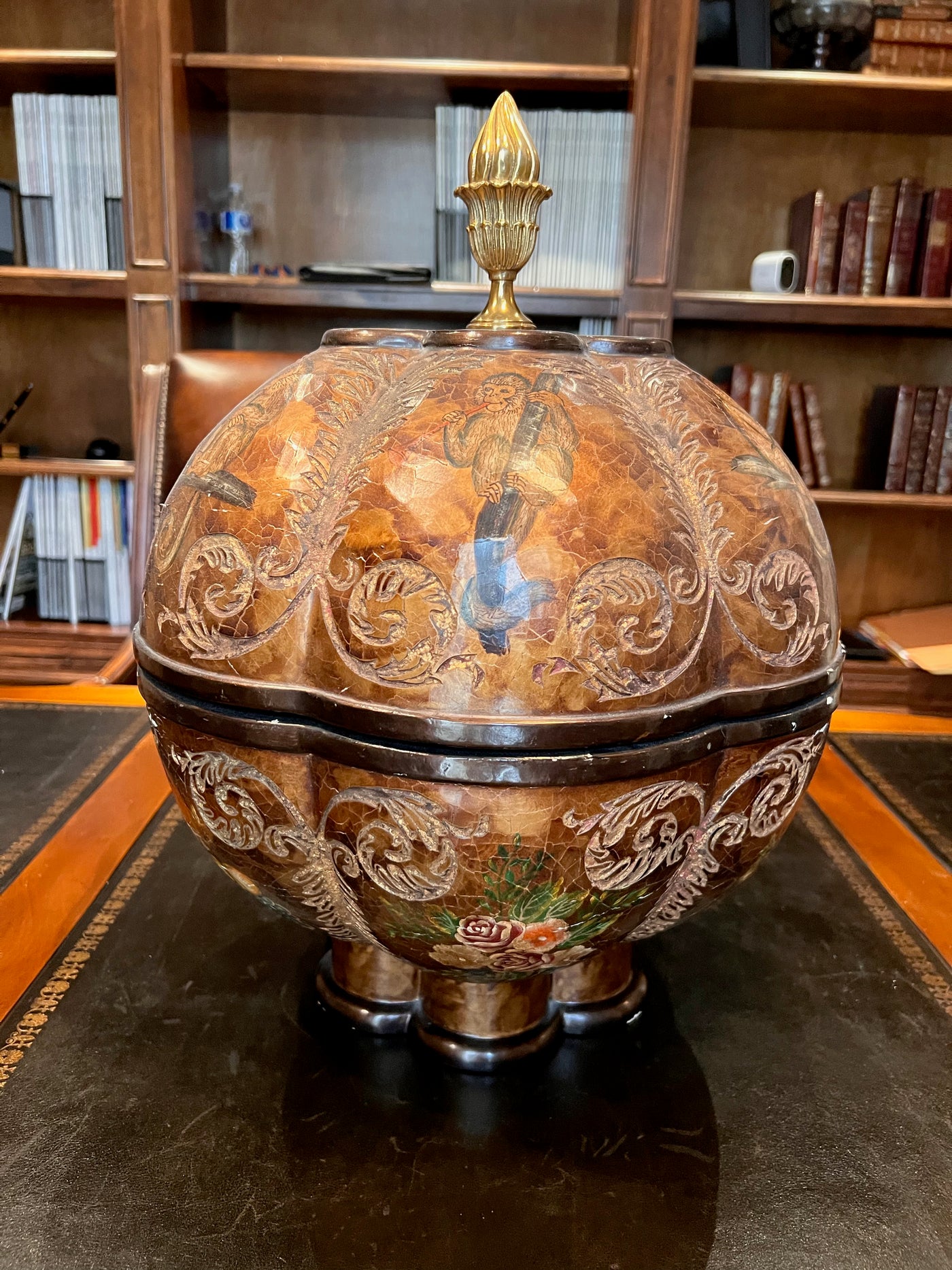 Maitland Smith Round Lidded Box with Painted Monkey Motif