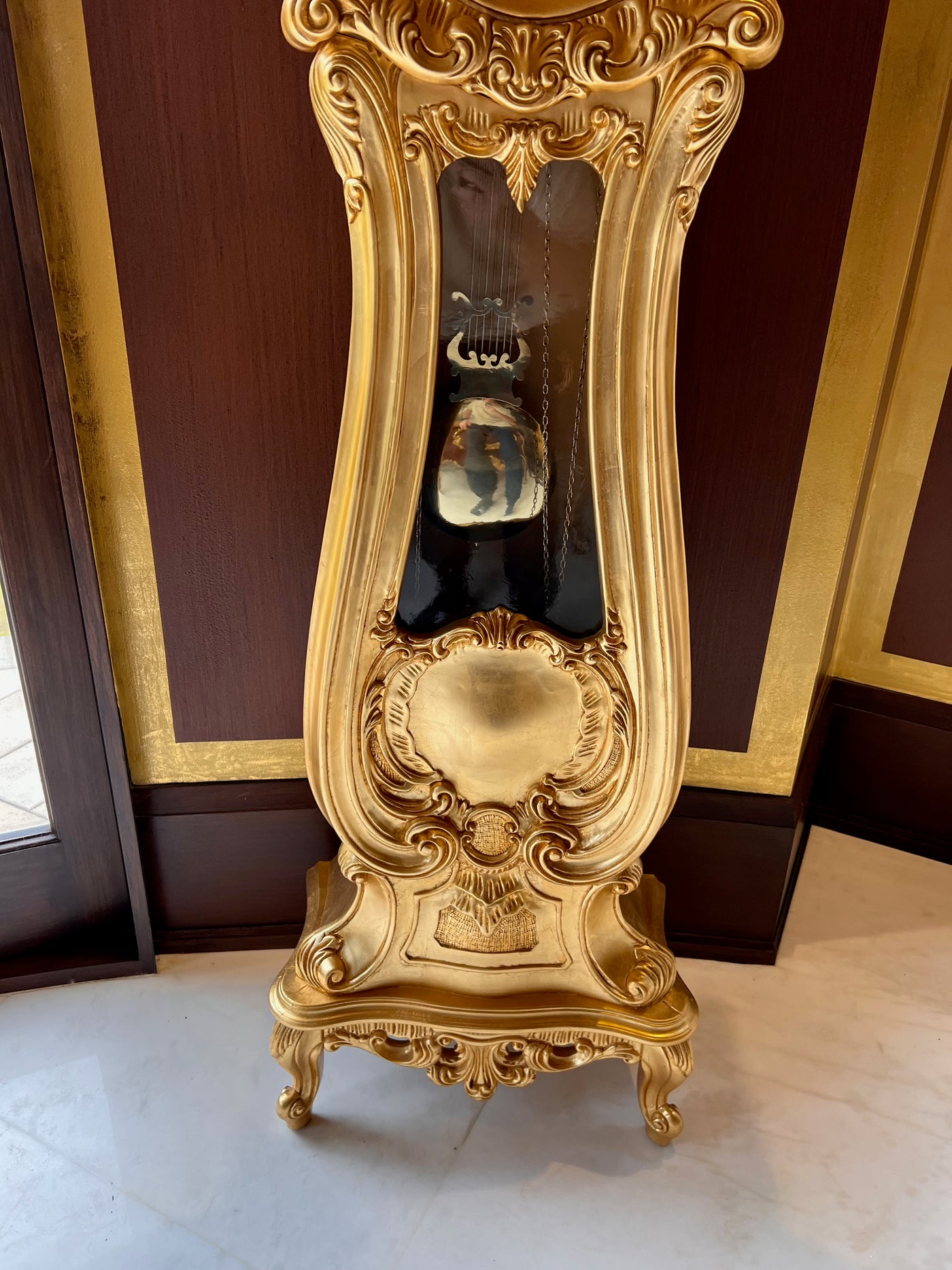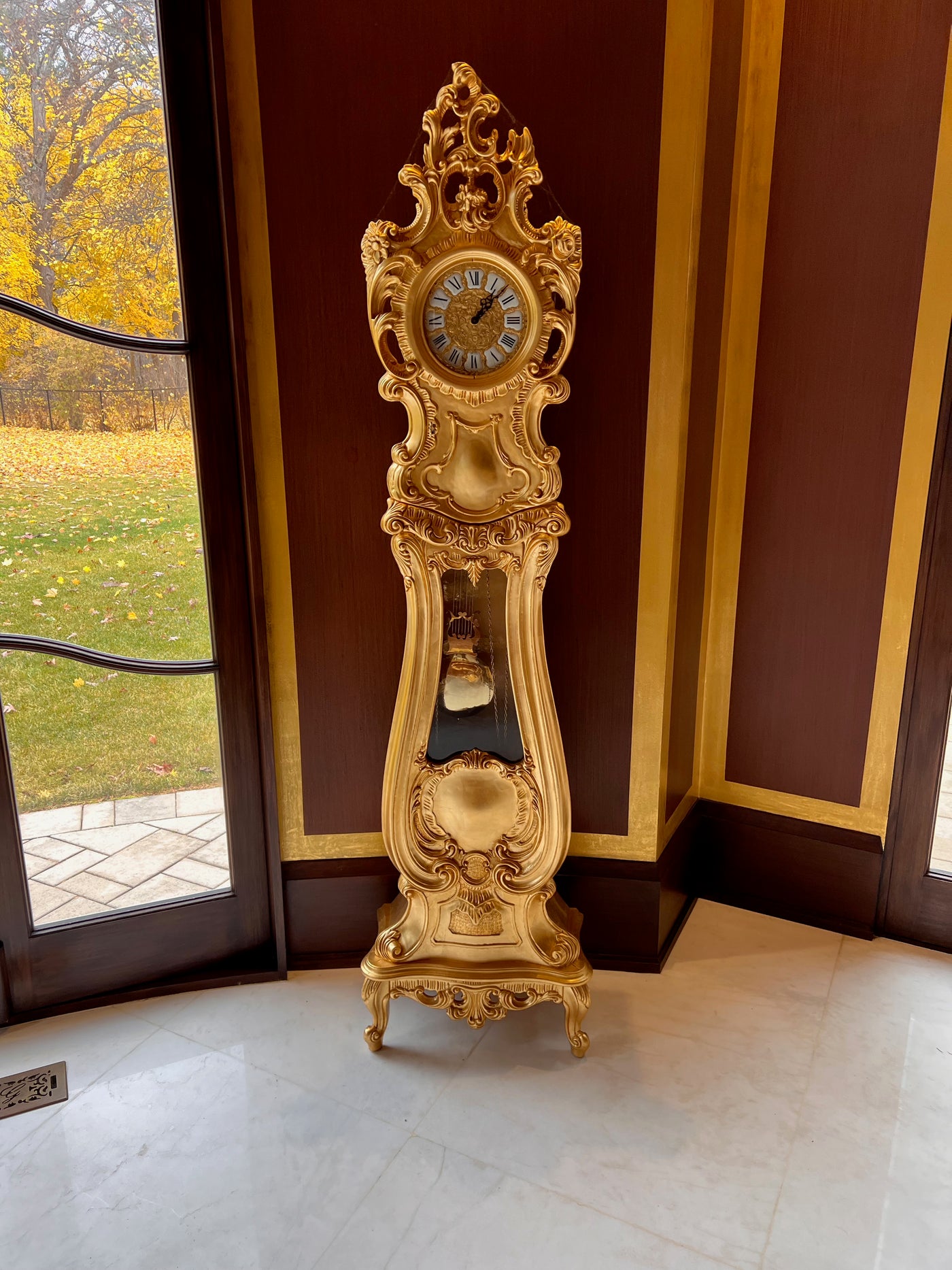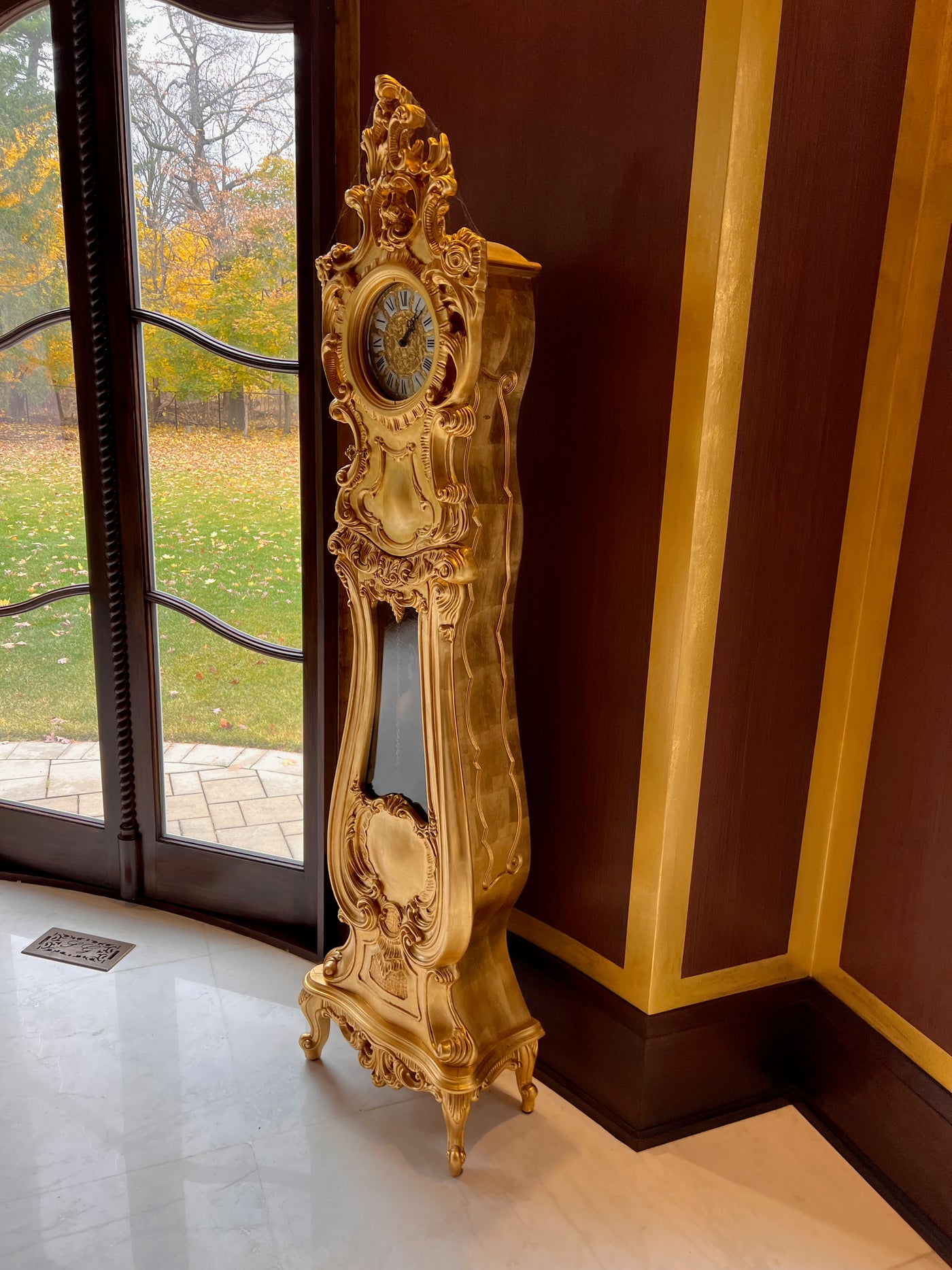 Modenese Gastone Gold Grandfather Clock, Wood with Gold Leaf Finishing, Made In Italy.
