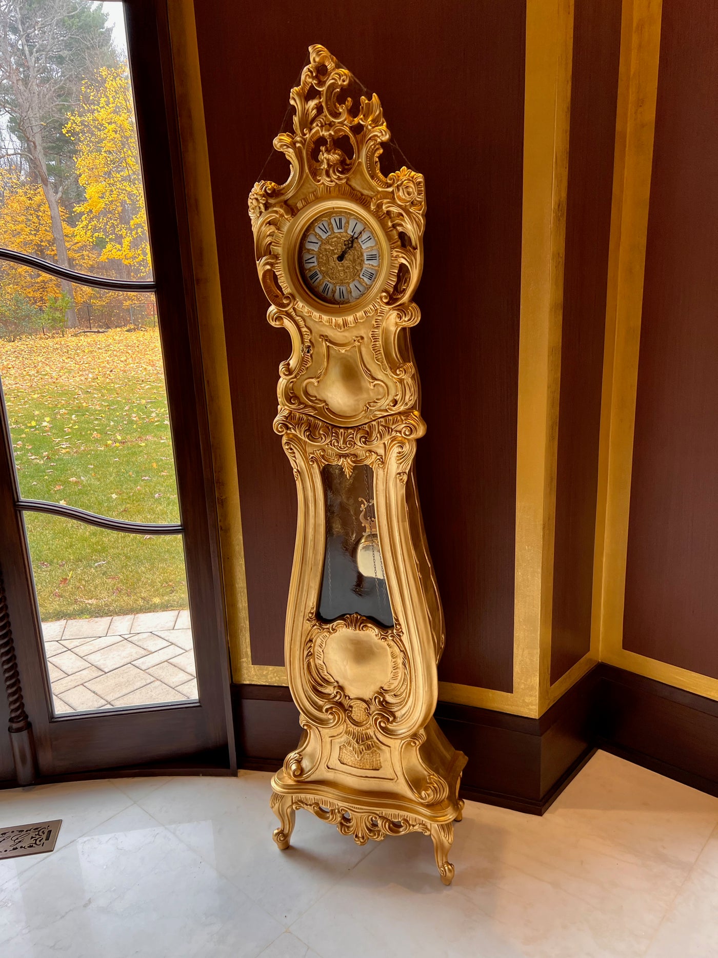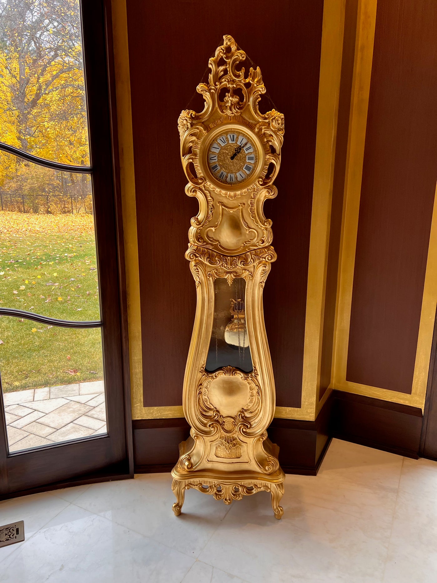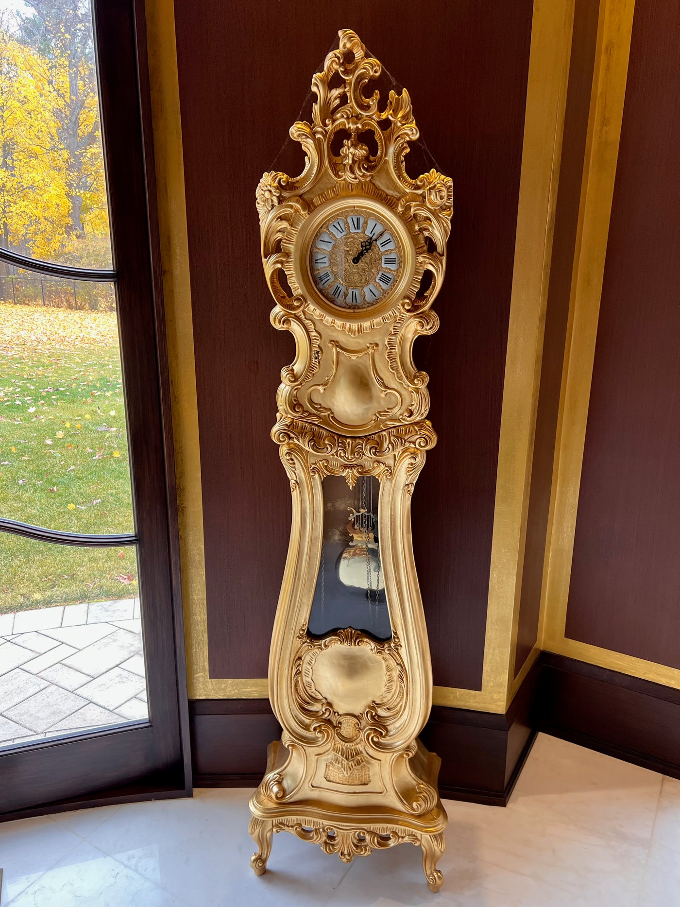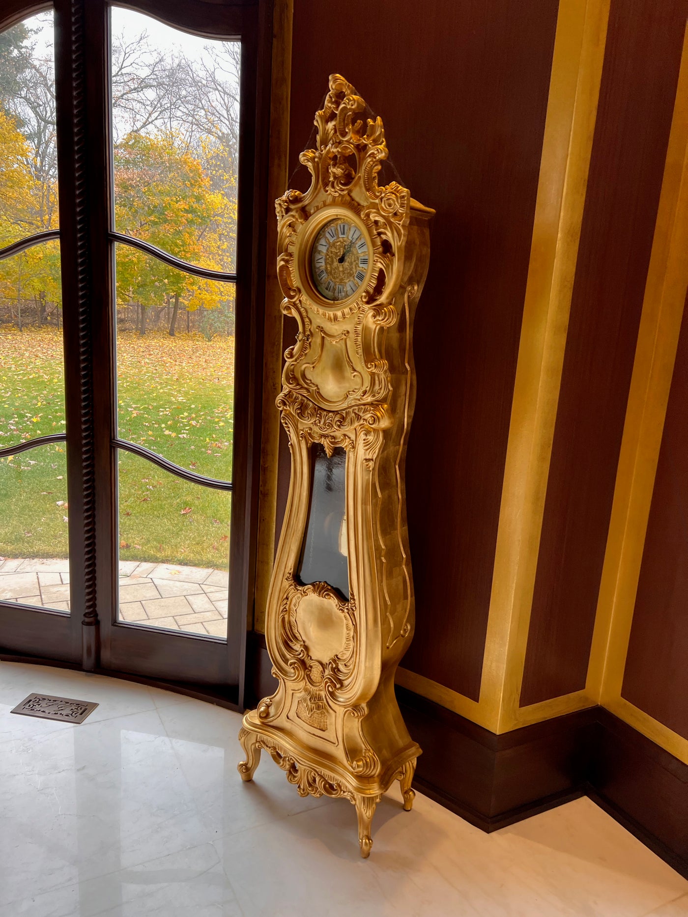 Modenese Gastone Gold Grandfather Clock, Wood with Gold Leaf Finishing, Made In Italy.