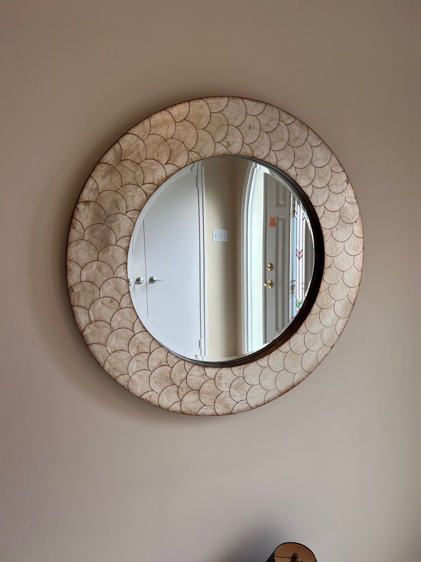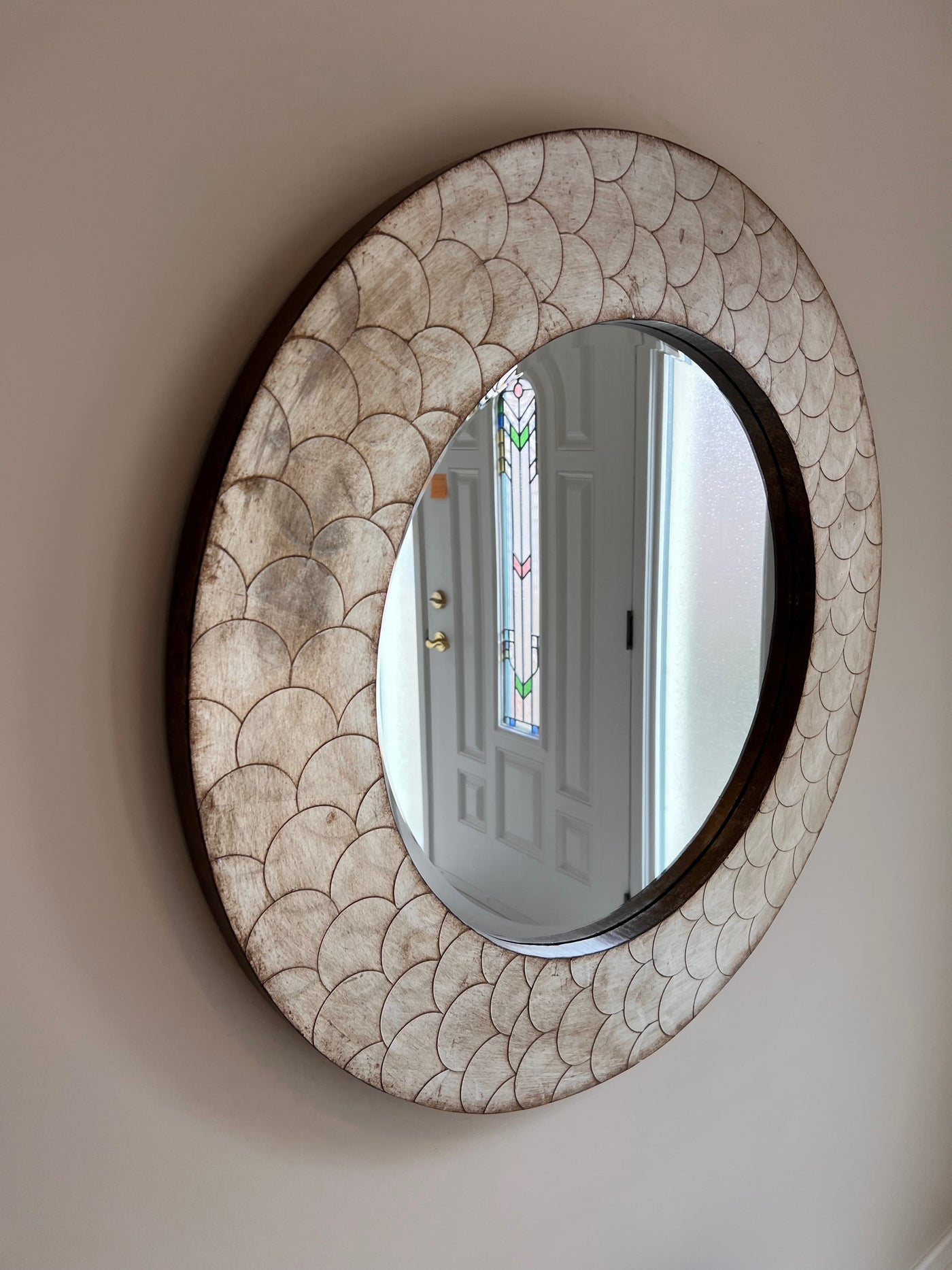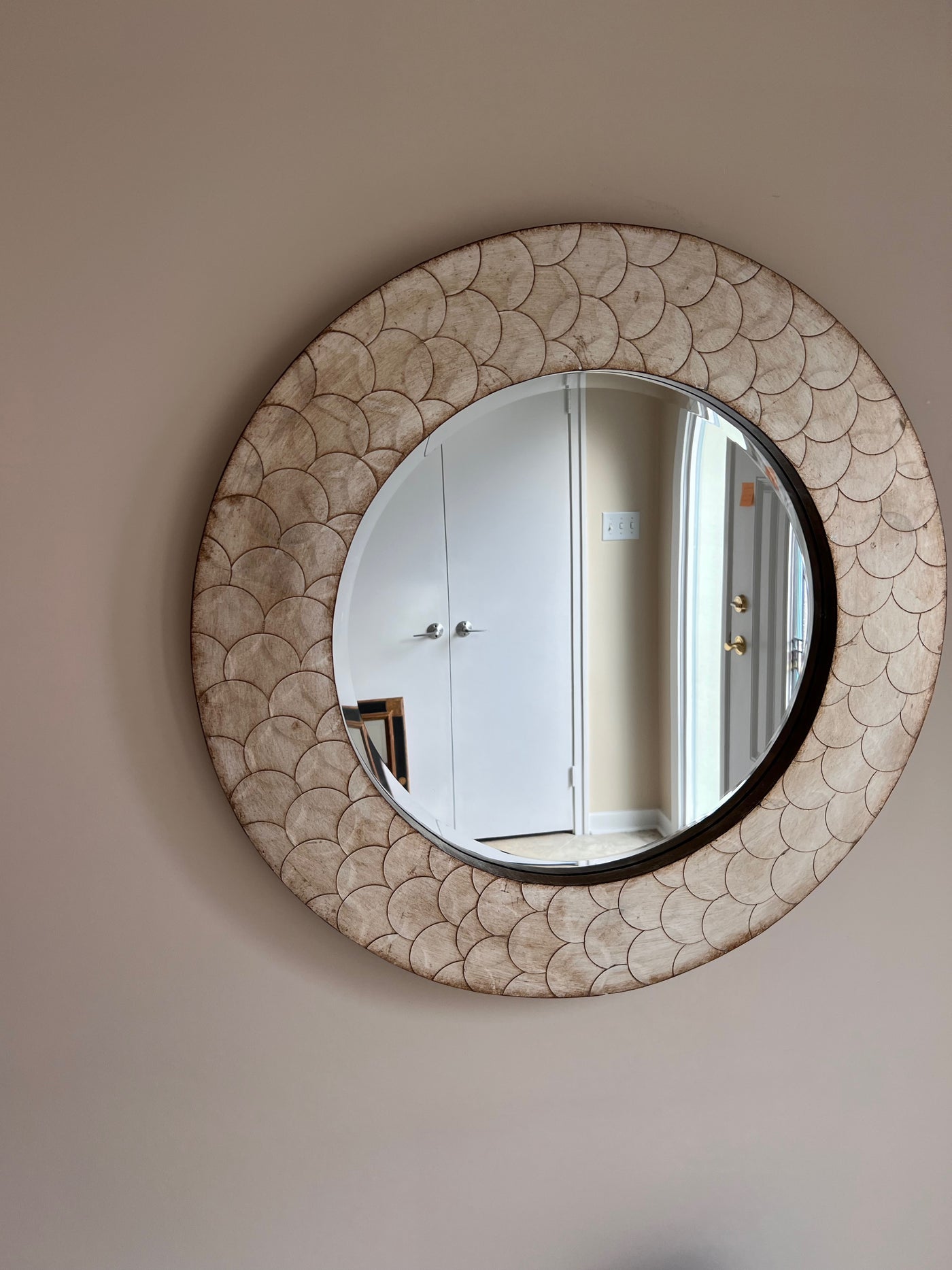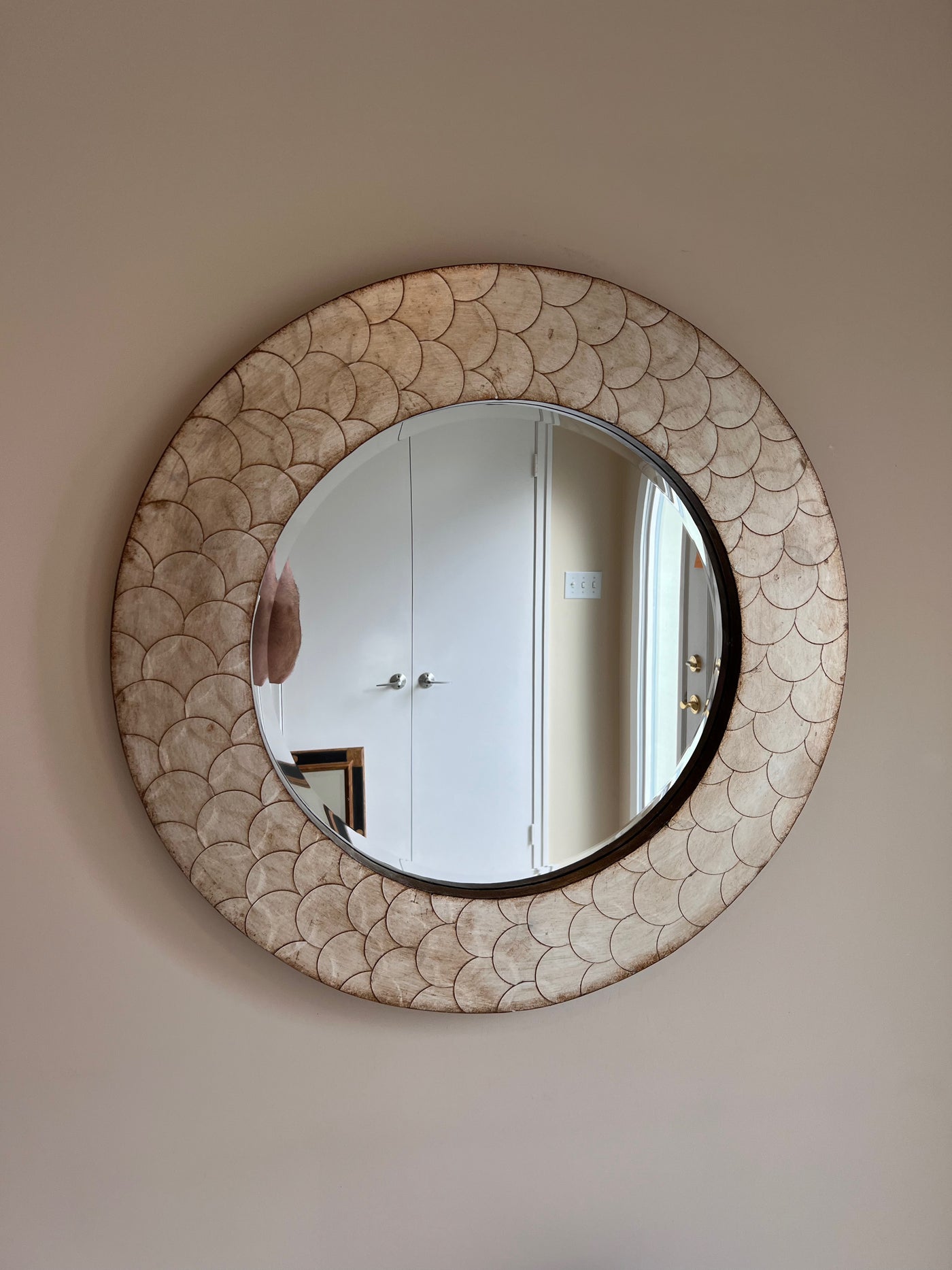 The Camelot Mirror is an interesting piece featuring a round wood frame characterized by a scaled textured metal overlay. The entire piece is then finished a mottled champagne silver with tones of bronze giving the color and texture an intense depth. The Camelot Mirror is a perfect accent piece for an entryway, bathroom, bedroom or any room in your home. D-rings are affixed to the back of the mirror so it is ready to hang right away! The mirrored glass on this piece is beveled adding to its beauty and style.