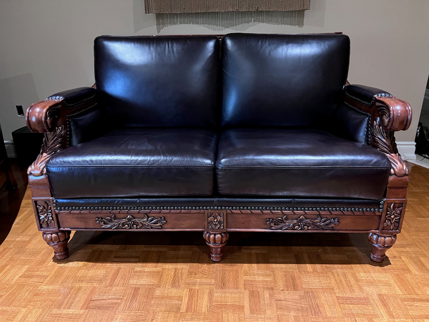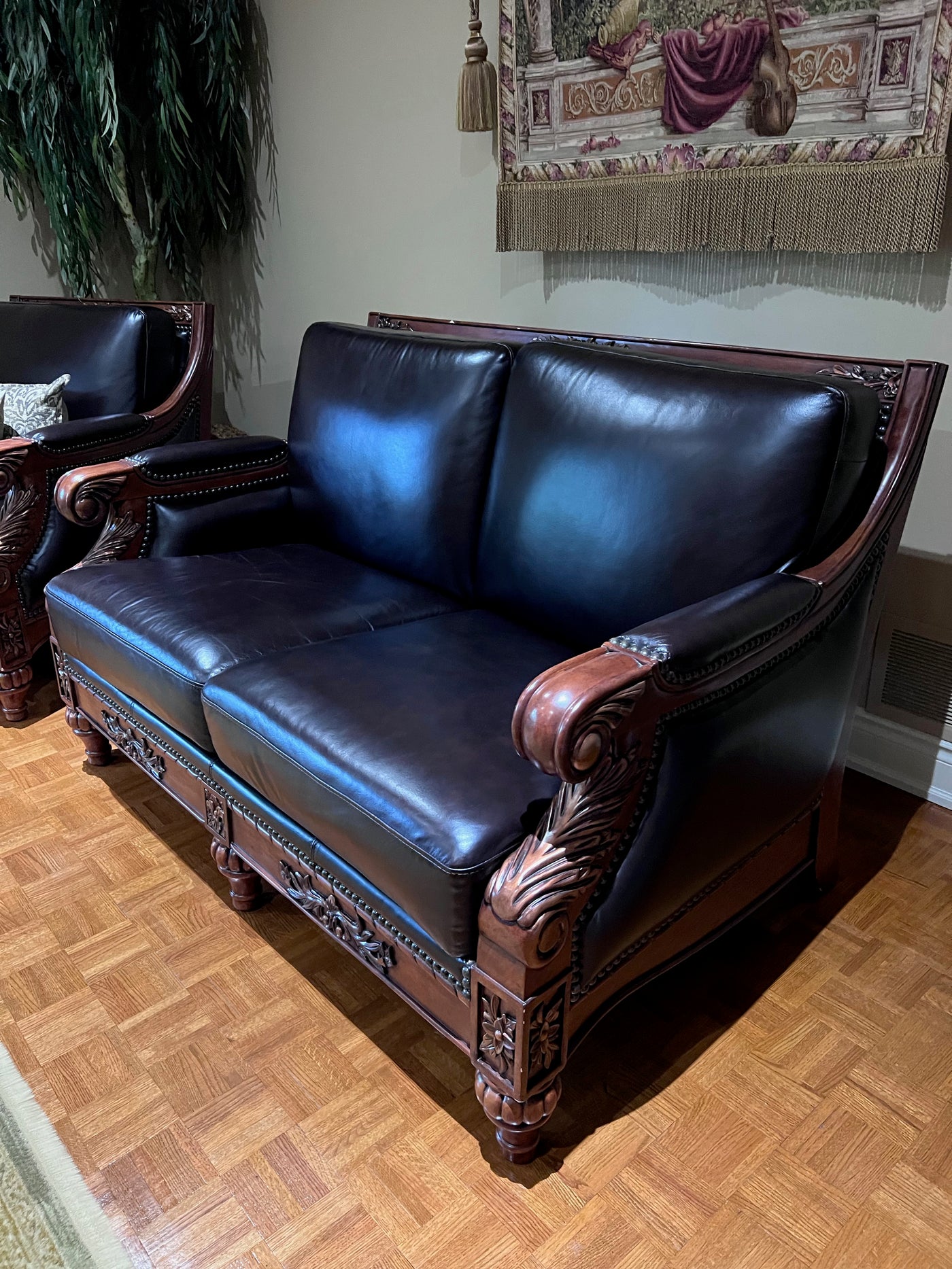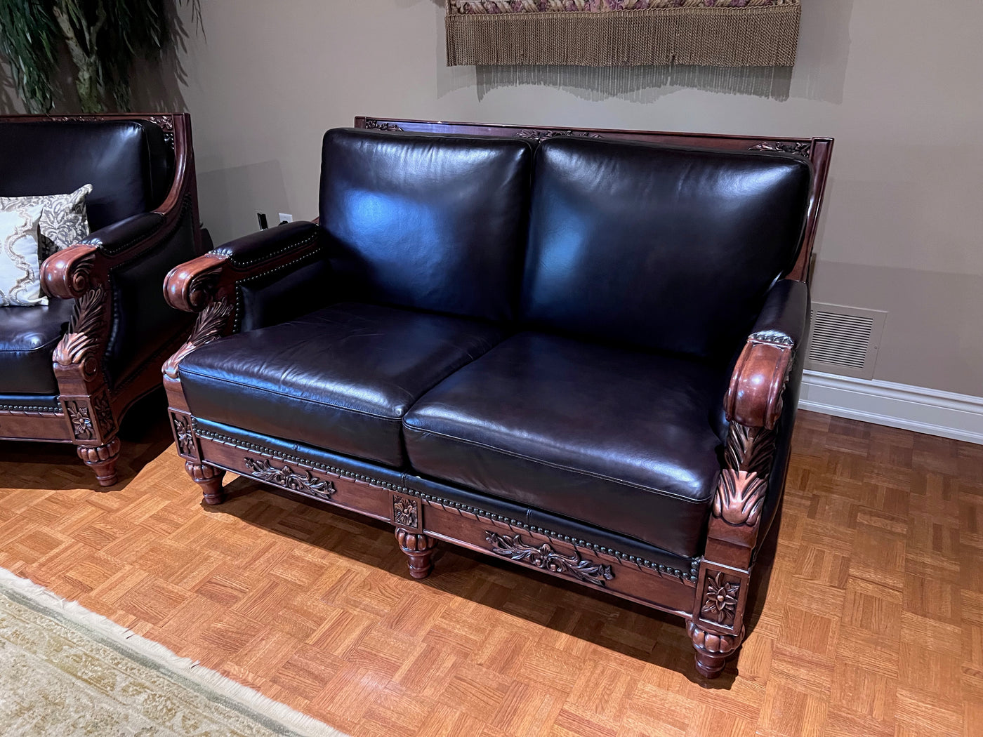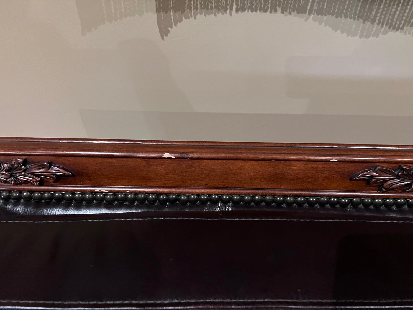 Dark Brown Leather Love Seat, Wood Carved Frame.