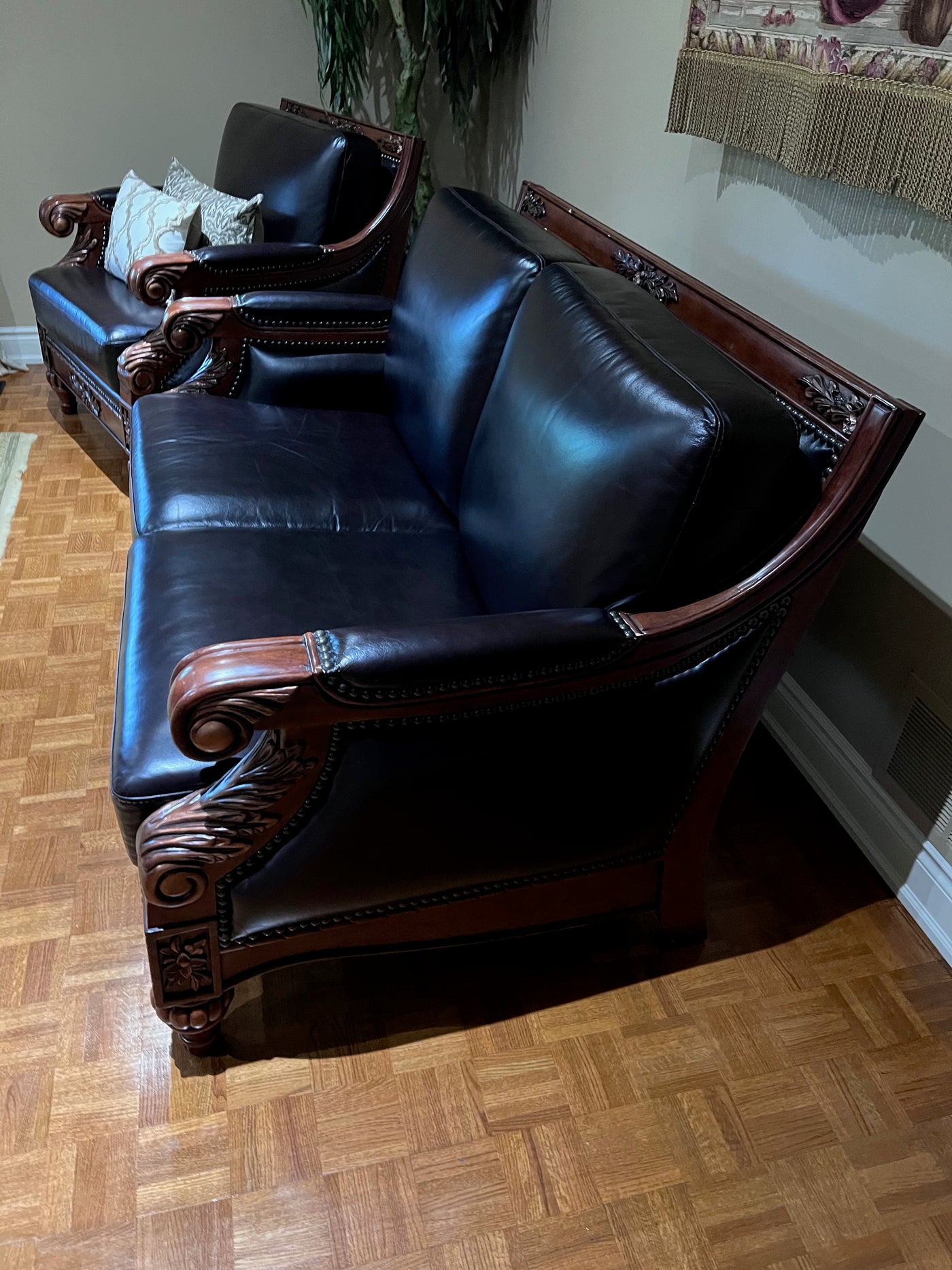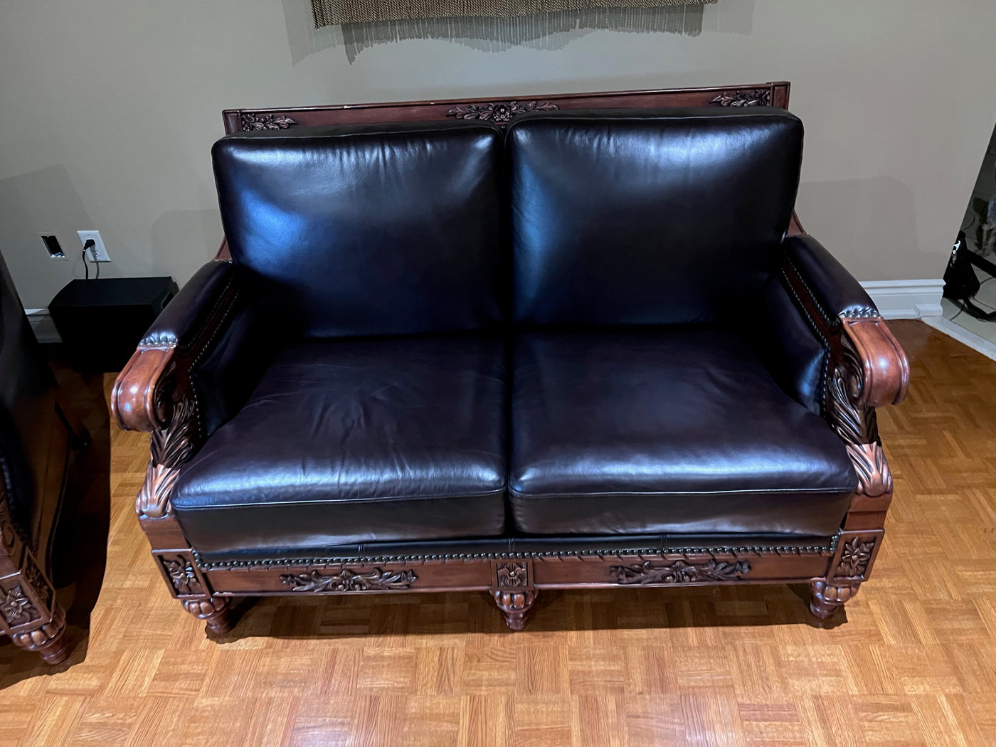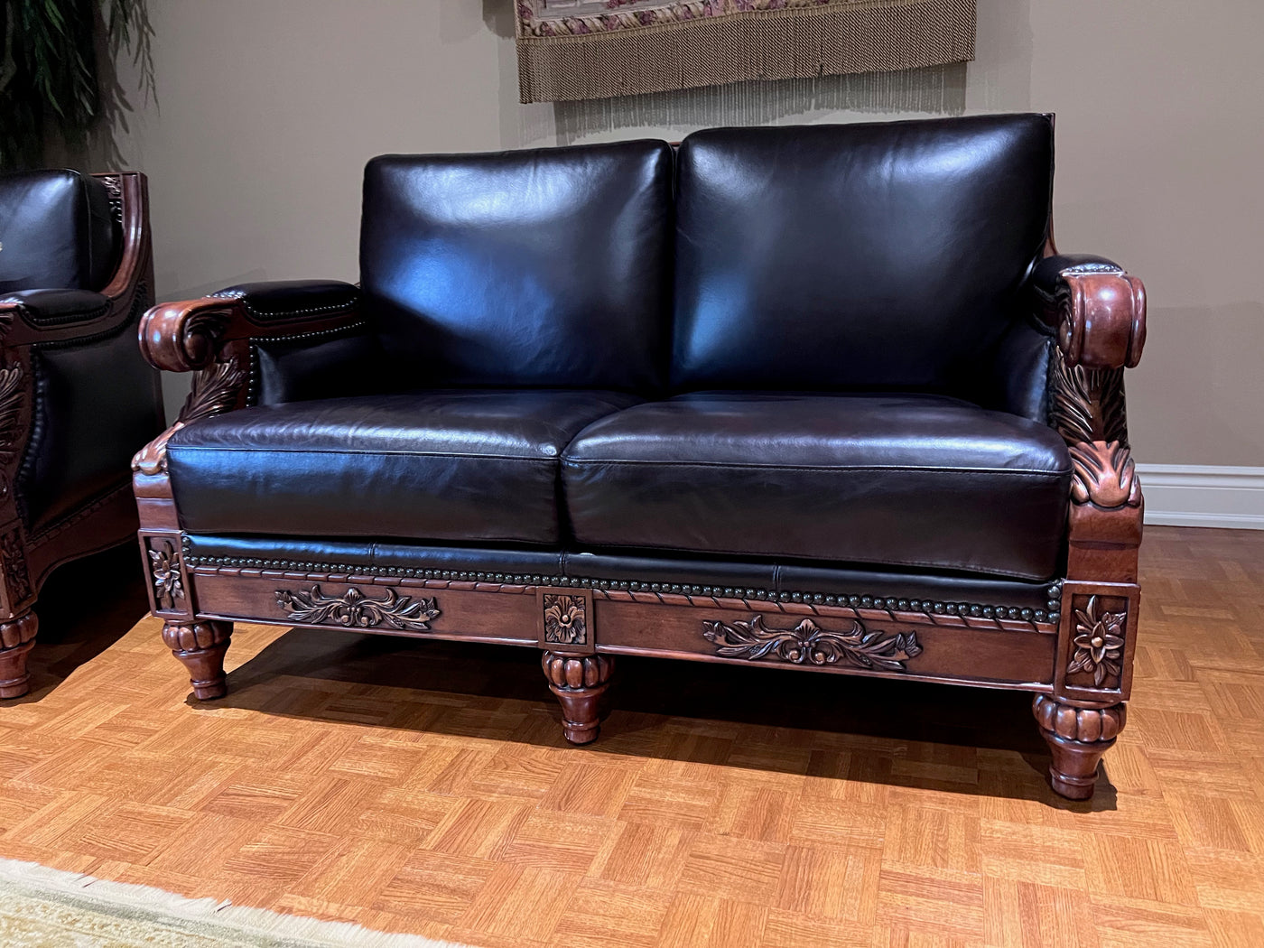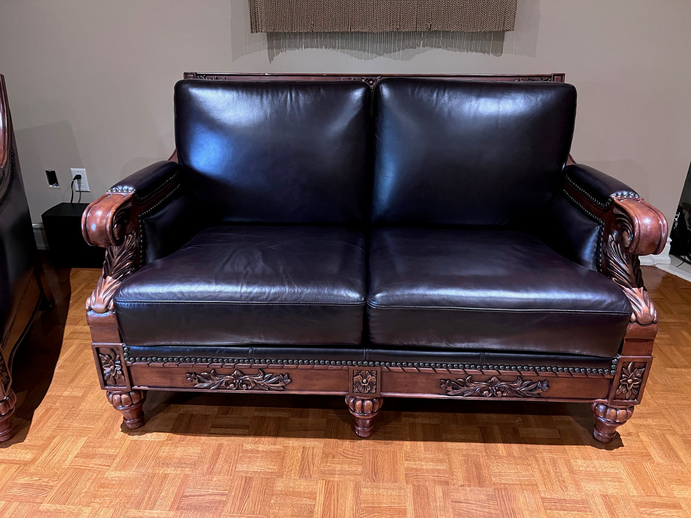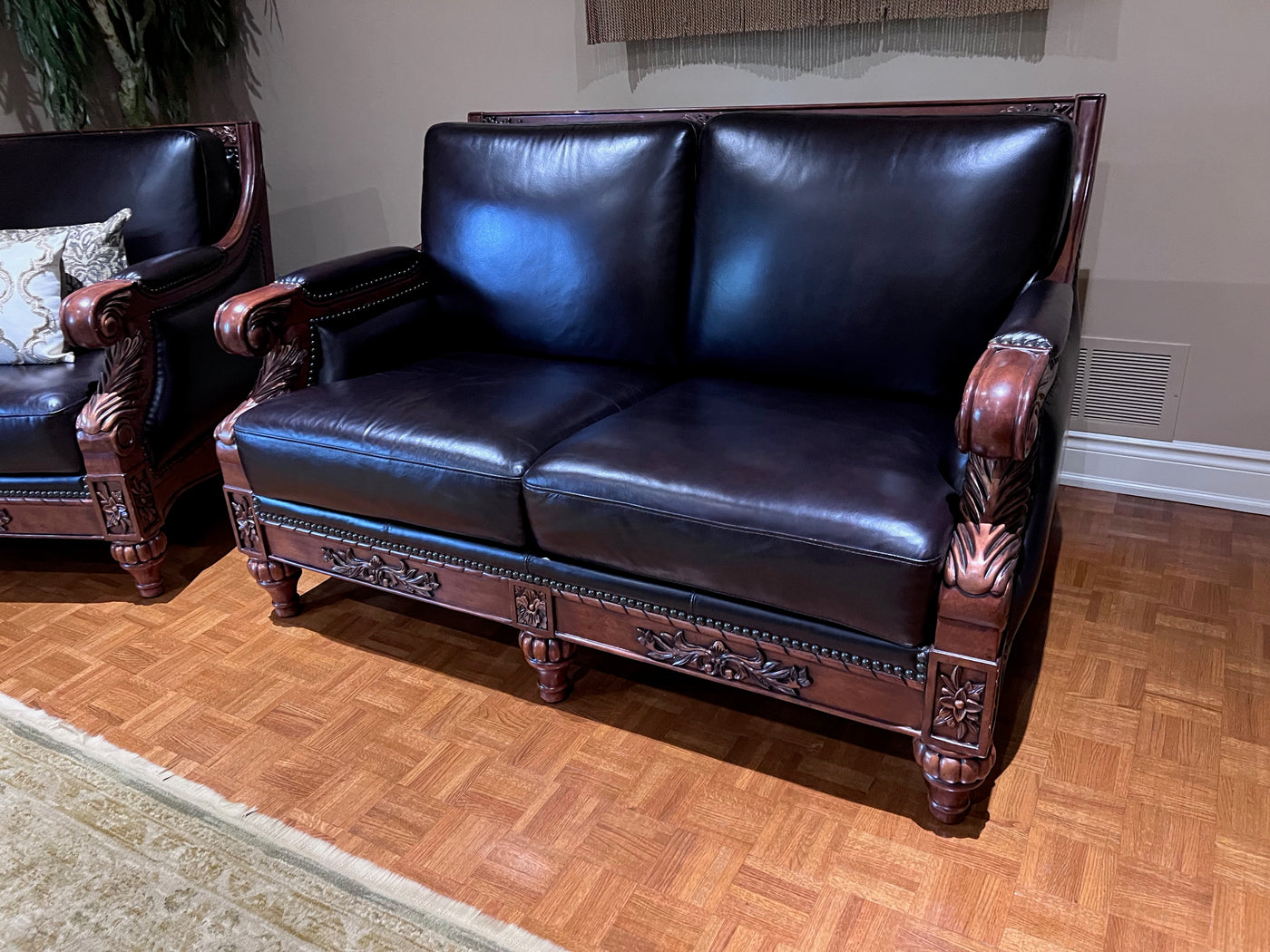 Dark Brown Leather Love Seat, Wood Carved Frame.