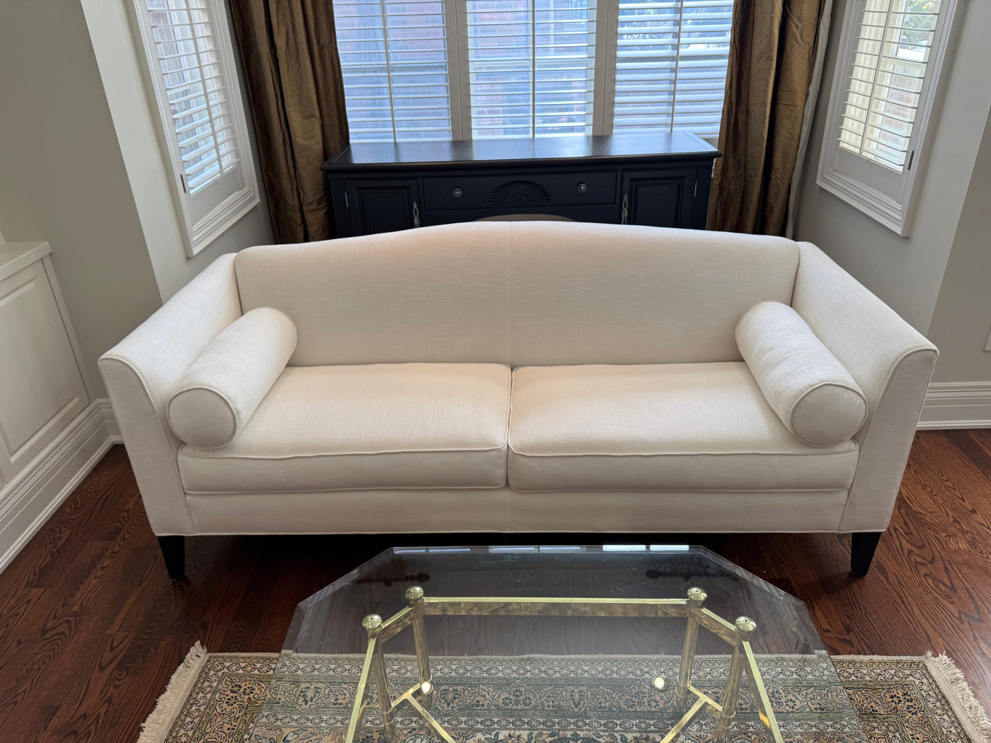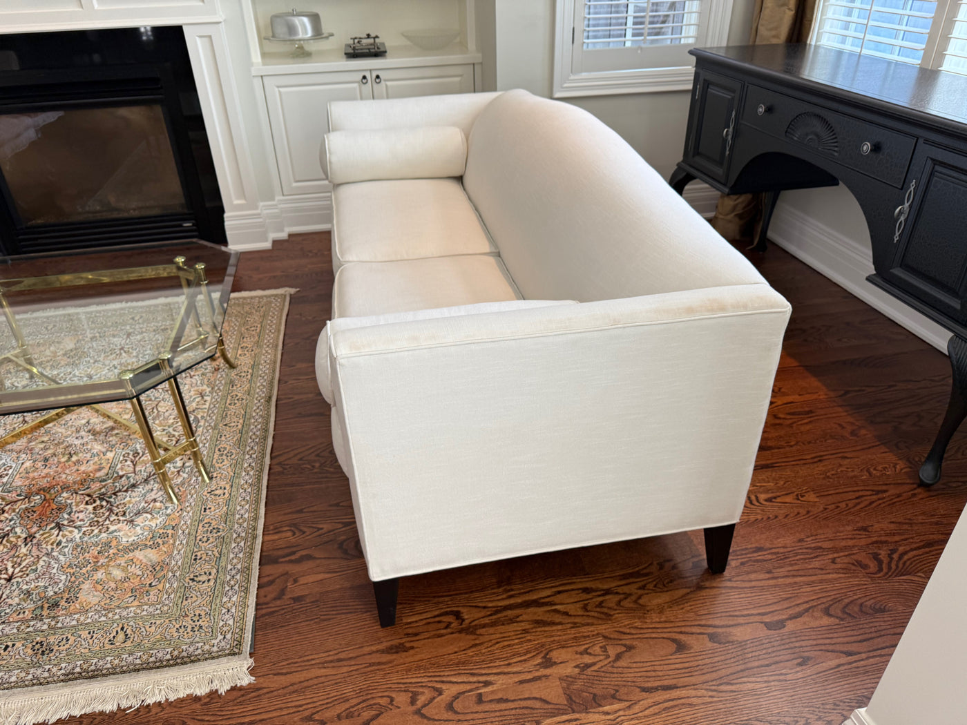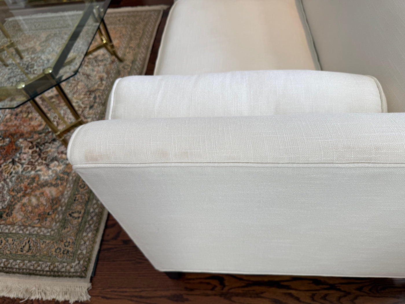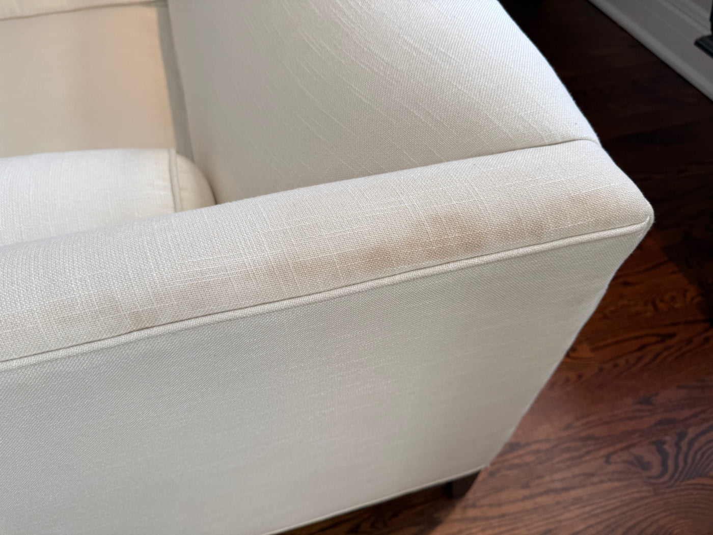 condition: there is a small stain on the back corner of the sofa as shown in the pictures. we believe it can be steam cleaned out.