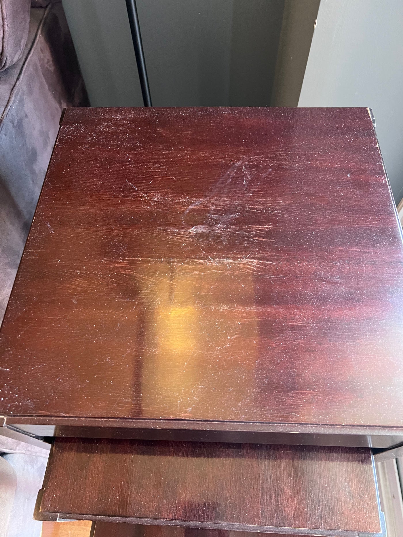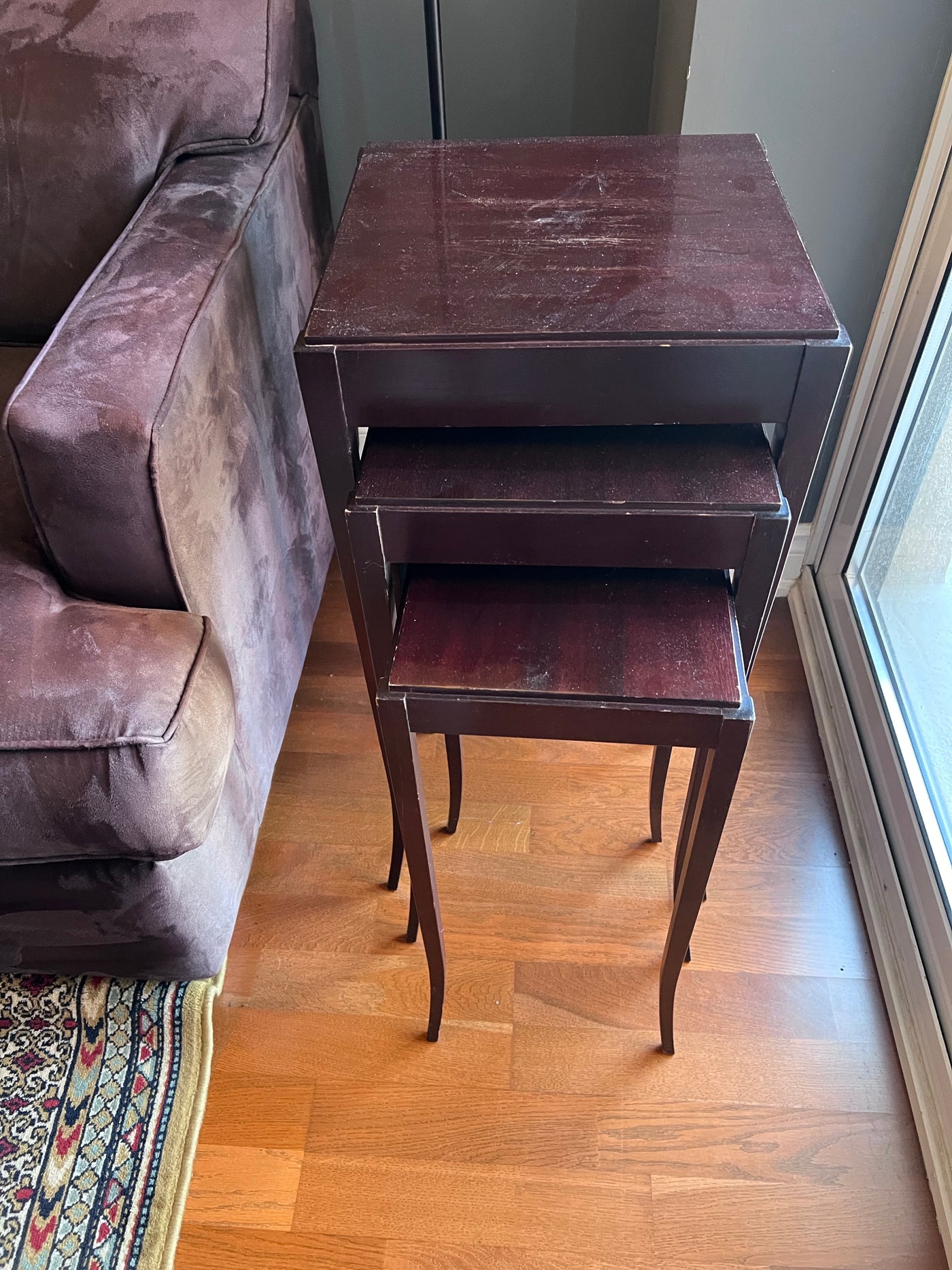 *there is noticeable wear on the top table and a few chips on the edges of the other 2 tables. Priced accoridngly!