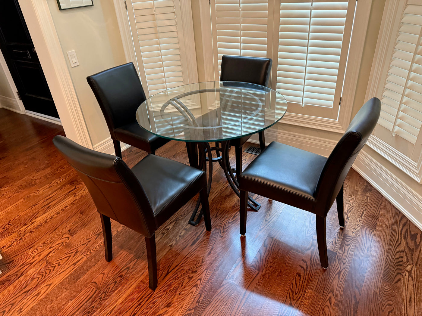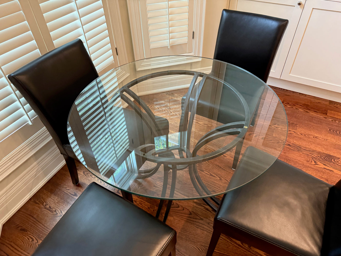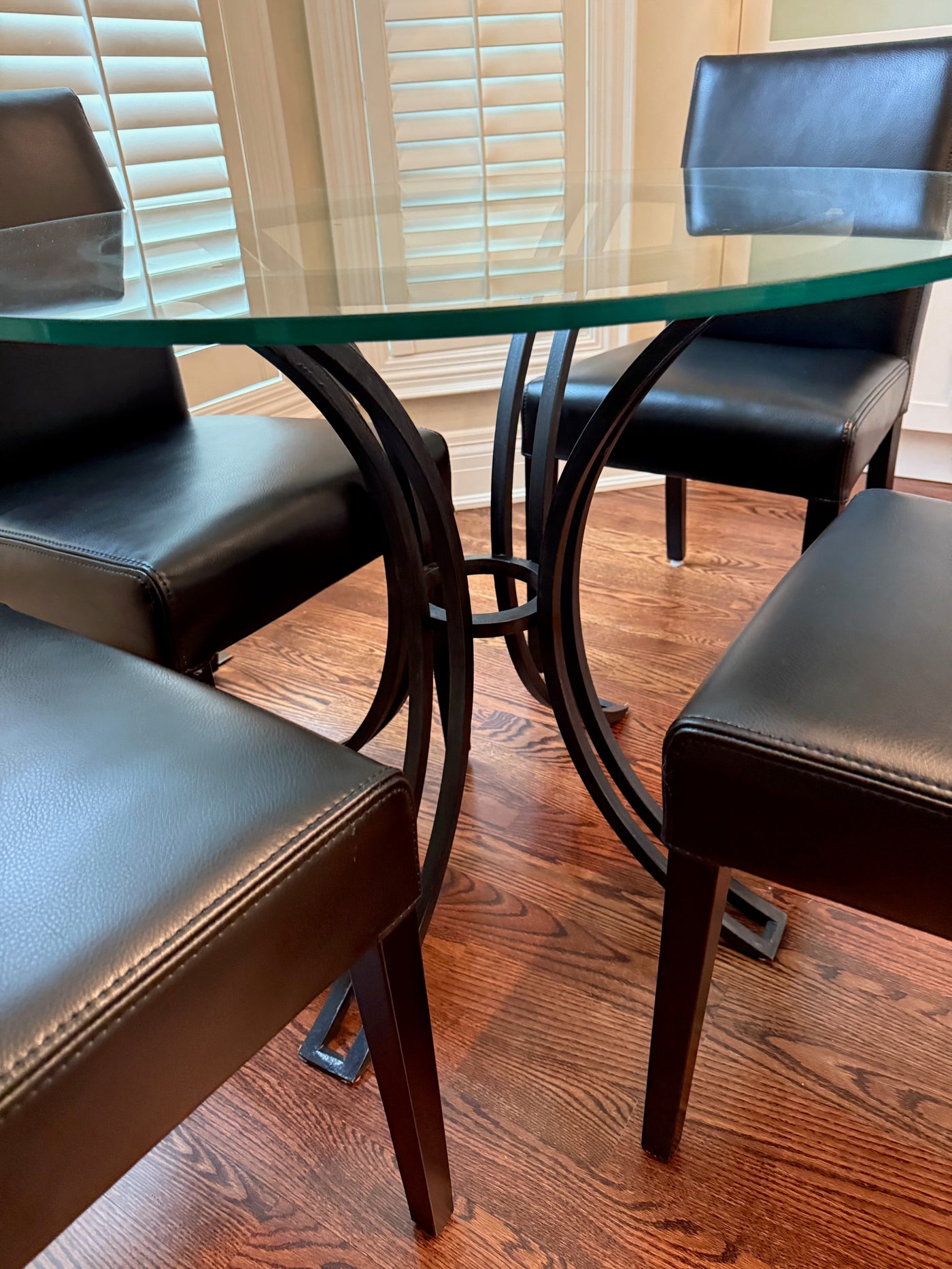 Round Glass Kitchenette Table with Iron Base + 4 Crate & Barrel Black Chairs.