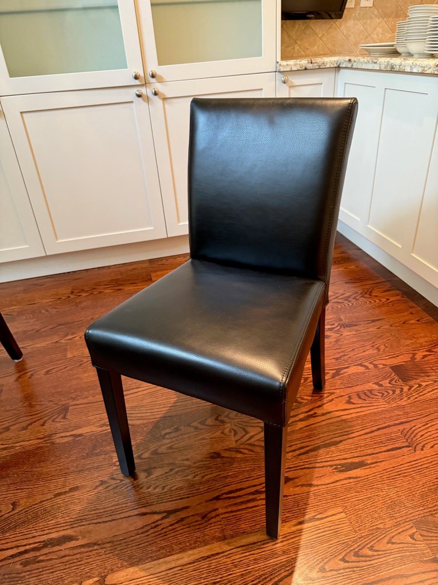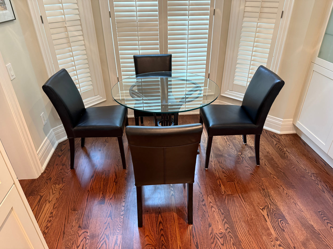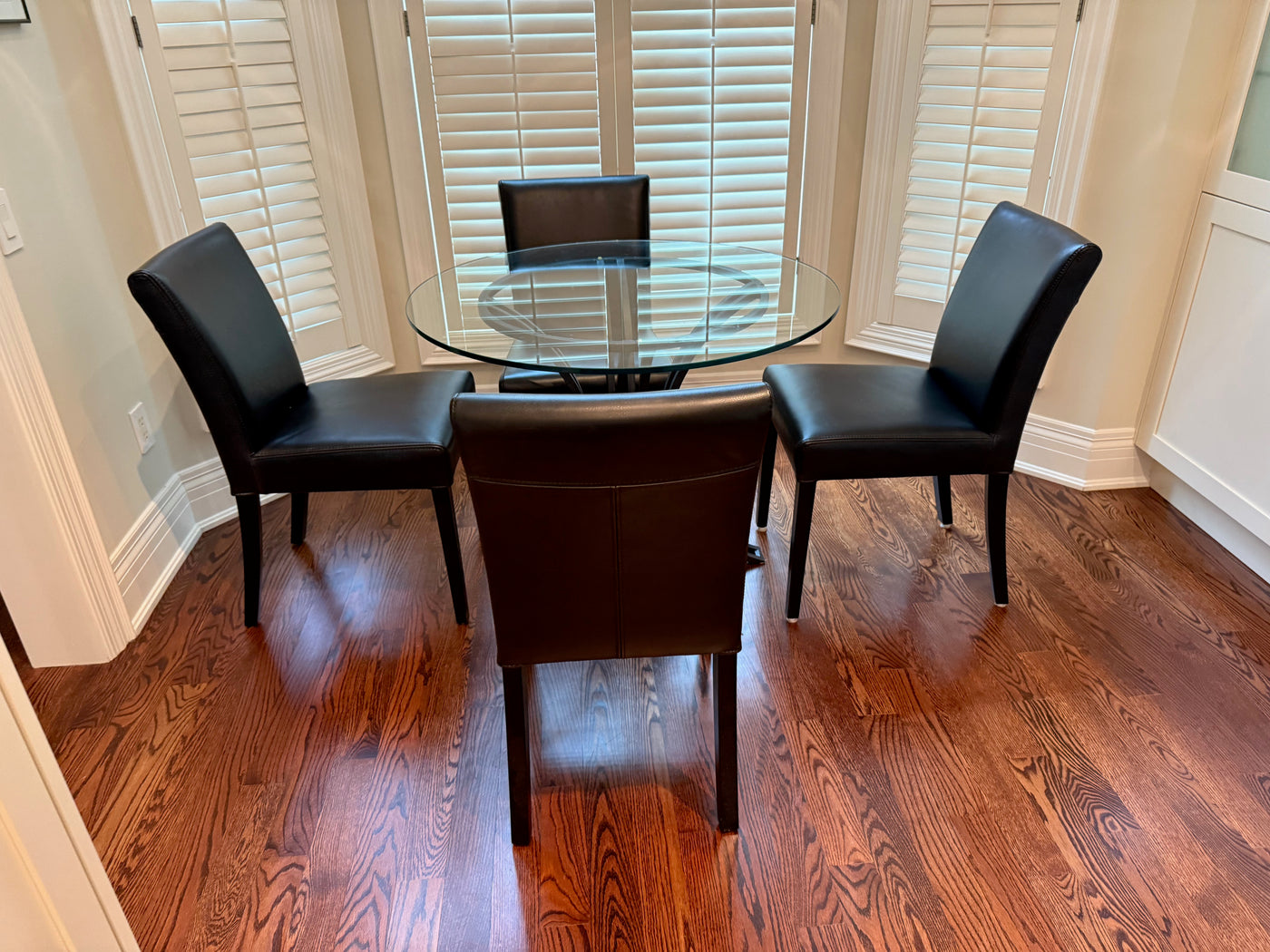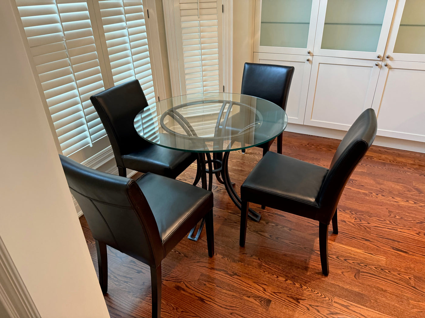 Round Glass Kitchenette Table with Iron Base + 4 Crate & Barrel Black Chairs.