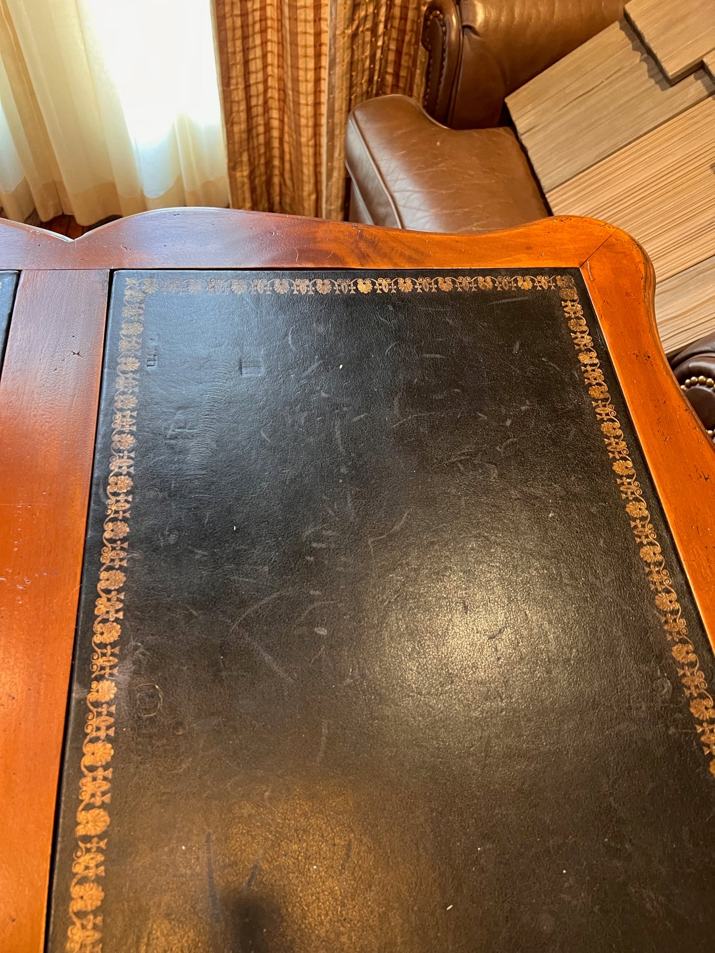 Condition: there is some wear on the front edge of the desk consistent with frequent use over time. There are also some marks on the top of the leather consistent with normal use. Overall we feel this desk to be in good condition for it's age. No real damage or cracks. PLEASE VIEW ALL PICTURES.