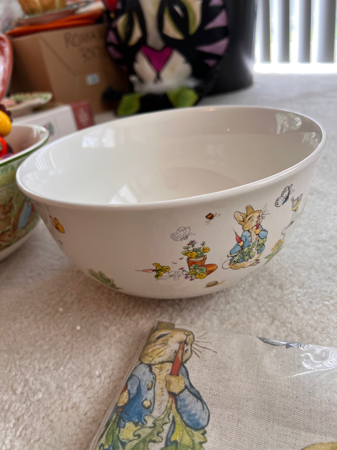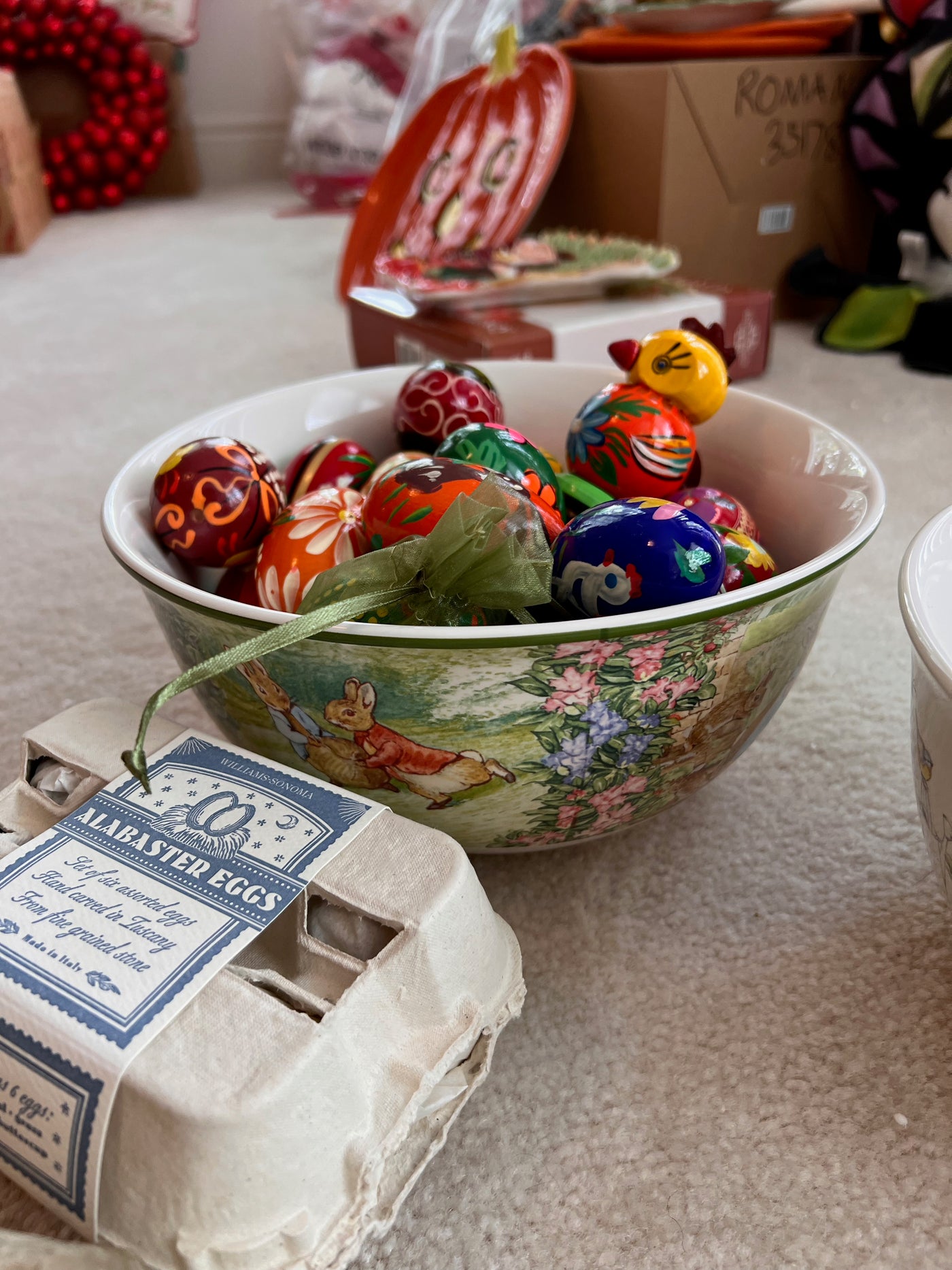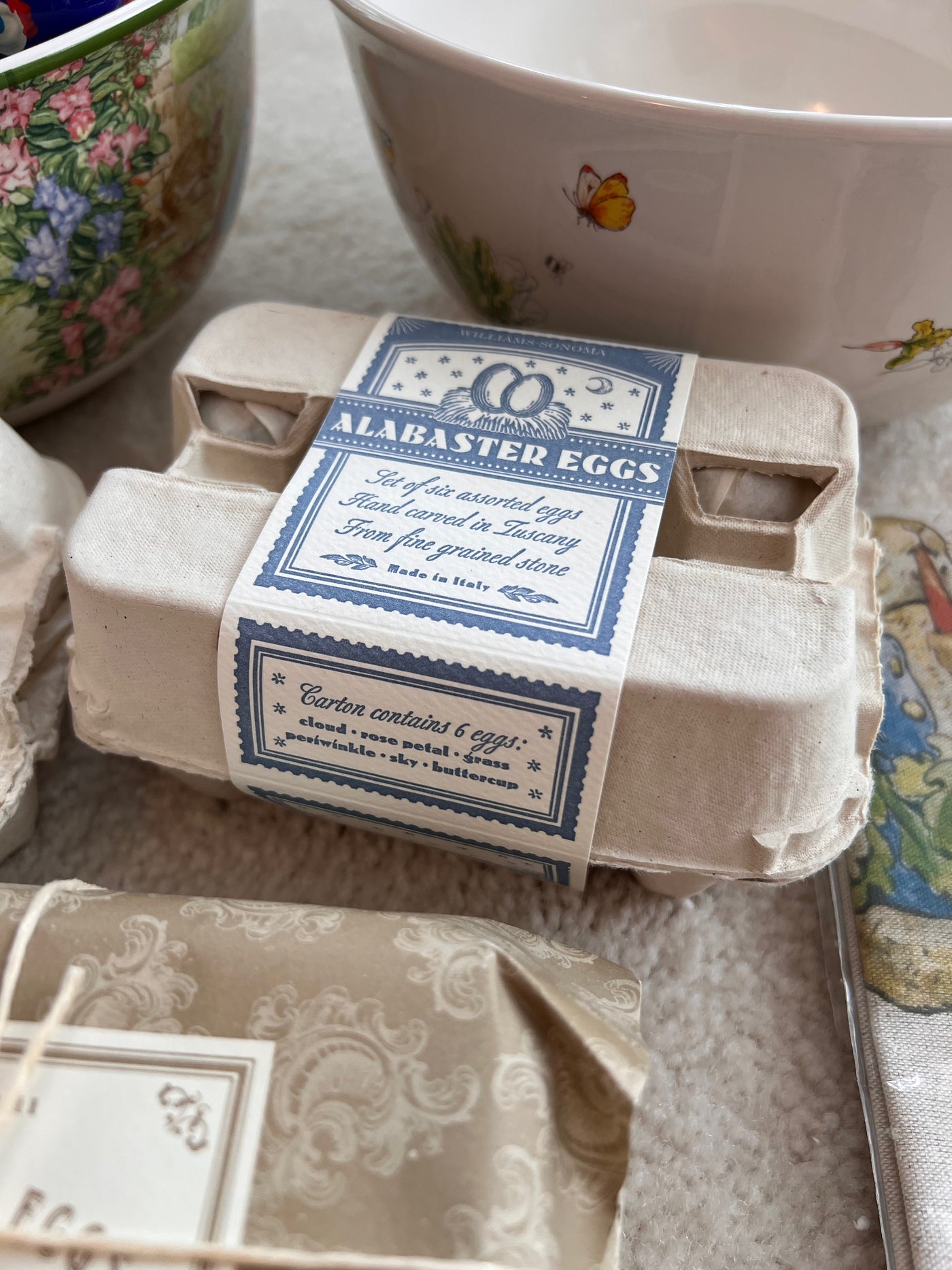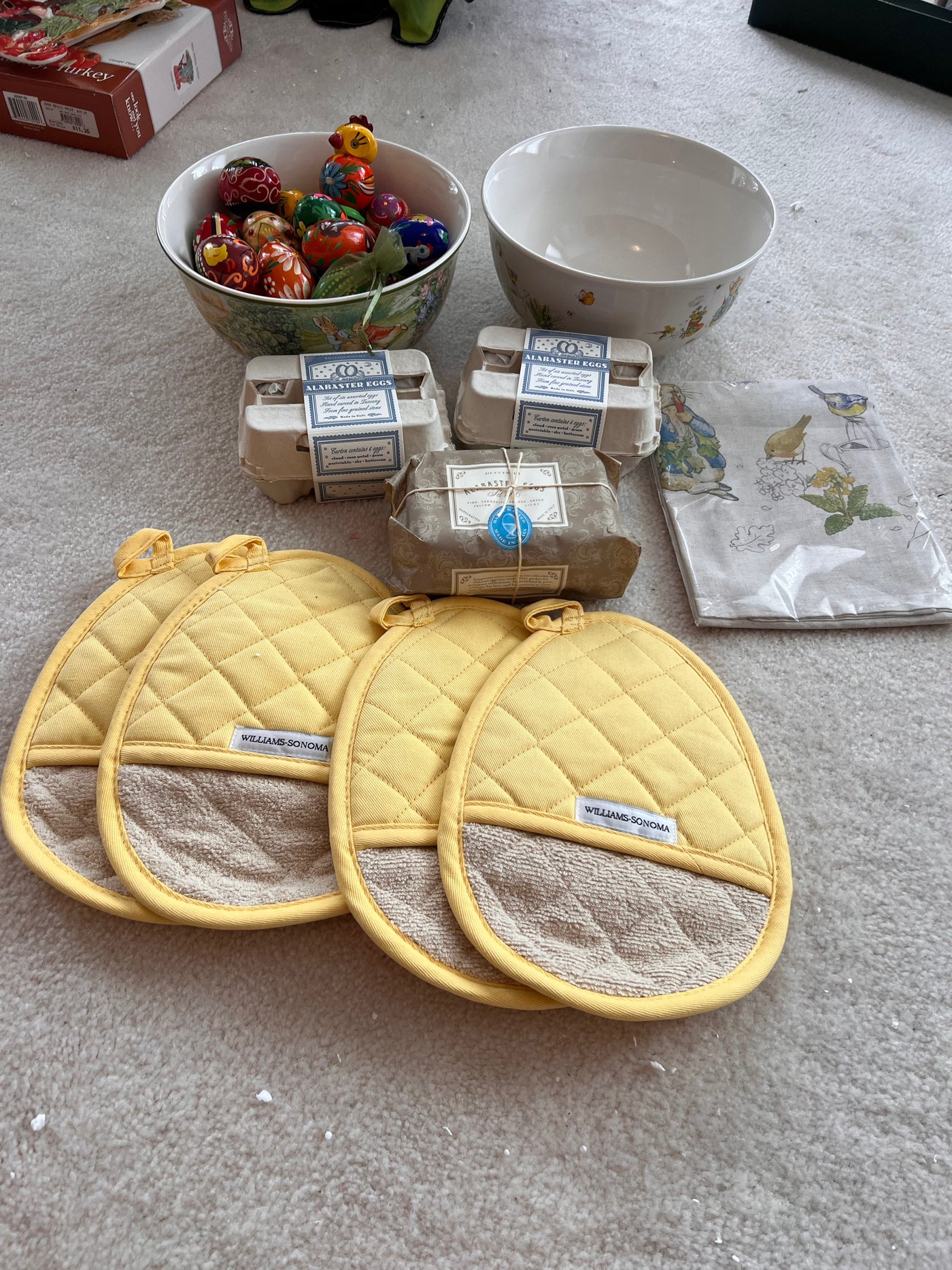 Easter Lot- Williams-Sonoma: Alabaster Eggs, 2 Peter Rabbit Bowls, Trivets, Tablecloth, Wooden Eggs (*BRAND NEW) (*Retail value $200)