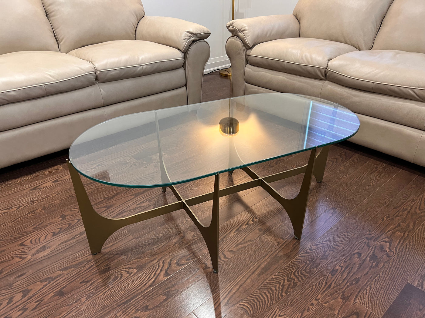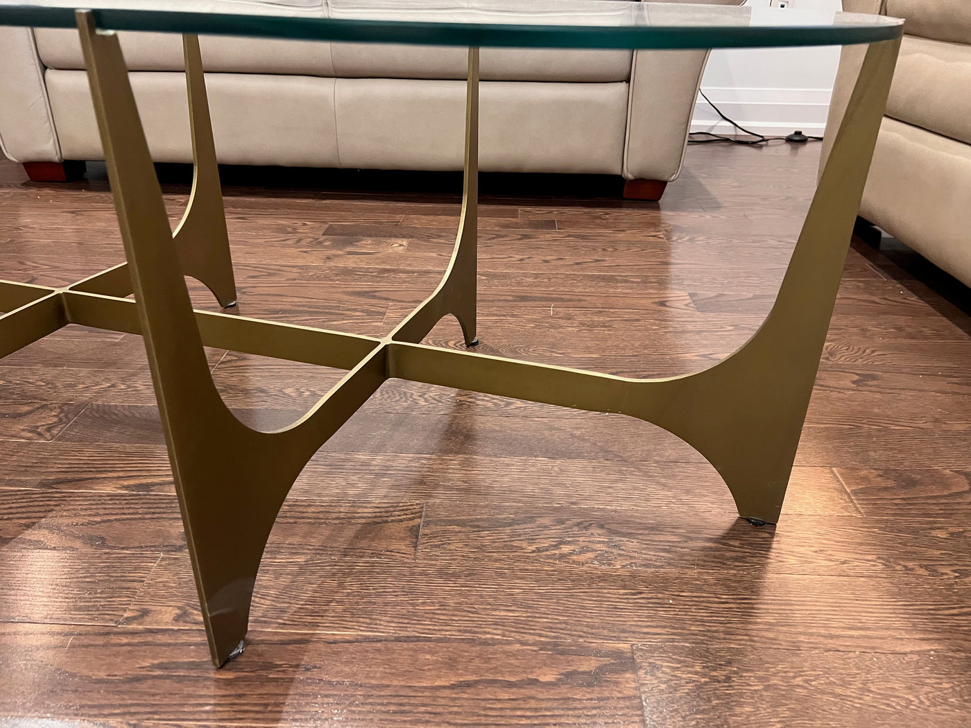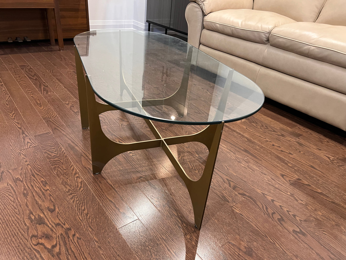 With a captivating sculpted base, this contemporary coffee table will effortlessly elevate any space. Features a 10mm clear tempered glass top and completed with a powder-coated steel base in an antique brass finish. Made in India. With refined craftsmanship, this design was brought to life by skilled local artisans. Due to the nature of handcraftsmanship, unique imperfections such as fissures, markings and variations in colour and shape are welcomed and appreciated characteristics for a truly one-of-a-kind piece.