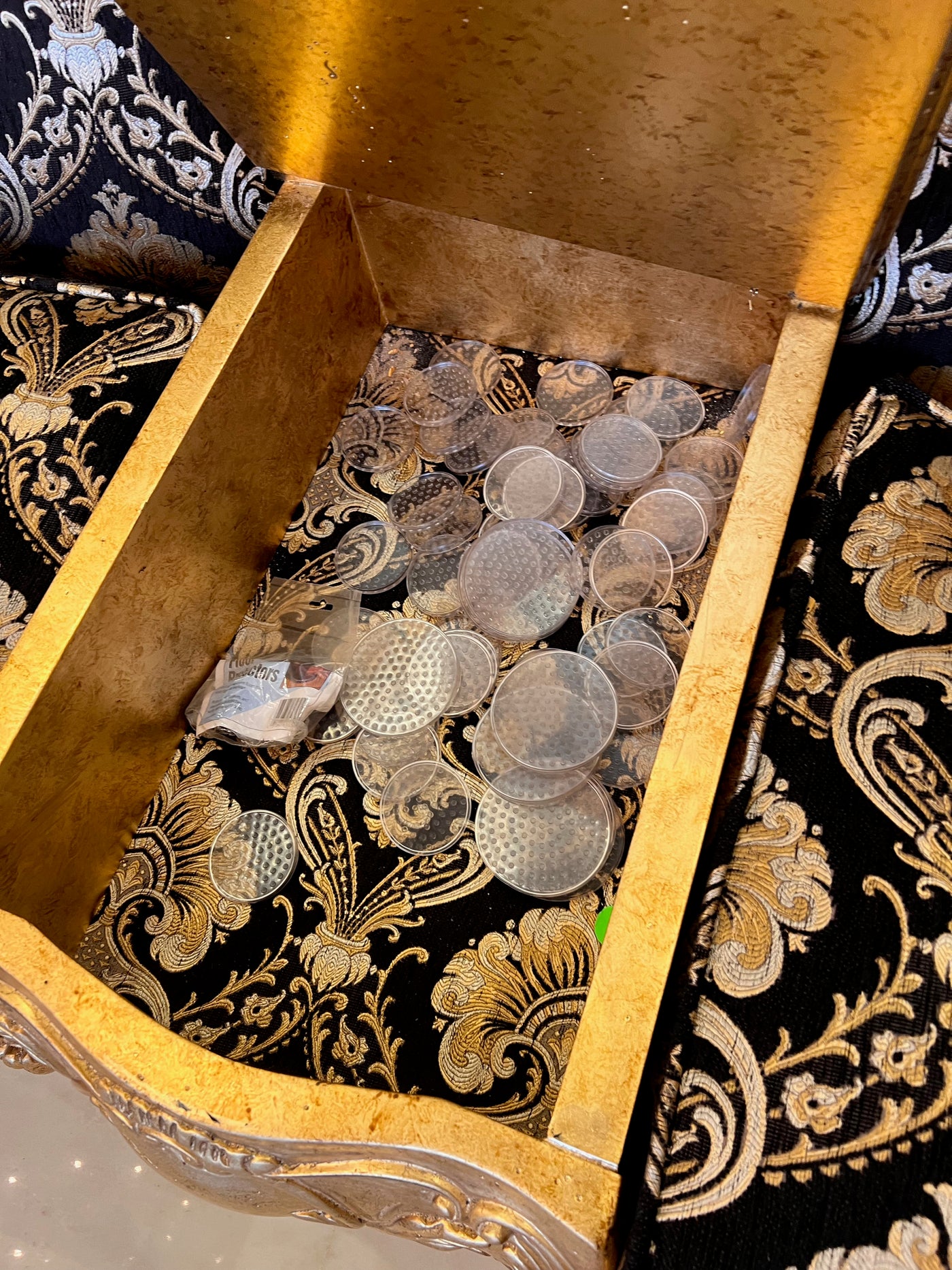 In good condition overall. The middle component that serves as a storage table and slightly come off the hinges. It is made of wood and can either be used as is or repaired.