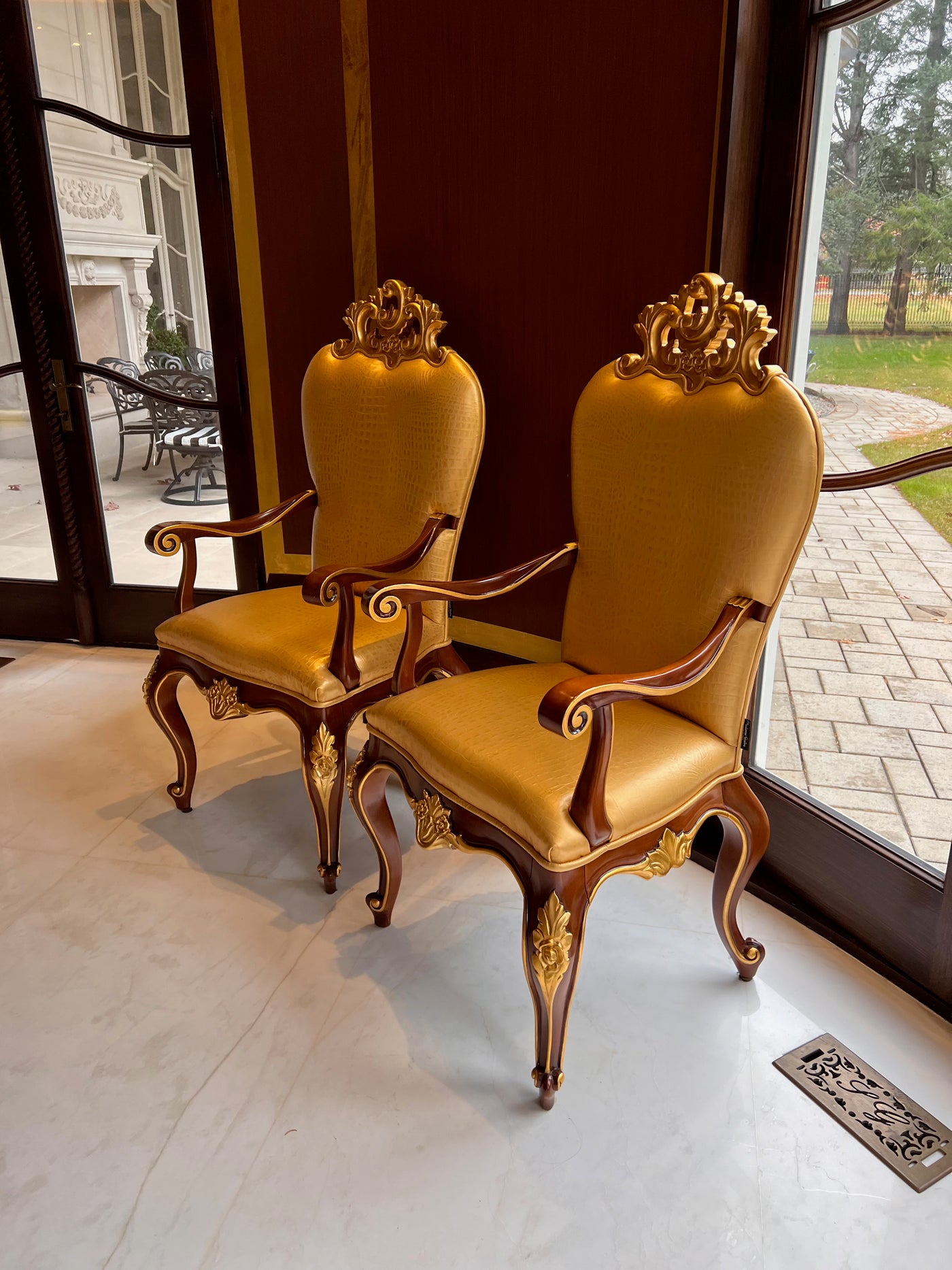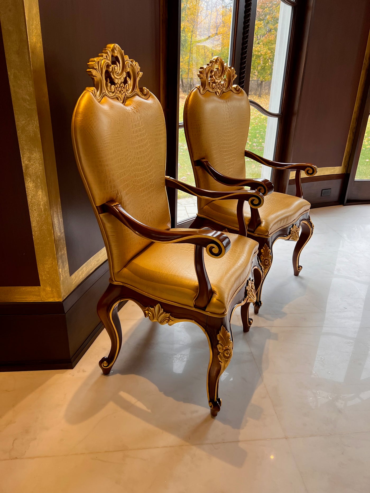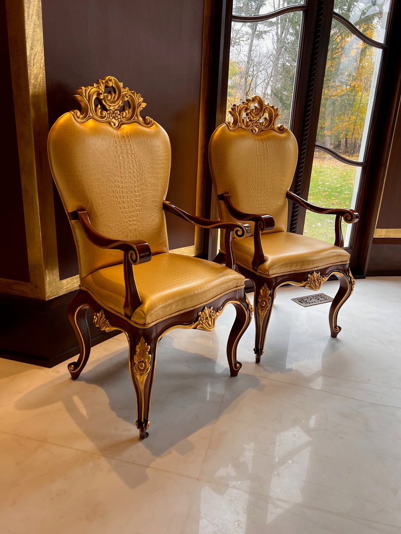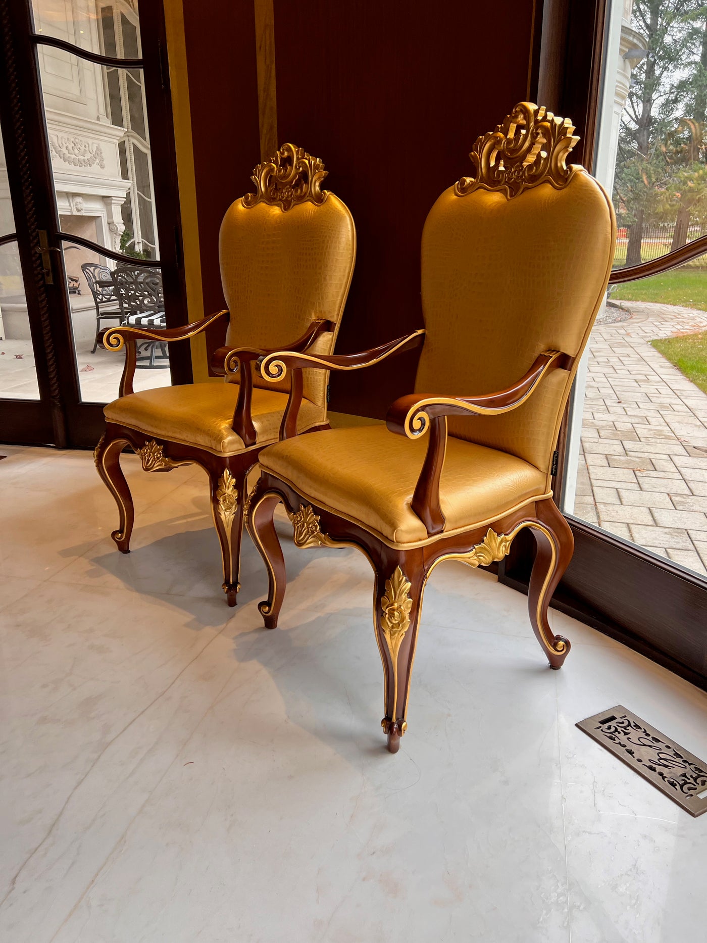 2 'Modenese Gastone Luxury Interiors' Baroque Leather Armchairs, Walnut Finish with Gold Leaf Details, Made in Italy (*retail $13,000)
