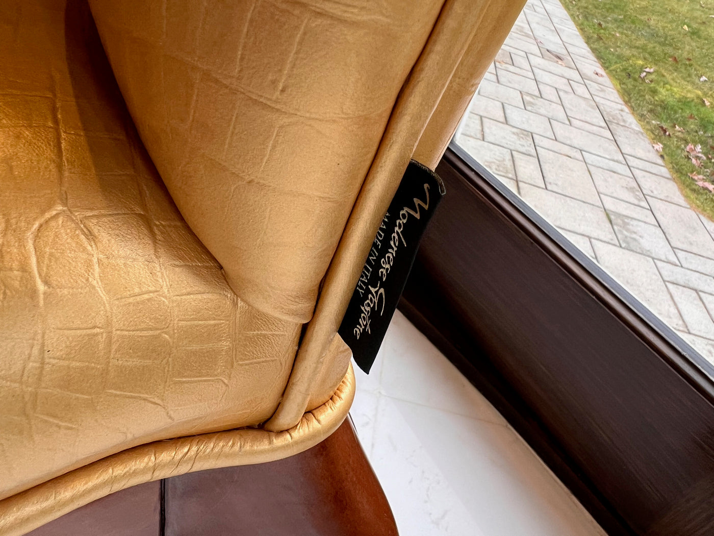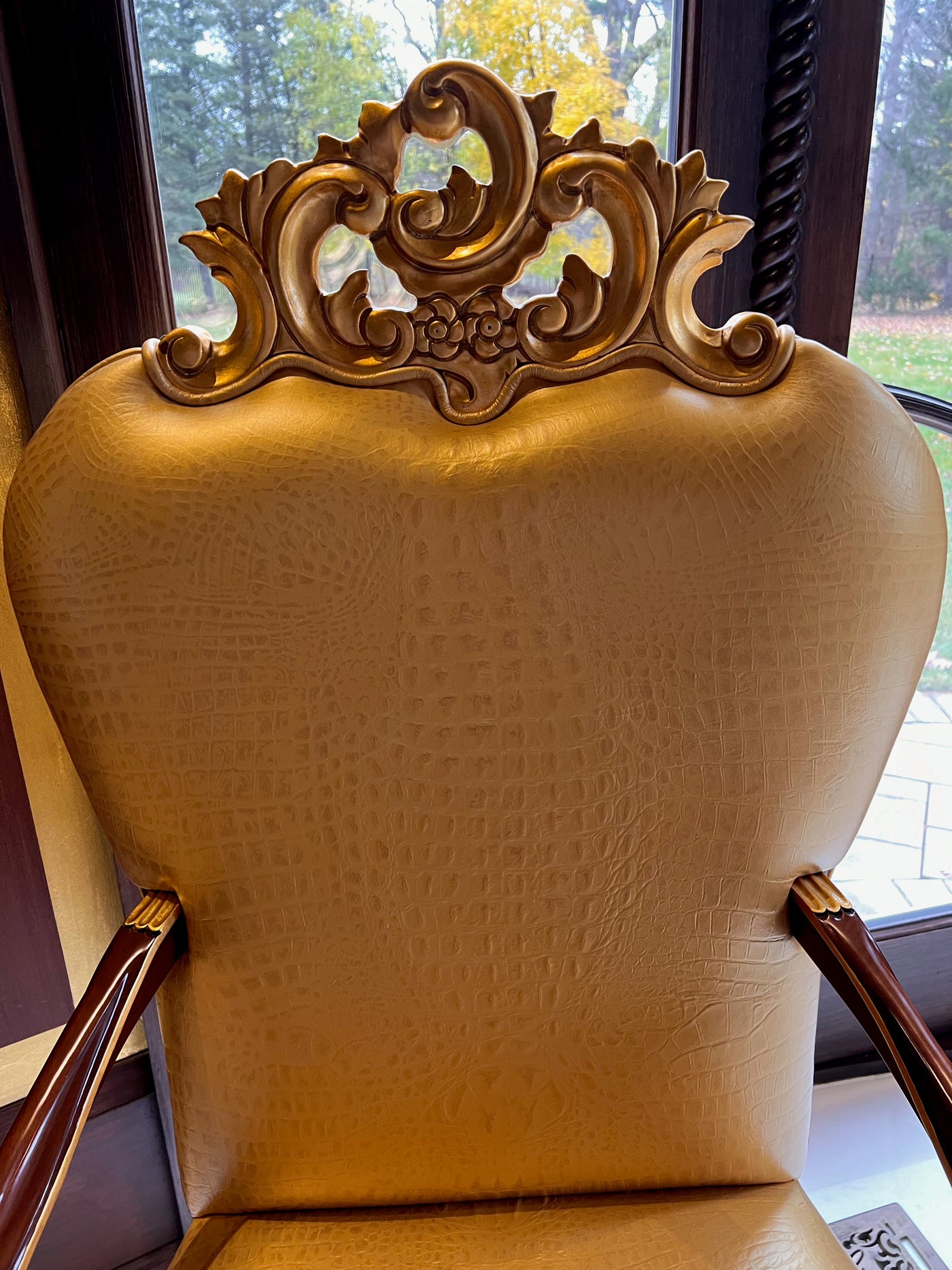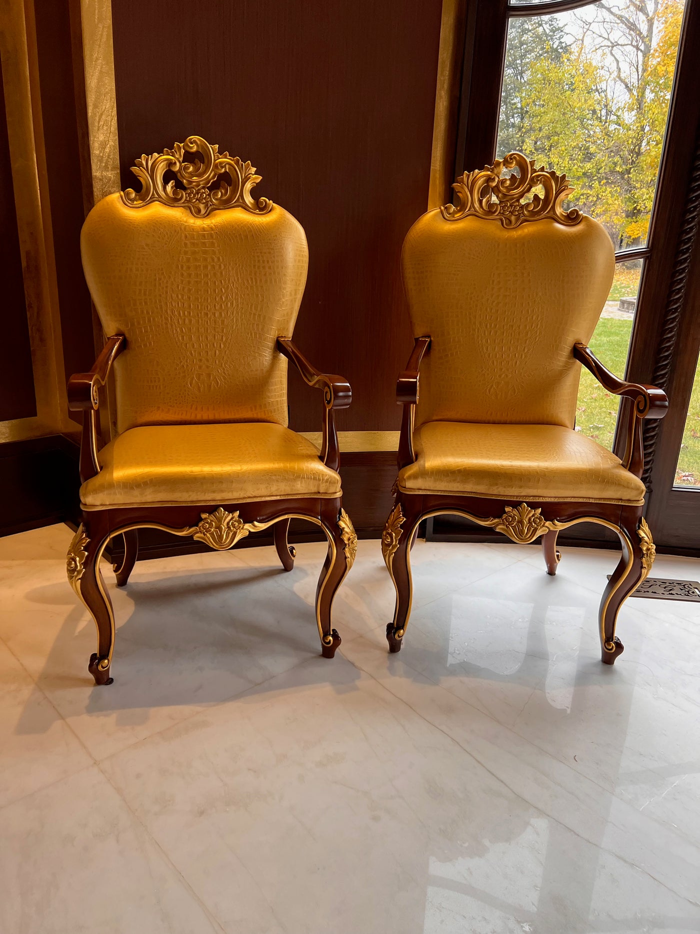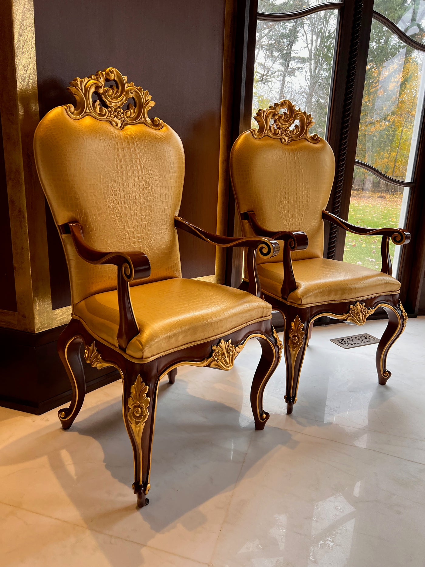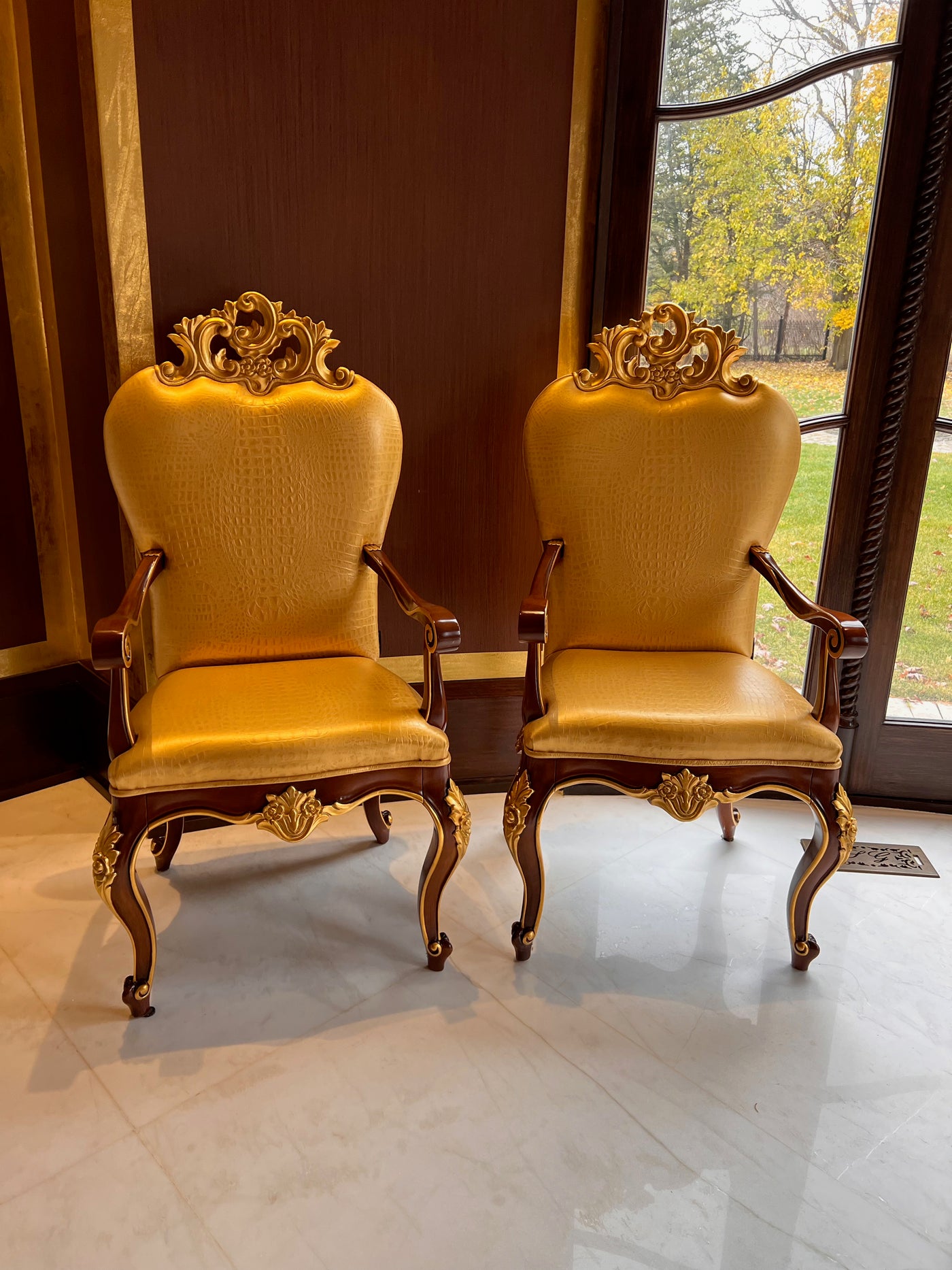 2 'Modenese Gastone Luxury Interiors' Baroque Leather Armchairs, Walnut Finish with Gold Leaf Details, Made in Italy (*retail $13,000)