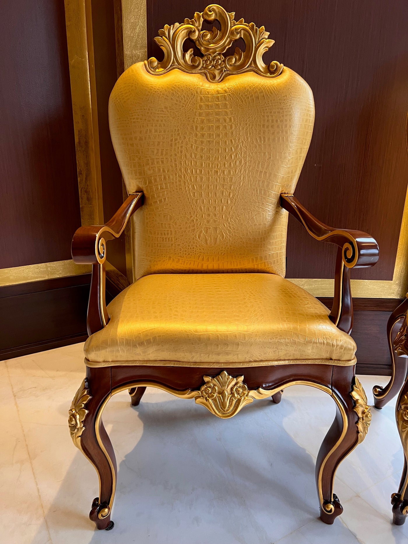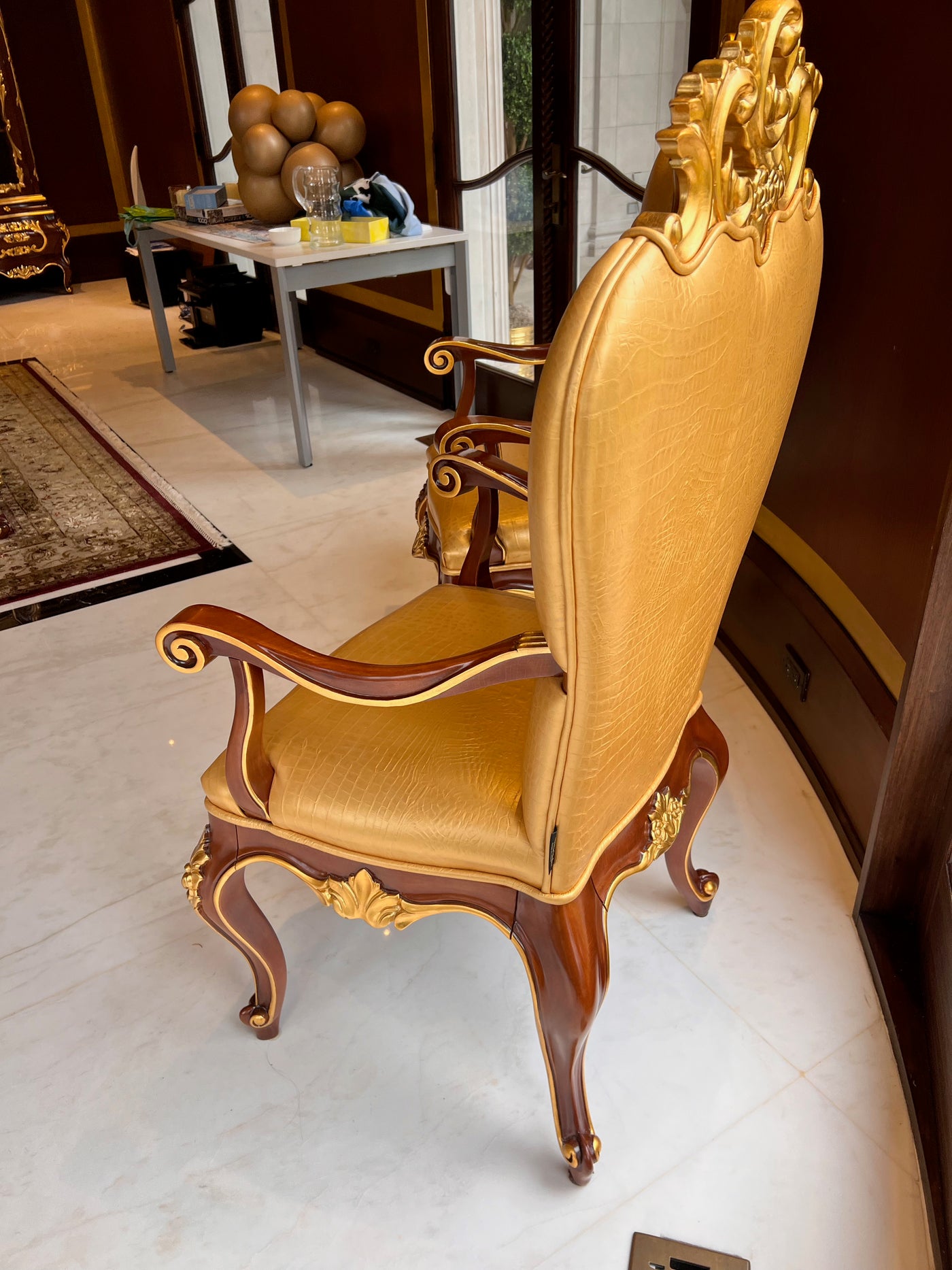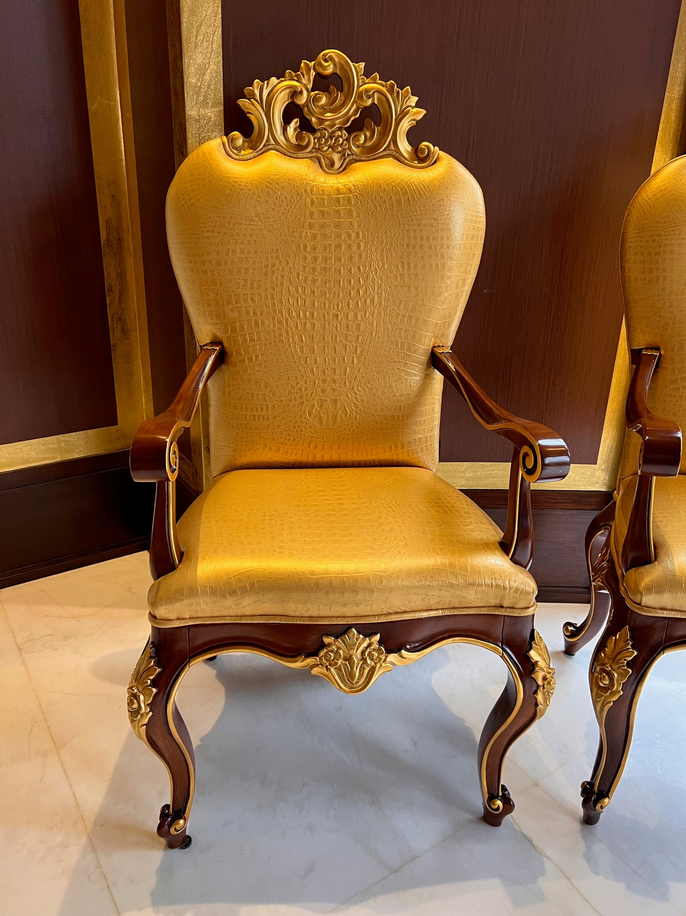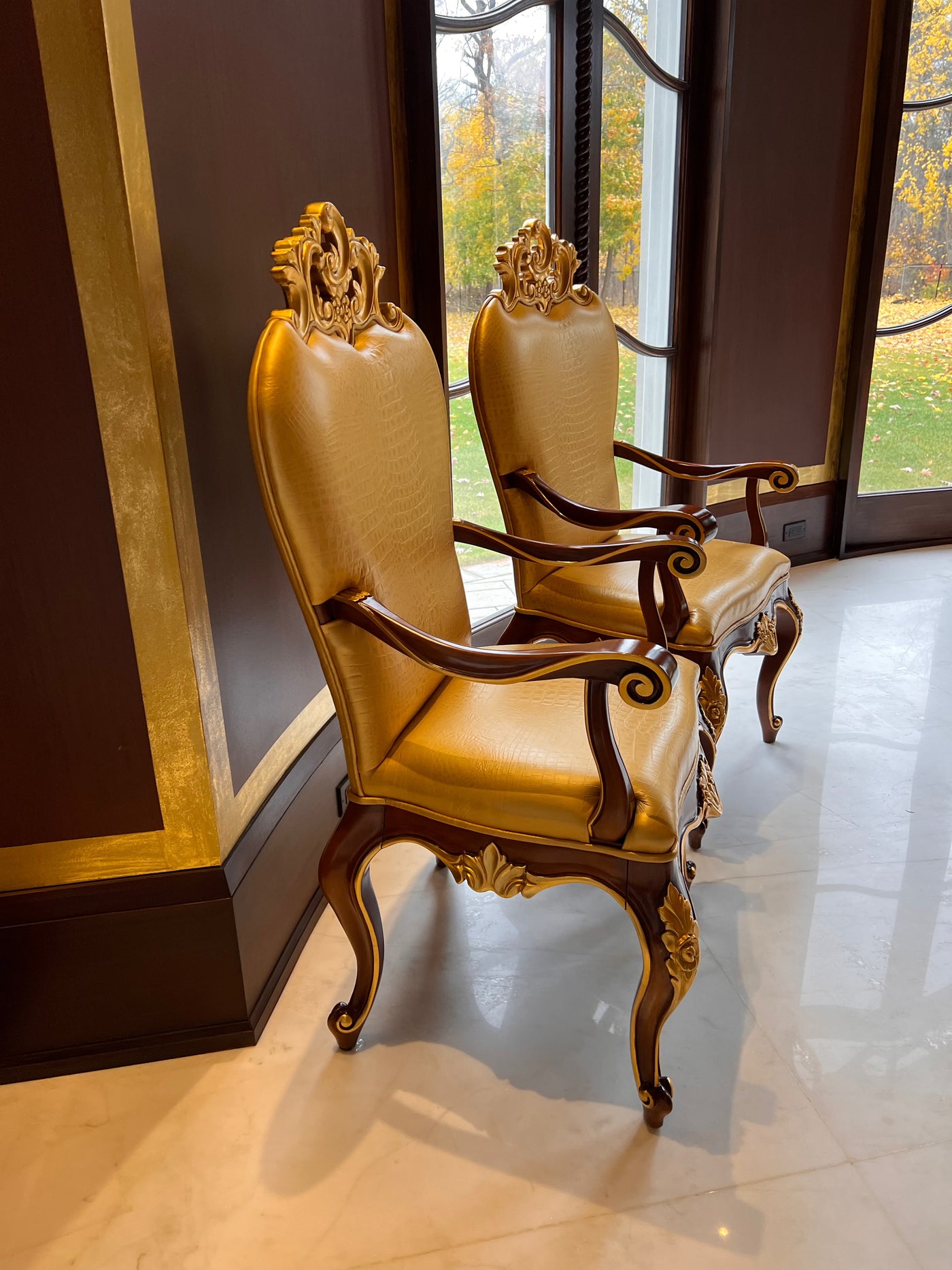 2 'Modenese Gastone Luxury Interiors' Baroque Leather Armchairs, Walnut Finish with Gold Leaf Details, Made in Italy.