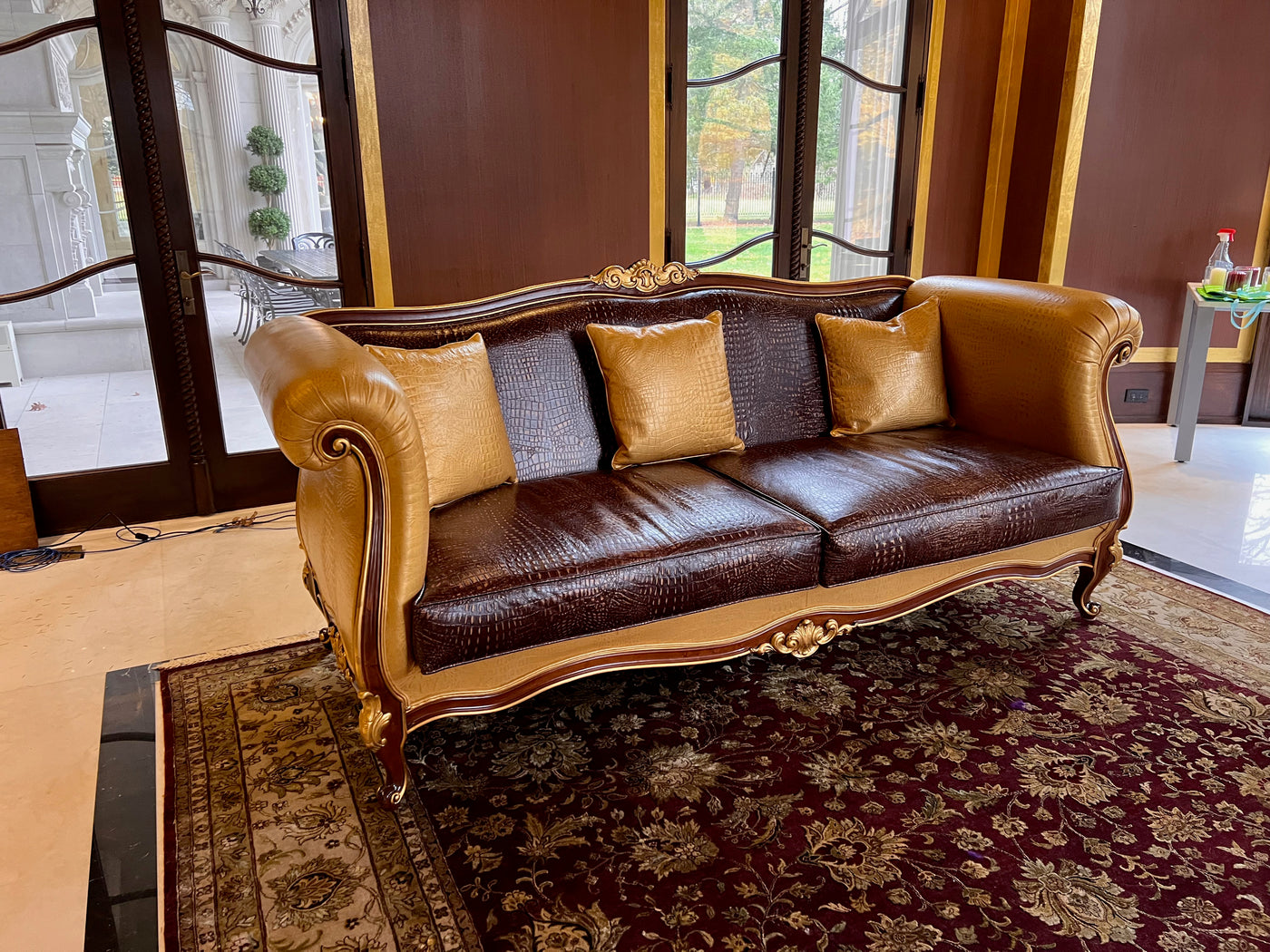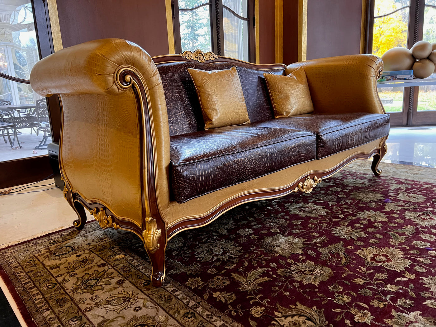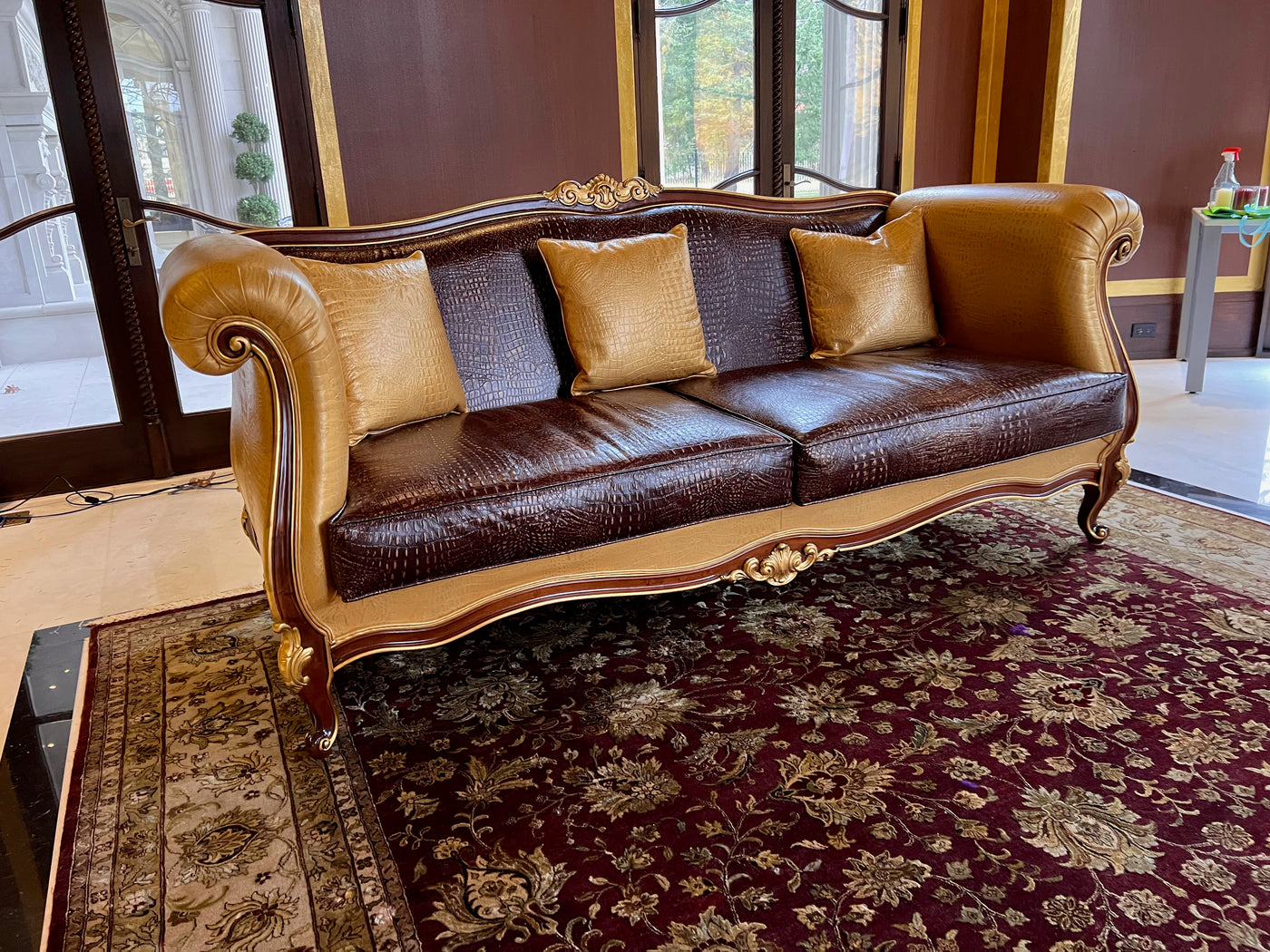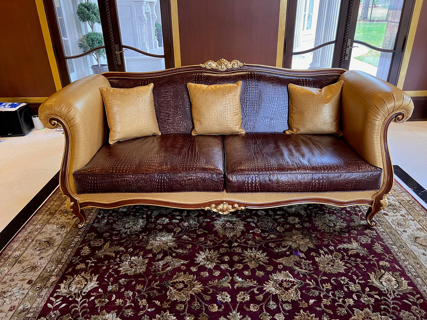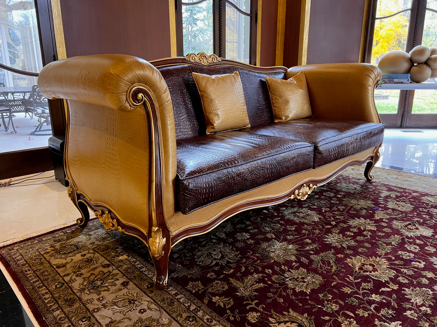 - 'Modenese Gastone Luxury Interiors' Baroque Leather Sofas, Walnut Finish with Gold Leaf Details, Made in Italy (*2 available- sold individually- select quantity) (*retail $19,000 each)