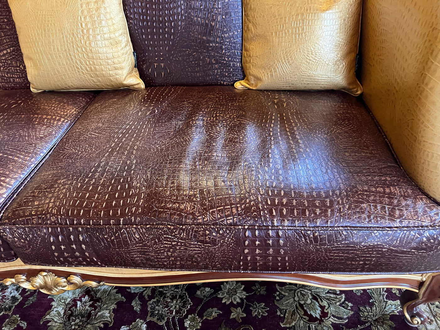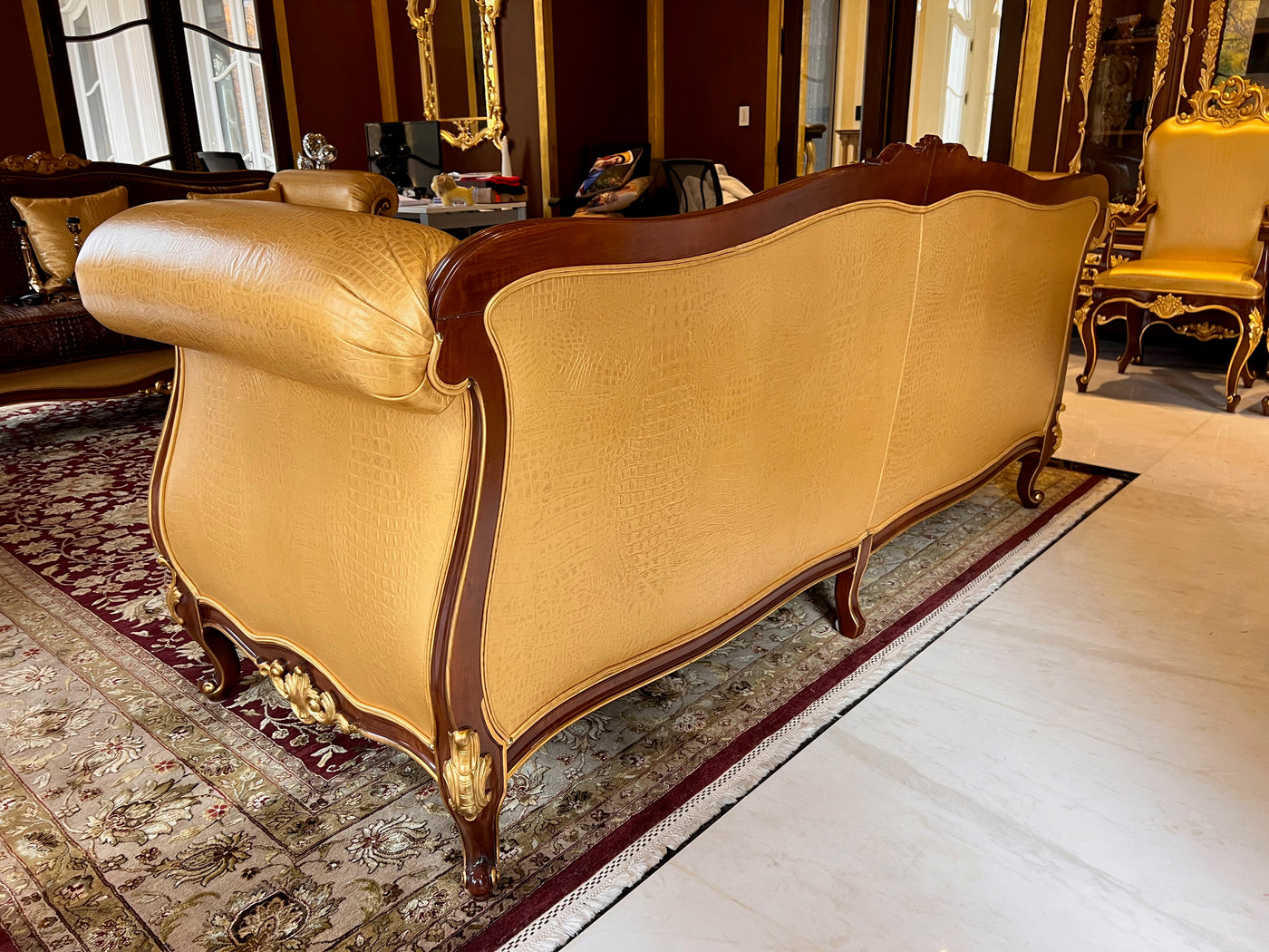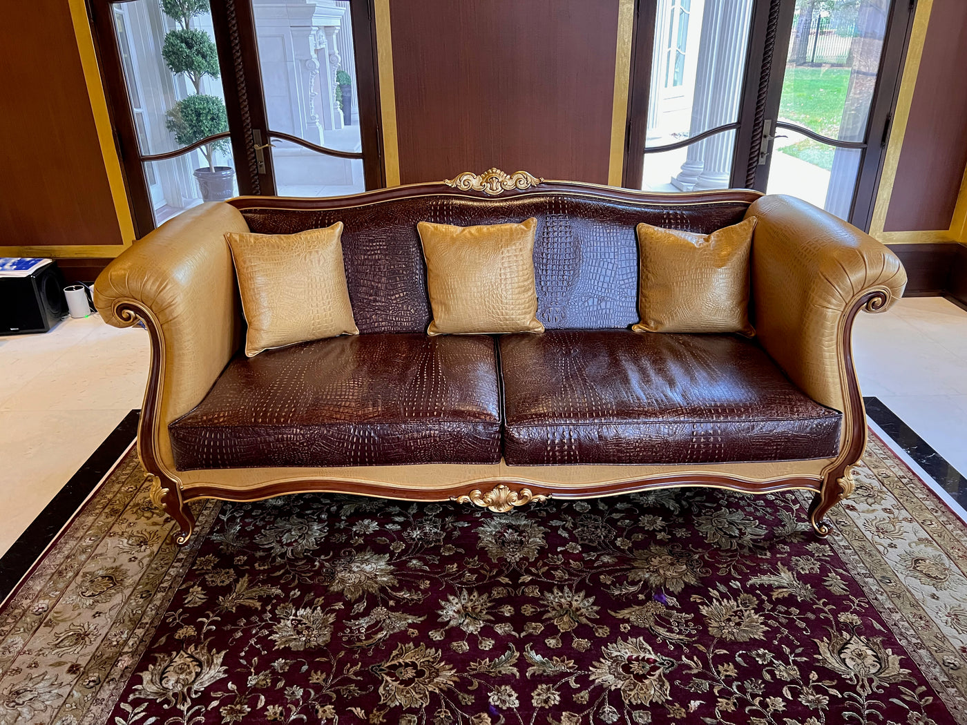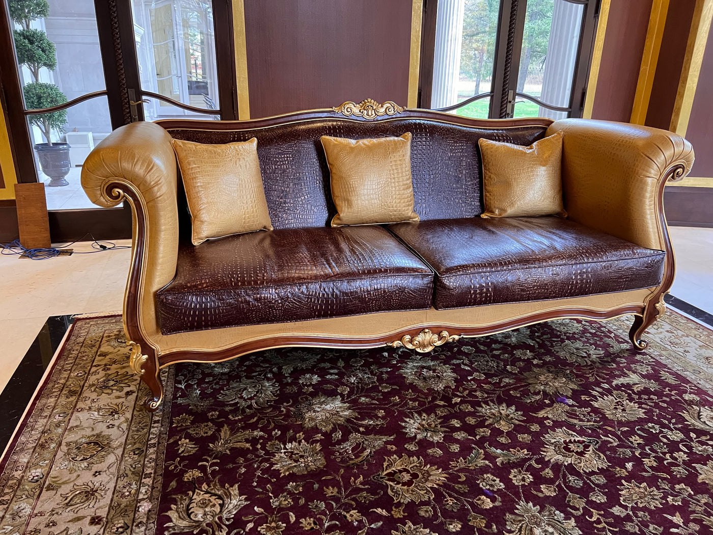 - 'Modenese Gastone Luxury Interiors' Baroque Leather Sofas, Walnut Finish with Gold Leaf Details, Made in Italy (*2 available- sold individually- select quantity) (*retail $19,000 each)