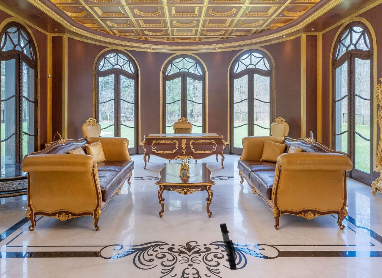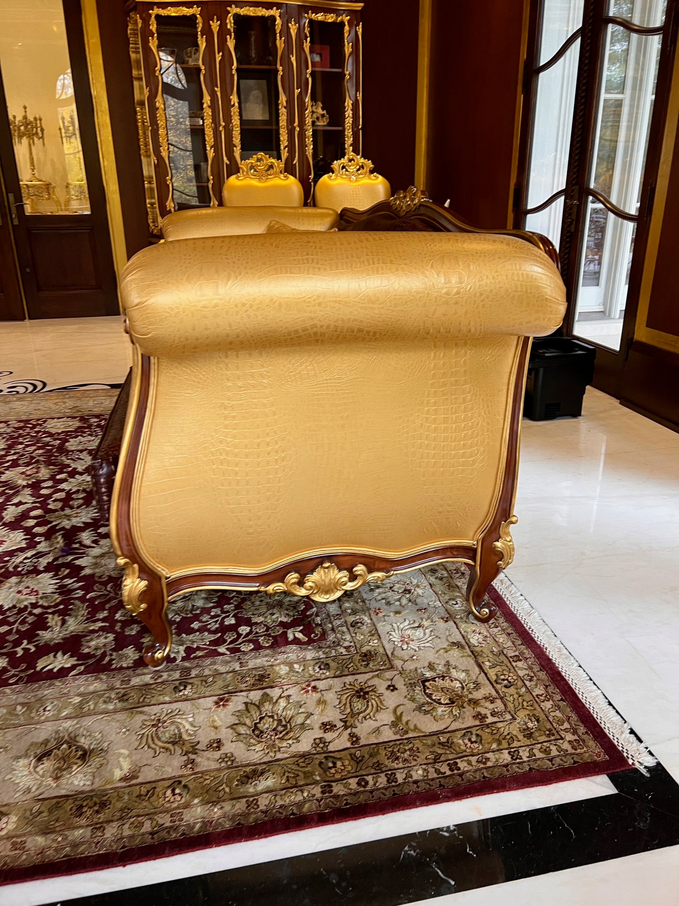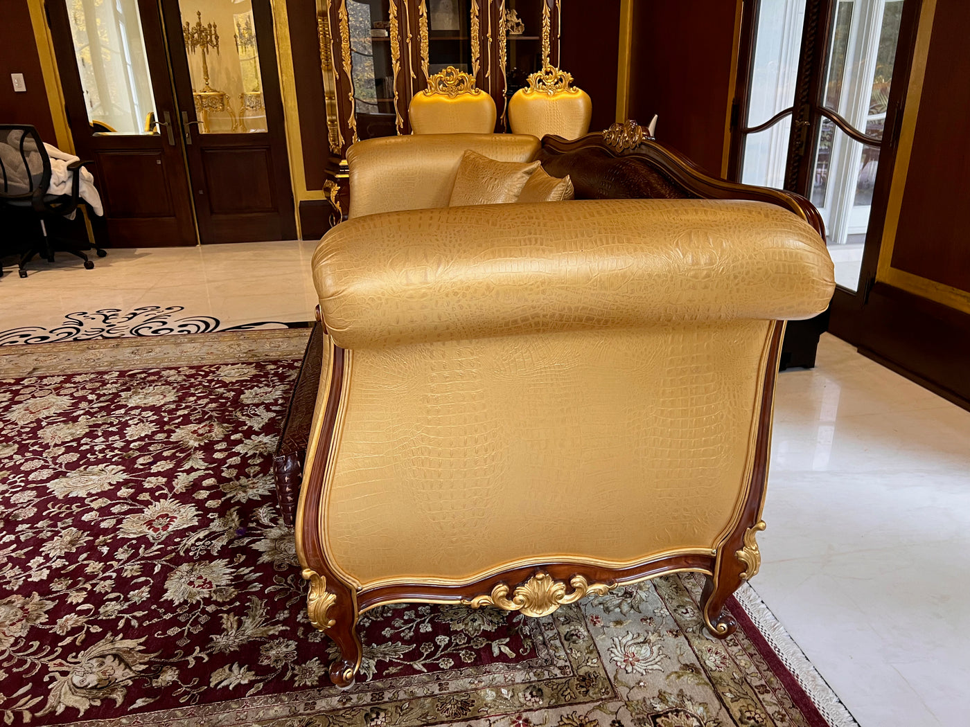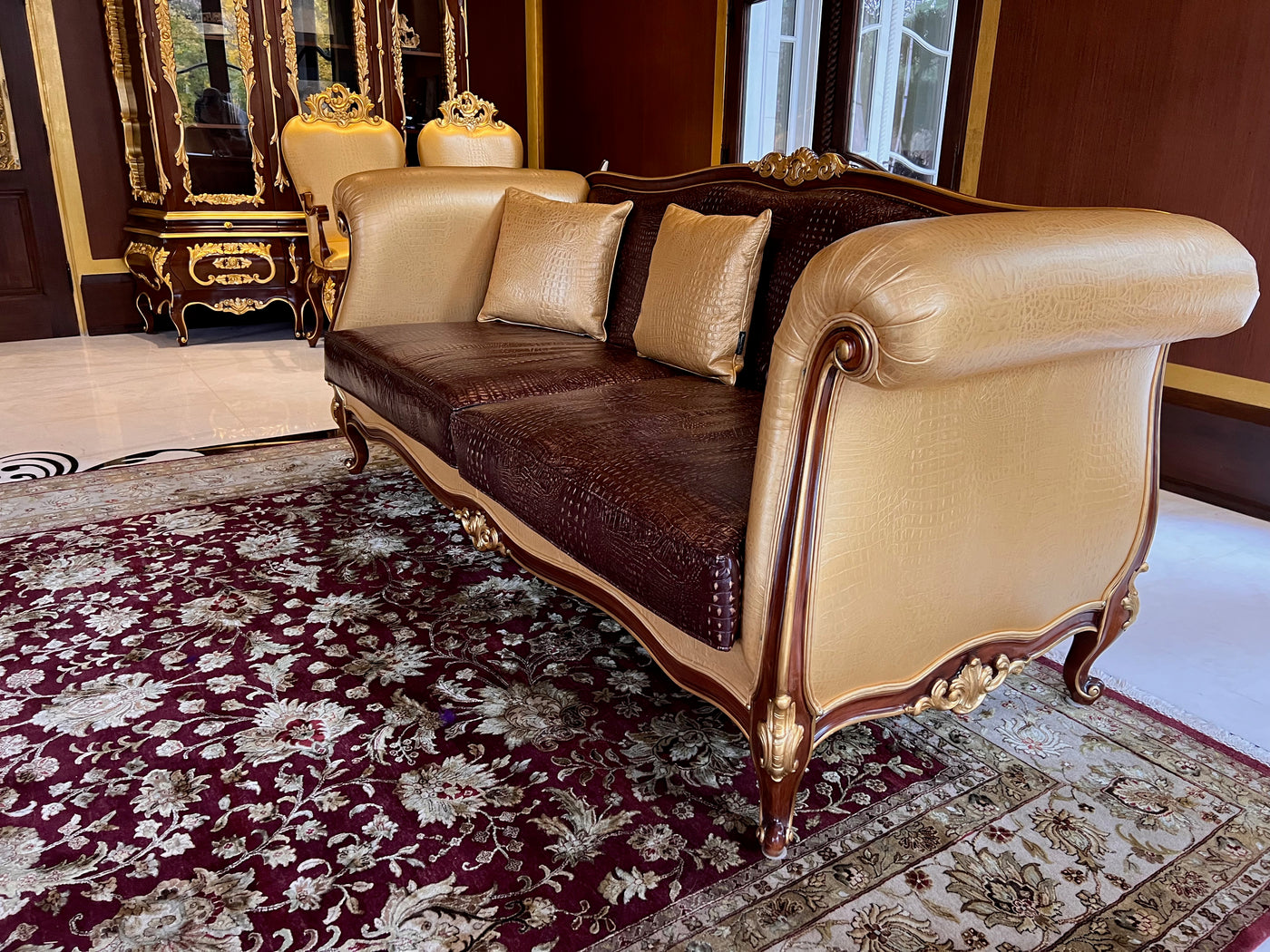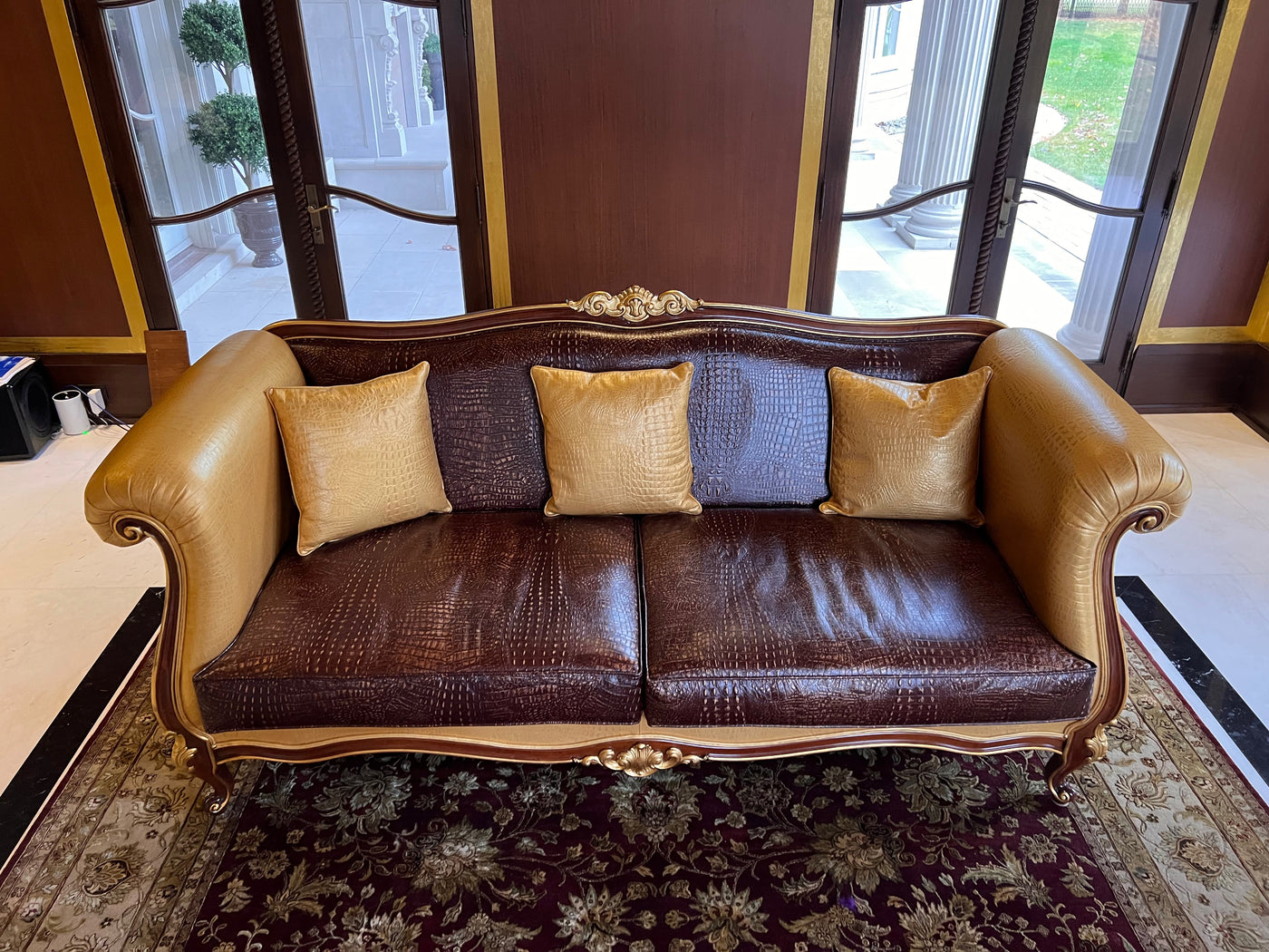 - 'Modenese Gastone Luxury Interiors' Baroque Leather Sofas, Walnut Finish with Gold Leaf Details, Made in Italy (*2 available- sold individually- select quantity) (*retail $19,000 each)