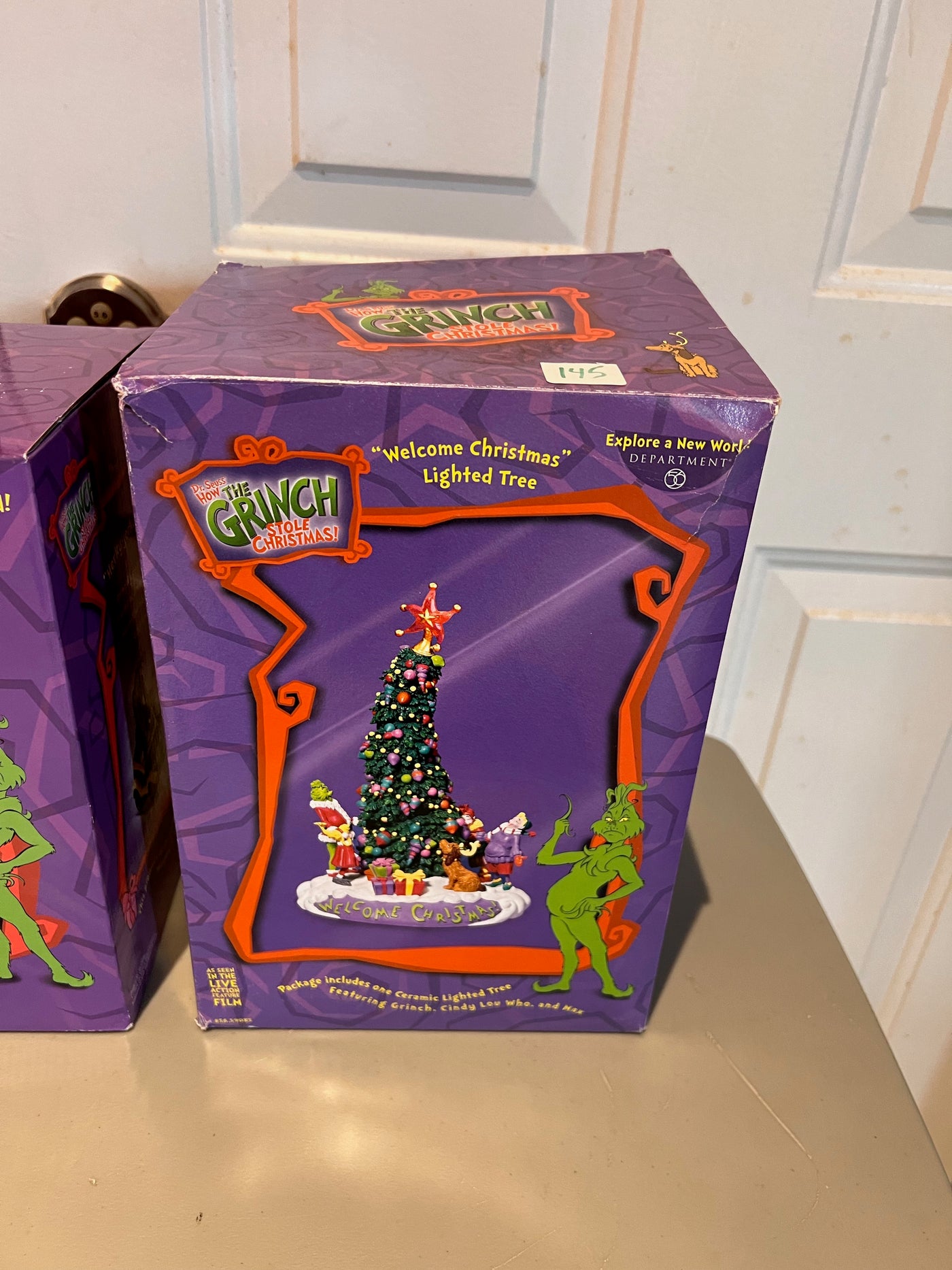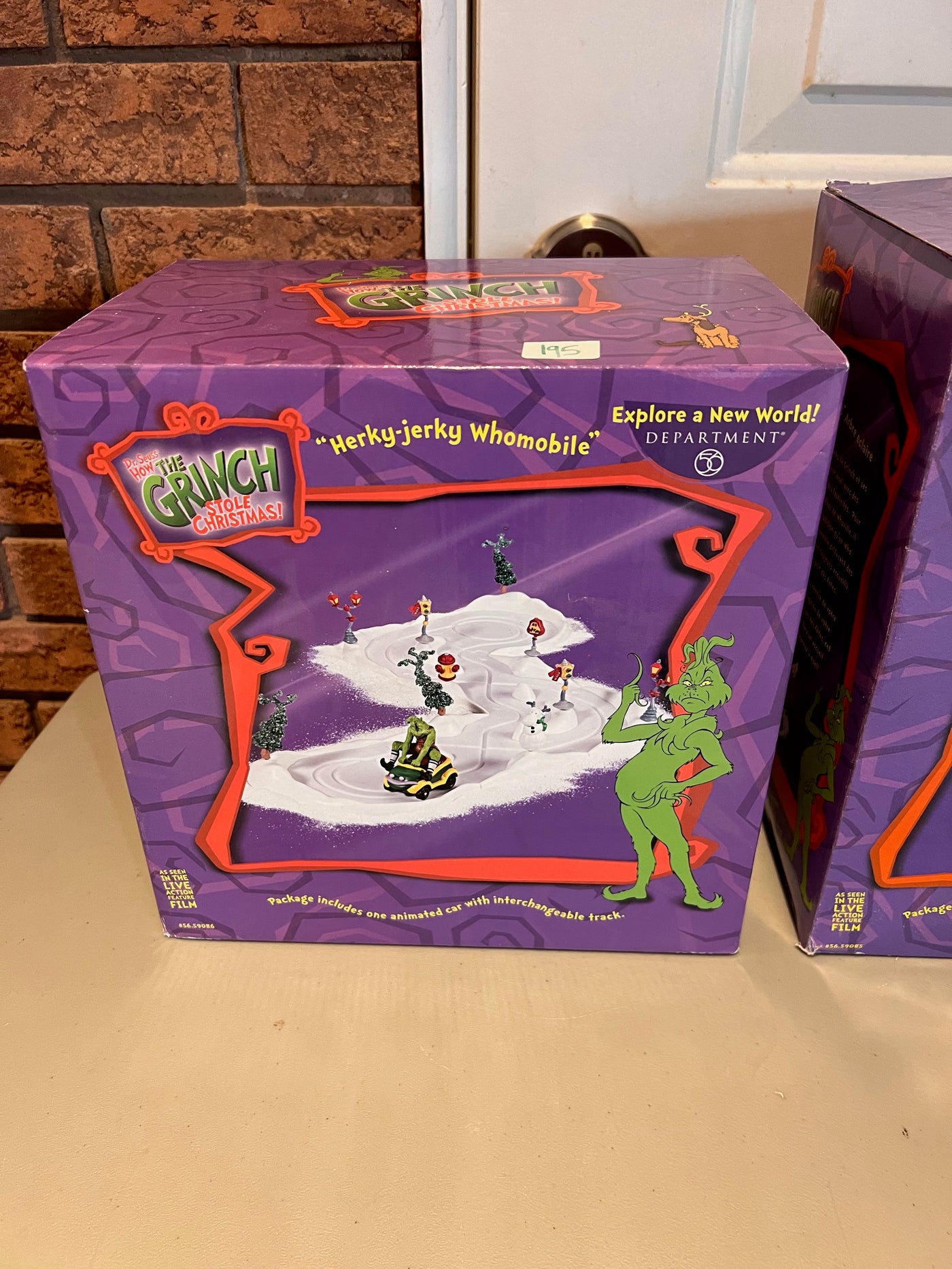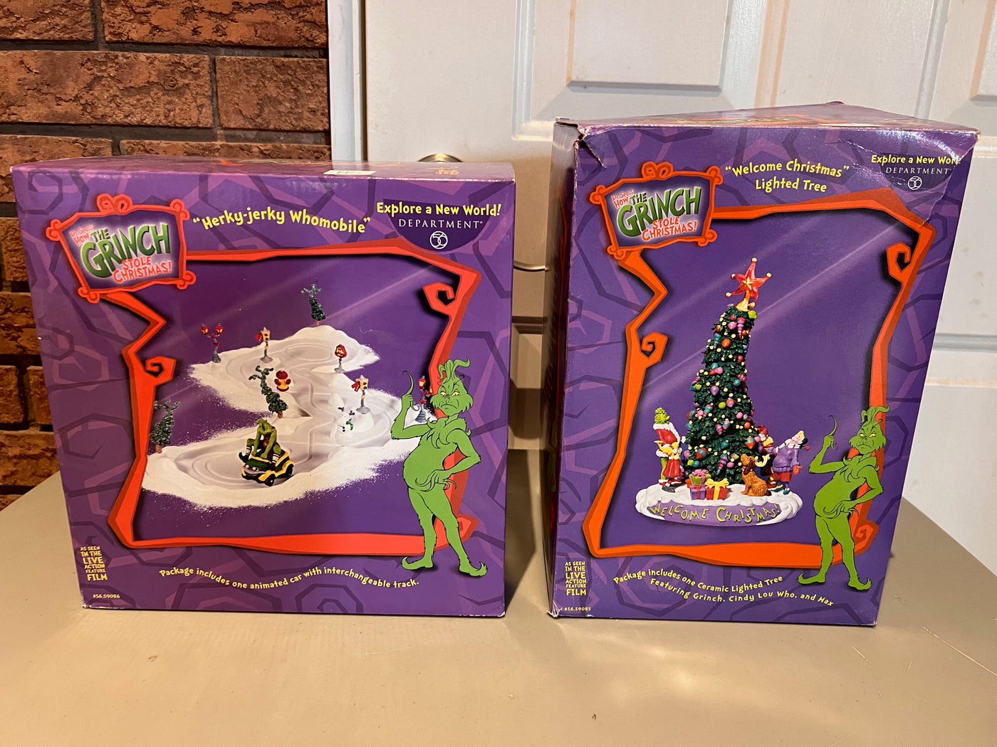 Department 56 How the Grinch Stole Christmas- "Herky-jerky Whomobile" + "Welcome Christmas" Lighted Tree.