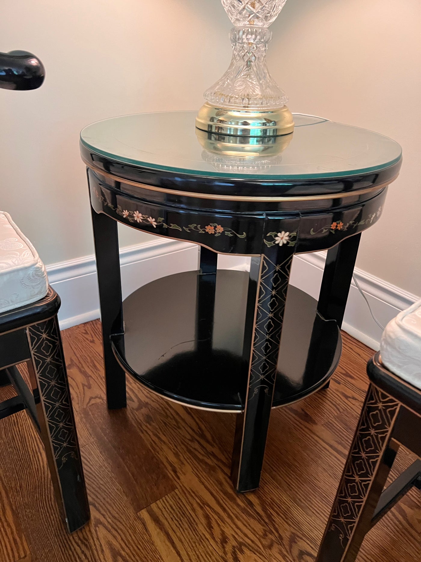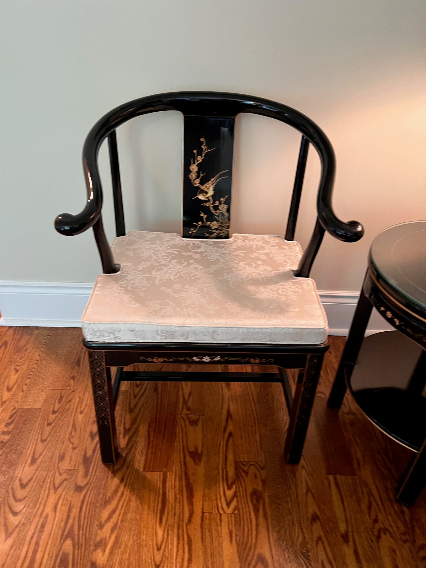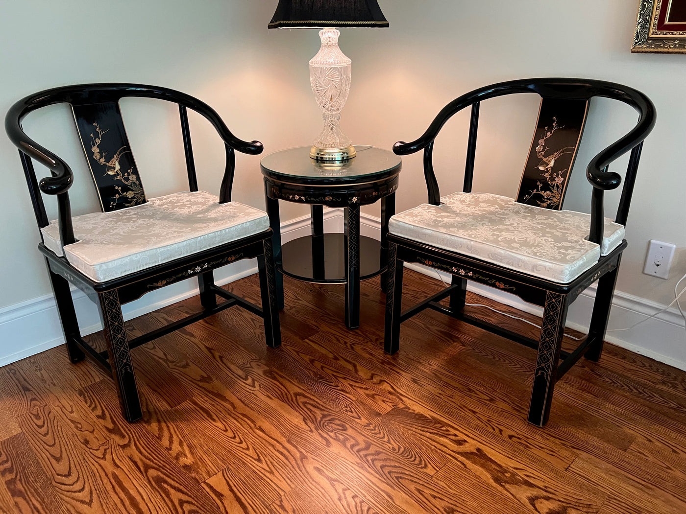 3pc Set- Pair of Chinese Chinoiserie Horseshoe Lacquered Chairs + 2 Matching Side Tables