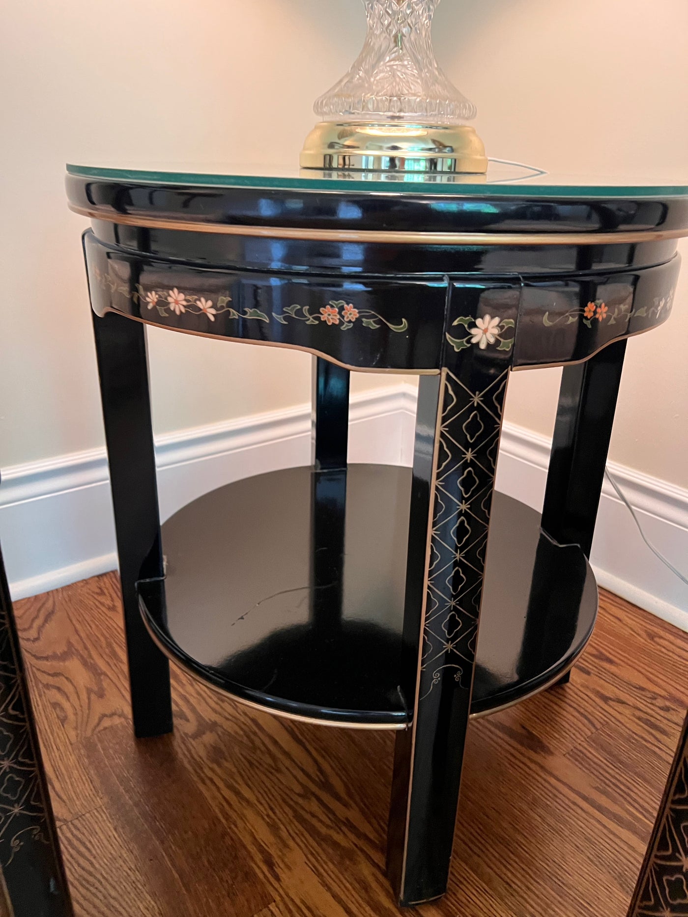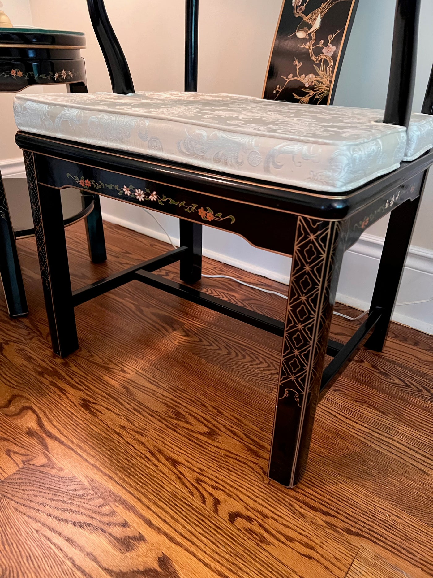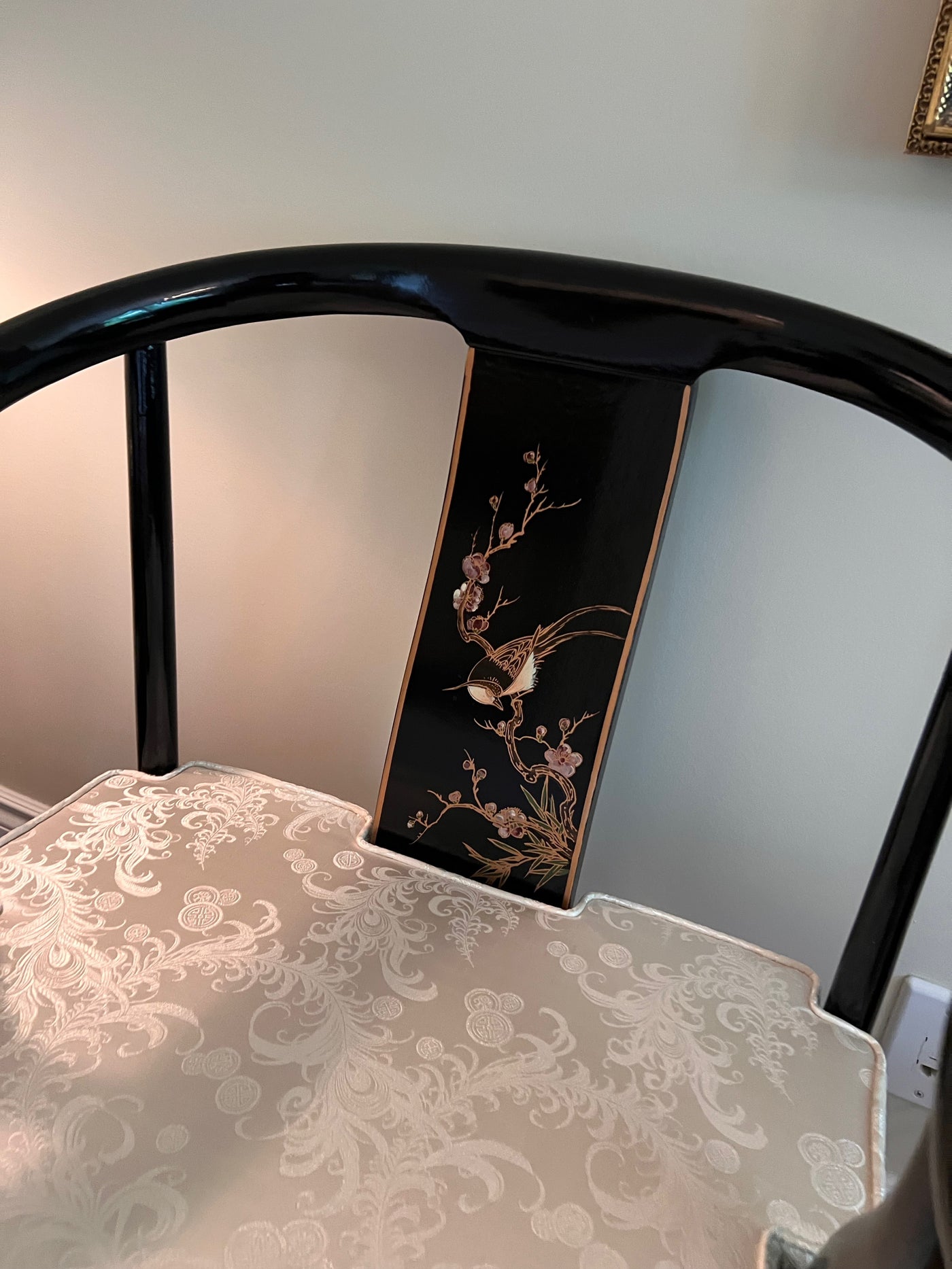 3pc Set- Pair of Chinese Chinoiserie Horseshoe Lacquered Chairs + 2 Matching Side Tables