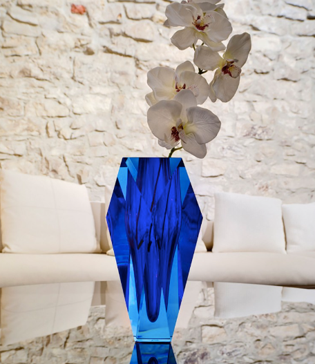 The Gema Vase collection by Moser is a contemporary home decor accent inspired by the timeless beauty of a diamond. The deep hand cutting on each of these colored vases beautifully emphasizes the optic nature of the glass. As much pieces of art, these flower vases are also sculptural centerpieces.