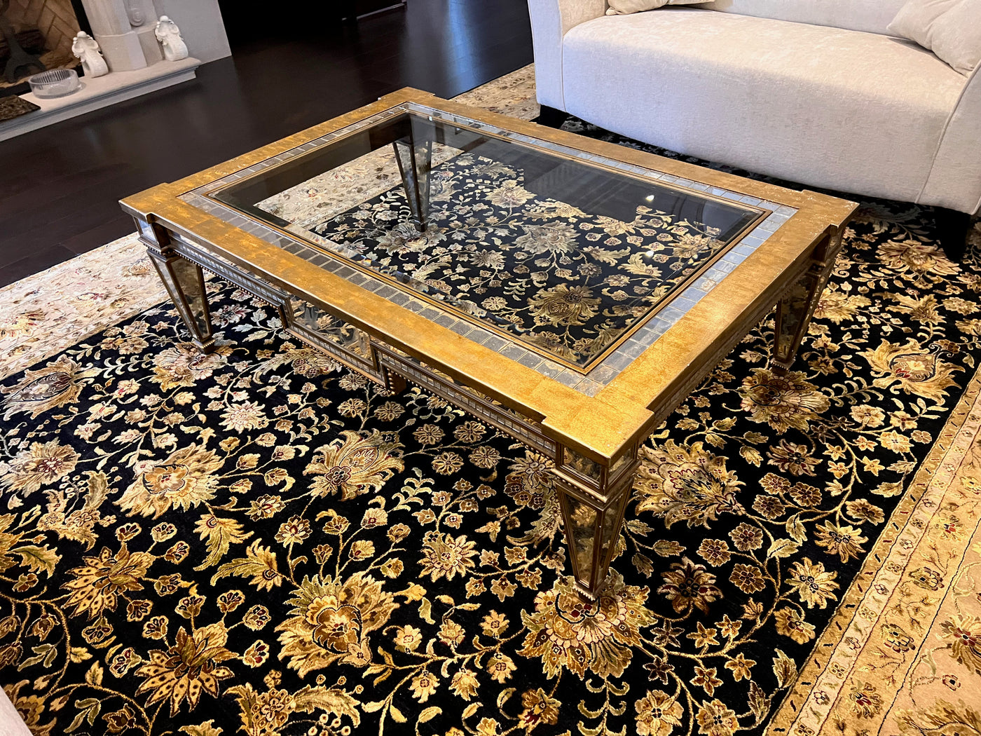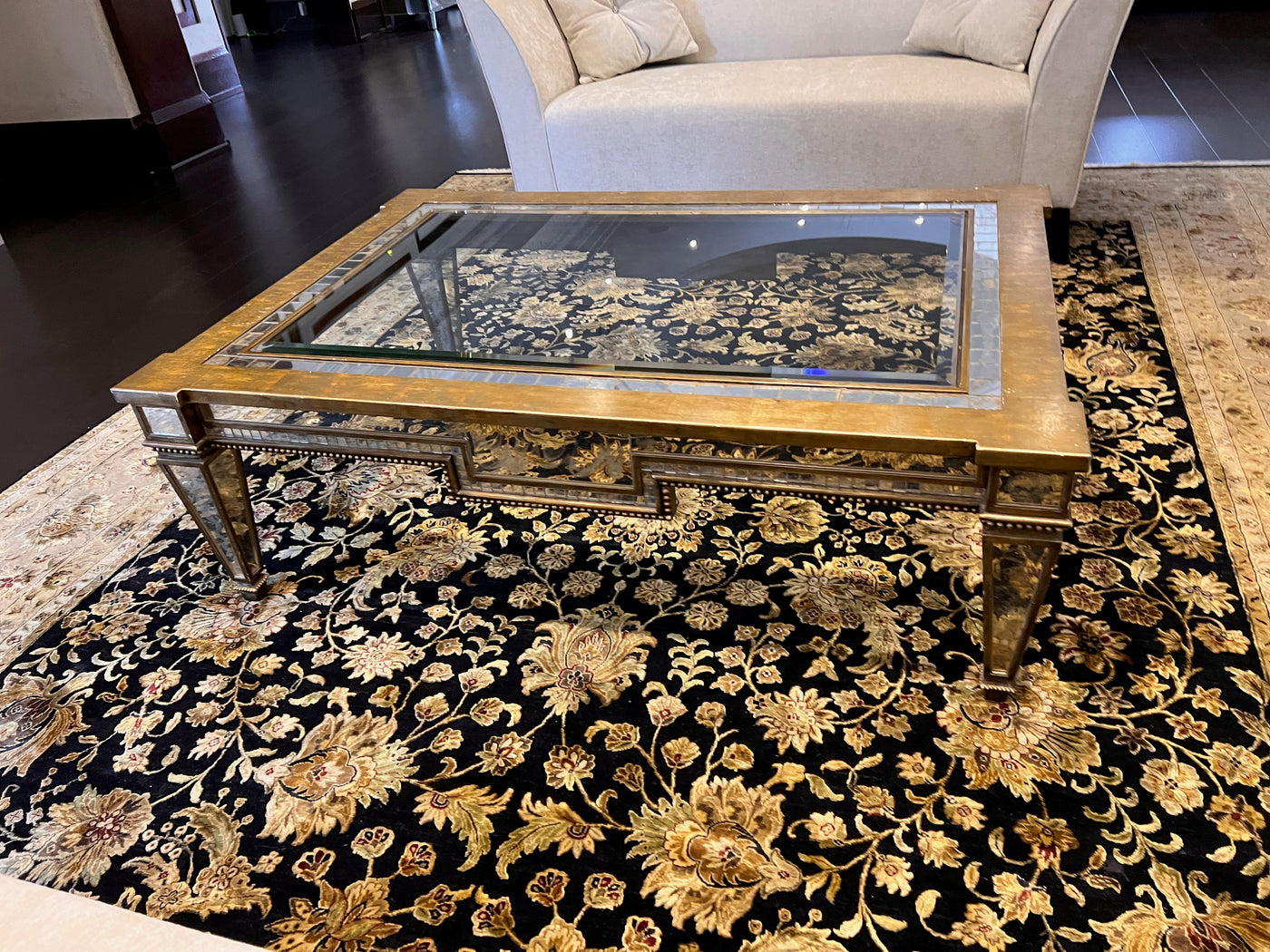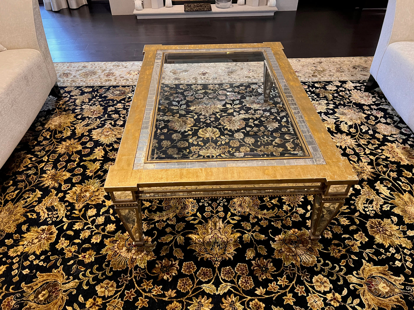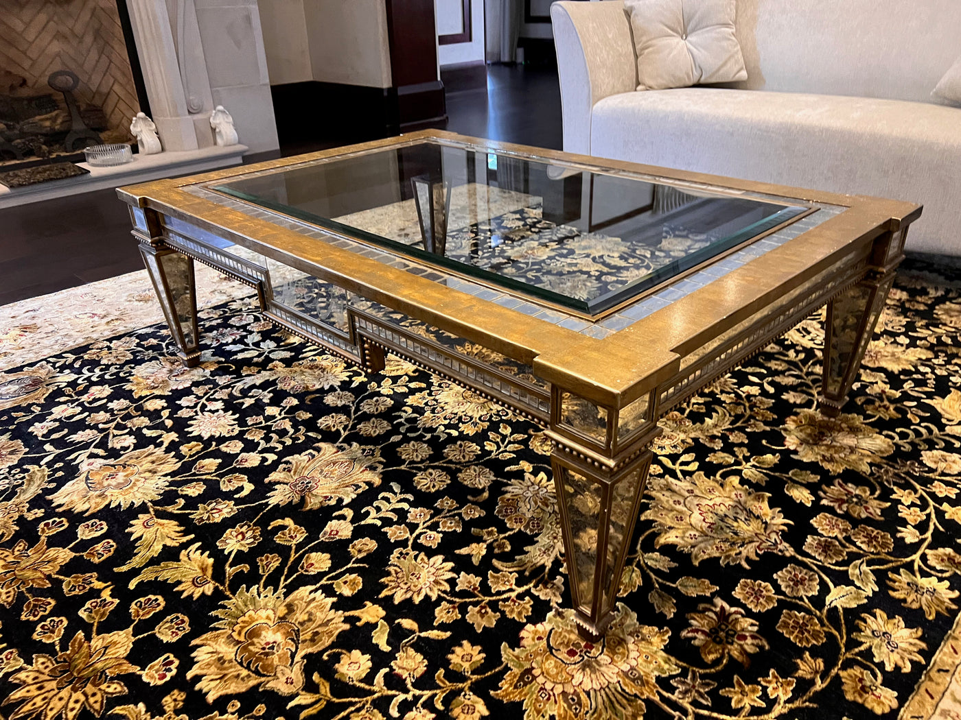 Coffee Table. Gold/Silver accents, mirrored legs and glass top.