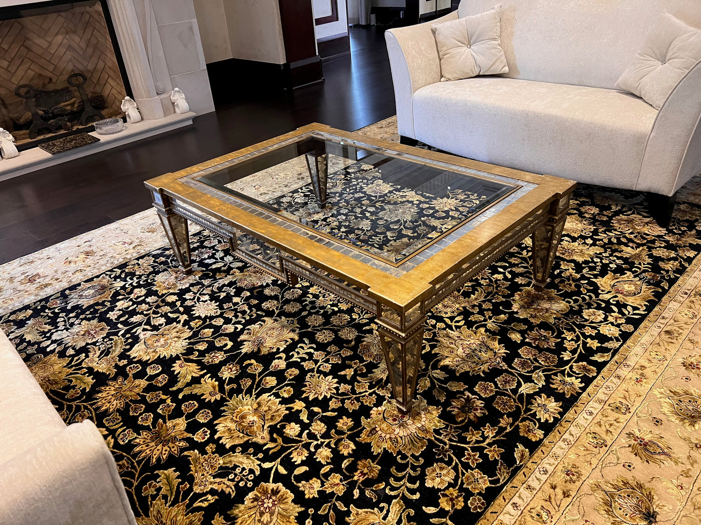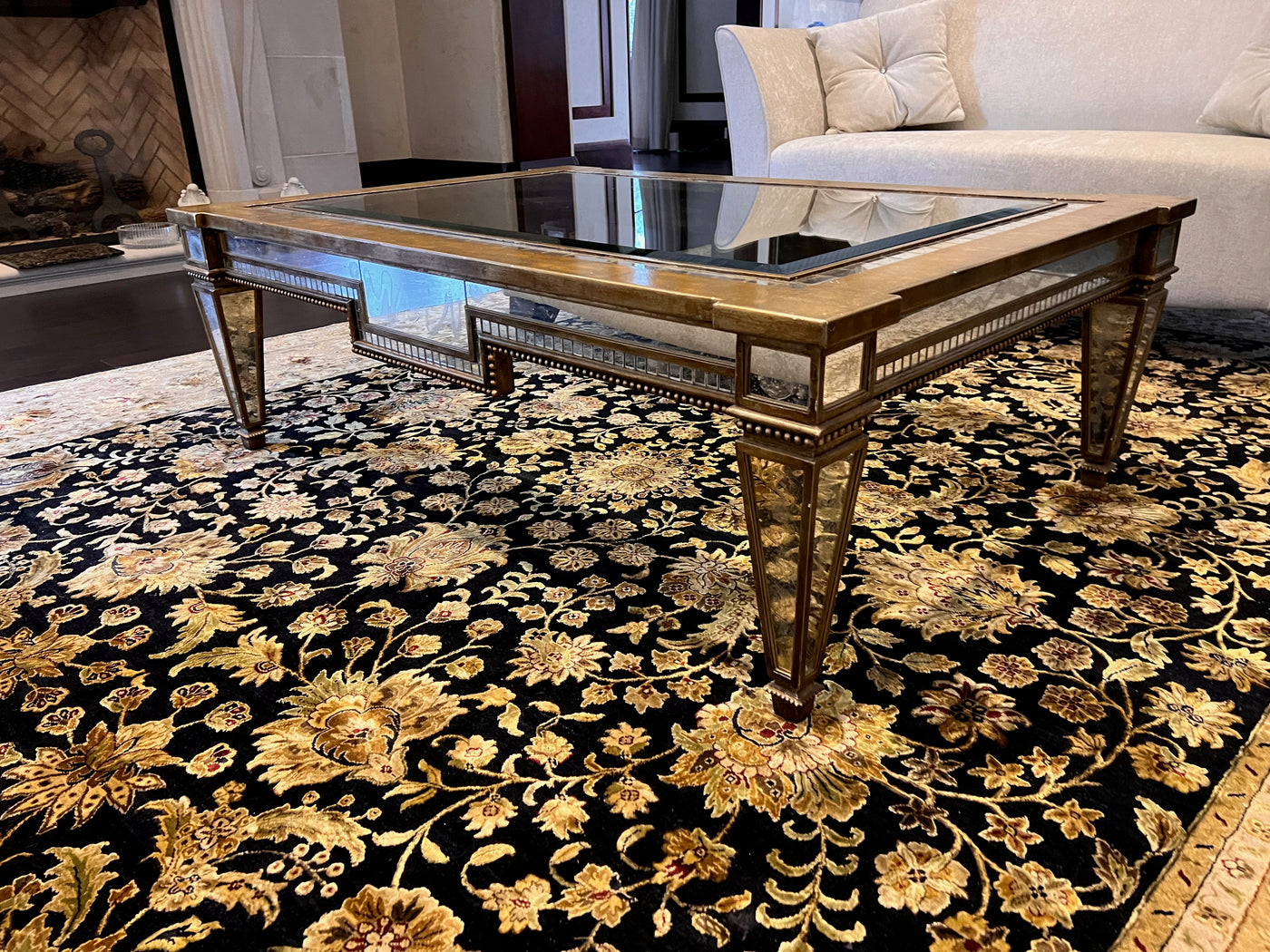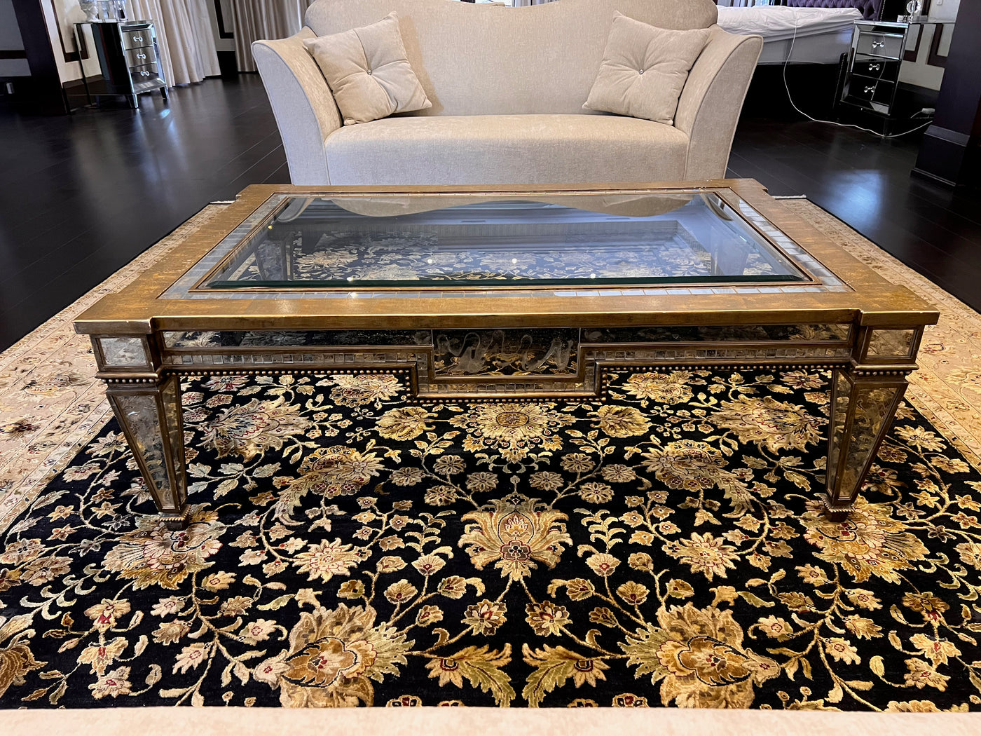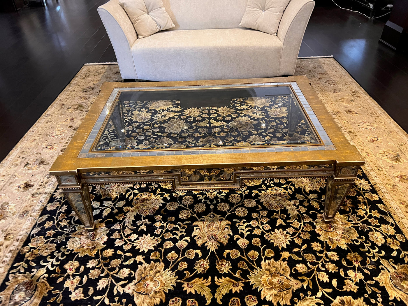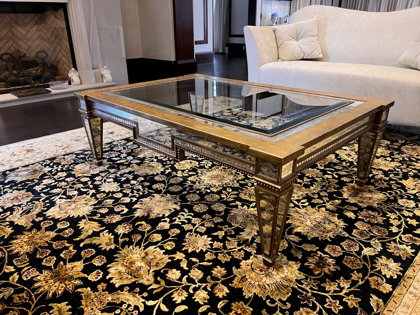 Coffee Table. Gold/Silver accents, mirrored legs and glass top.