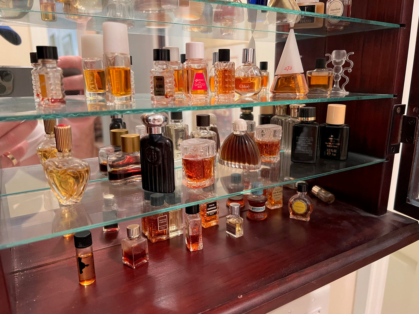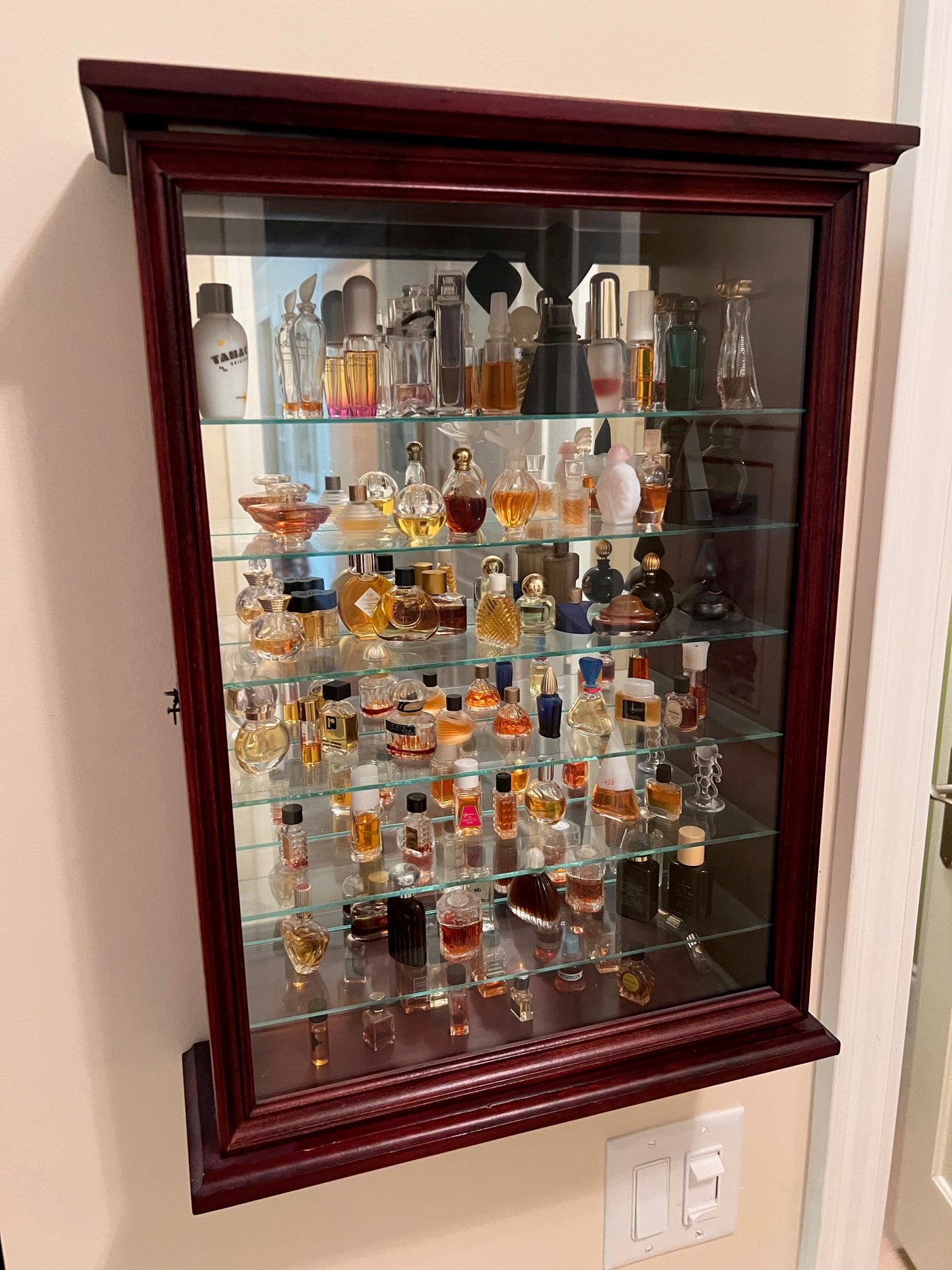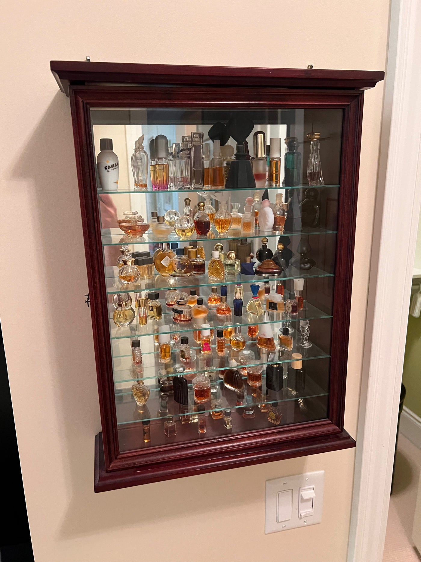 Small Wall Mounted Display Cabinet with Mini Perfume Collection Lot (approx 70 bottles)