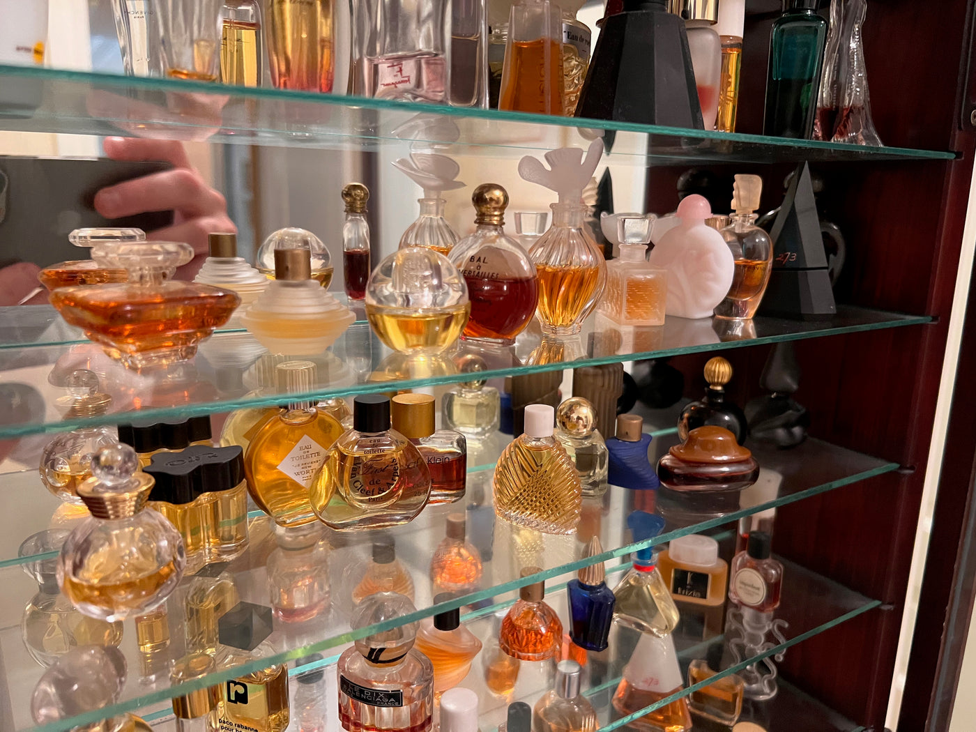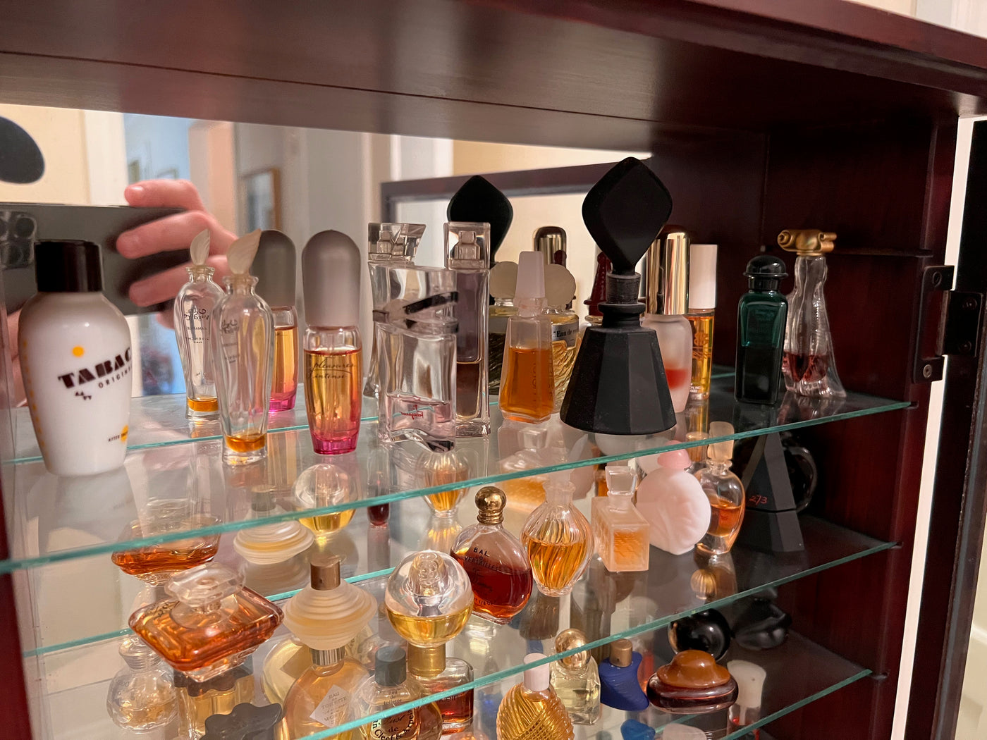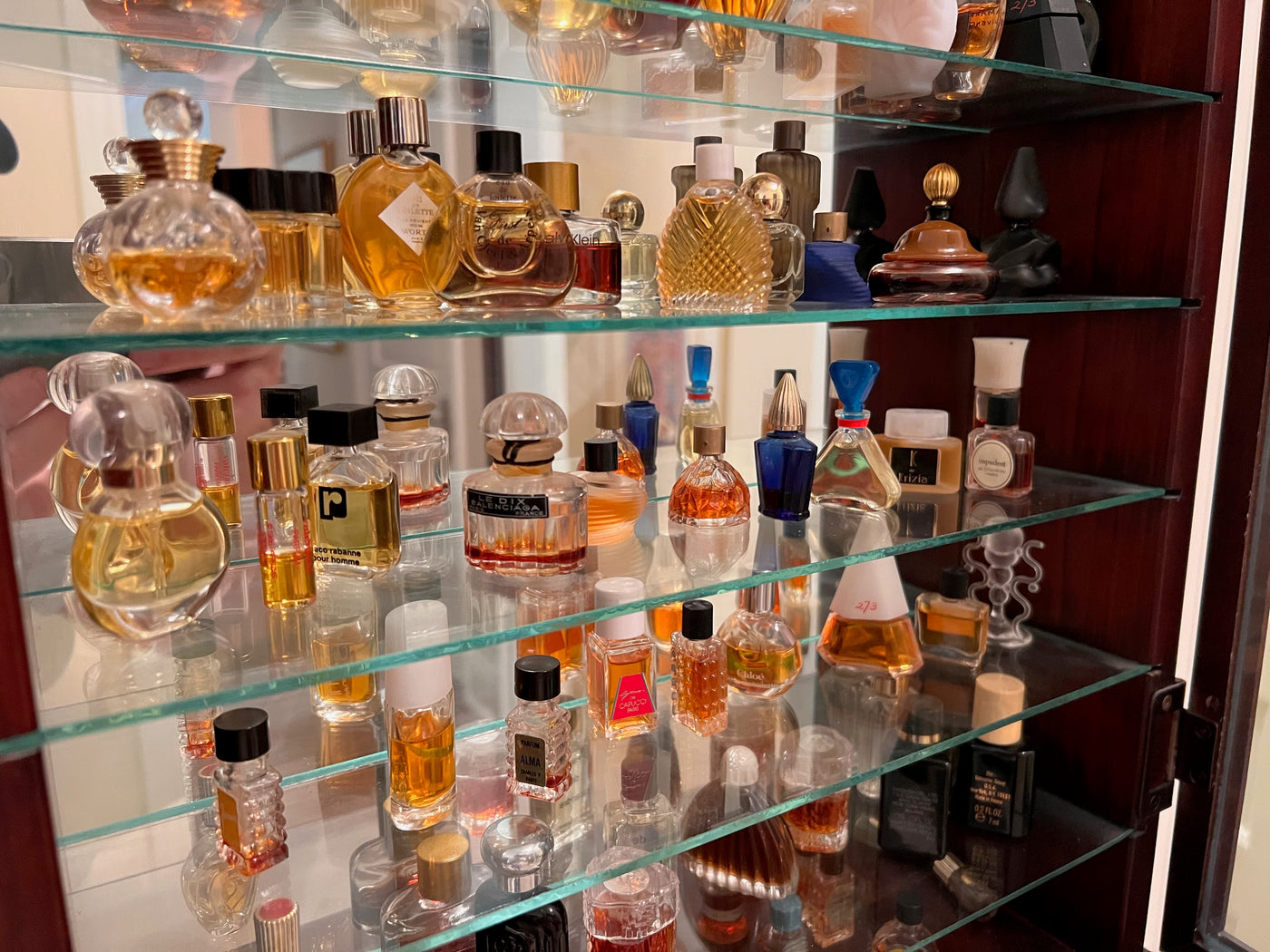 Small Wall Mounted Display Cabinet with Mini Perfume Collection Lot (approx 70 bottles)