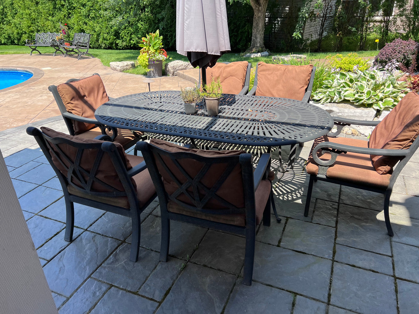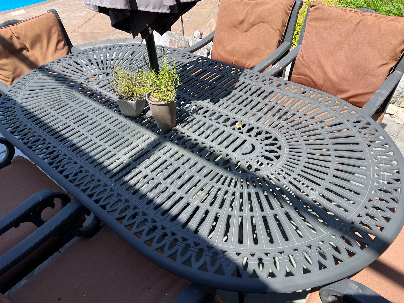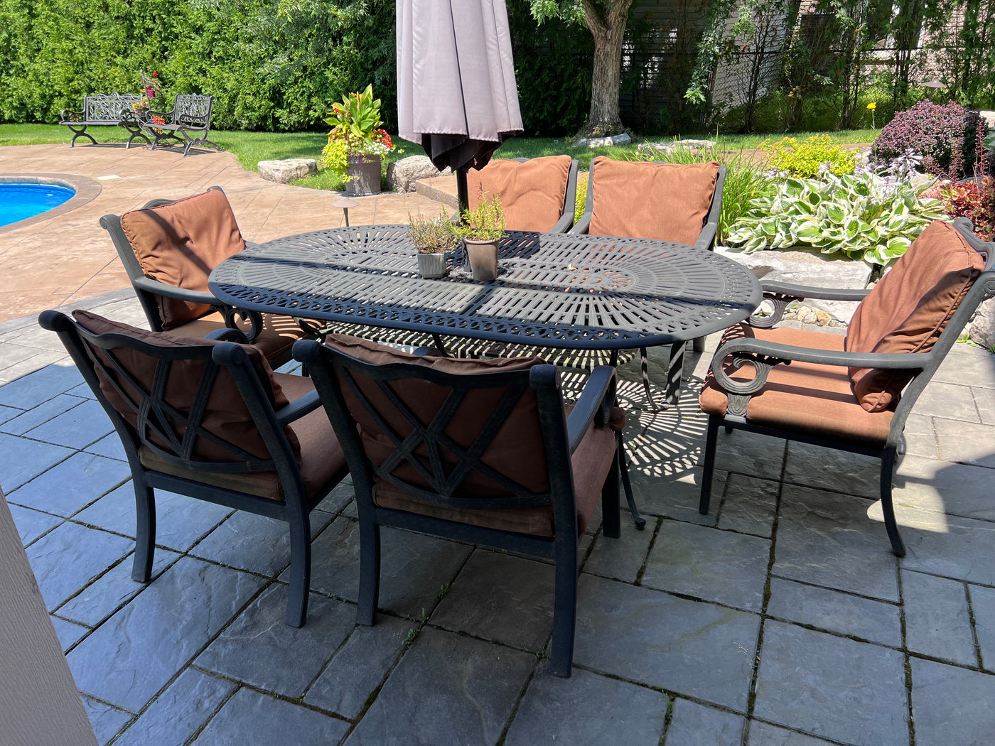 Cast Aluminum Patio Dining Table + 6 Chairs.