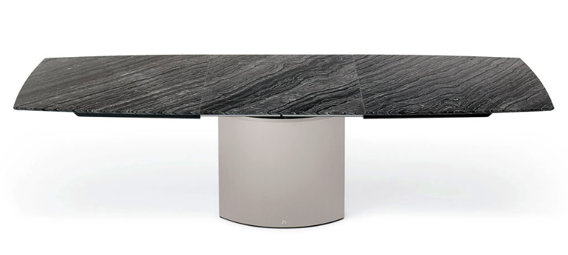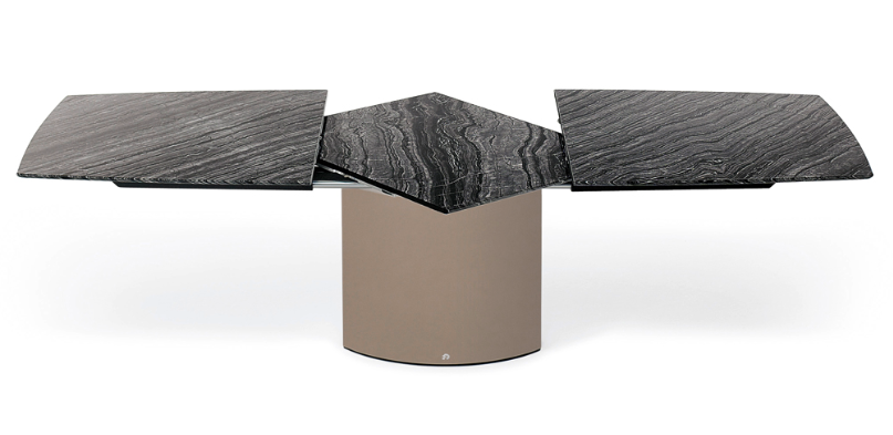 An extensible dining table, boat-shaped, rectangular, organic or oval, made of natural stone or wood with lifting mechanism for an integrated center-leaf made of natural stone or wood. The integrated lifting mechanism allows the interior central leaf to be raised once the two halves of the table top have been pulled apart. An ingenious technique makes the extension a procedure of miraculous ease.