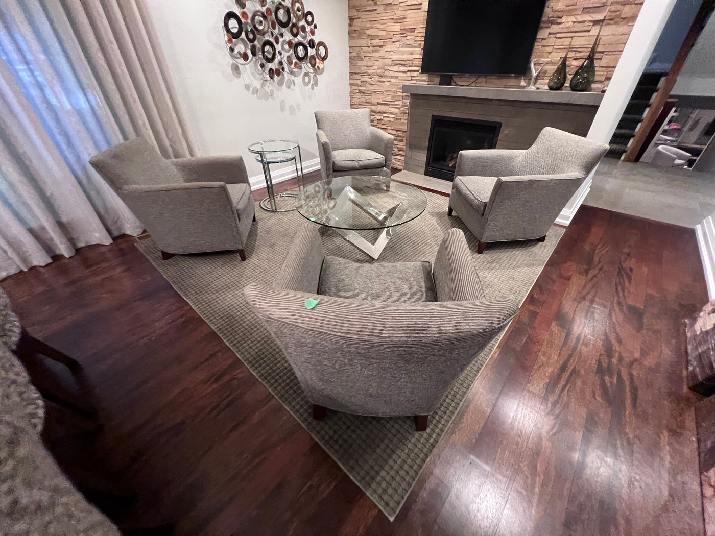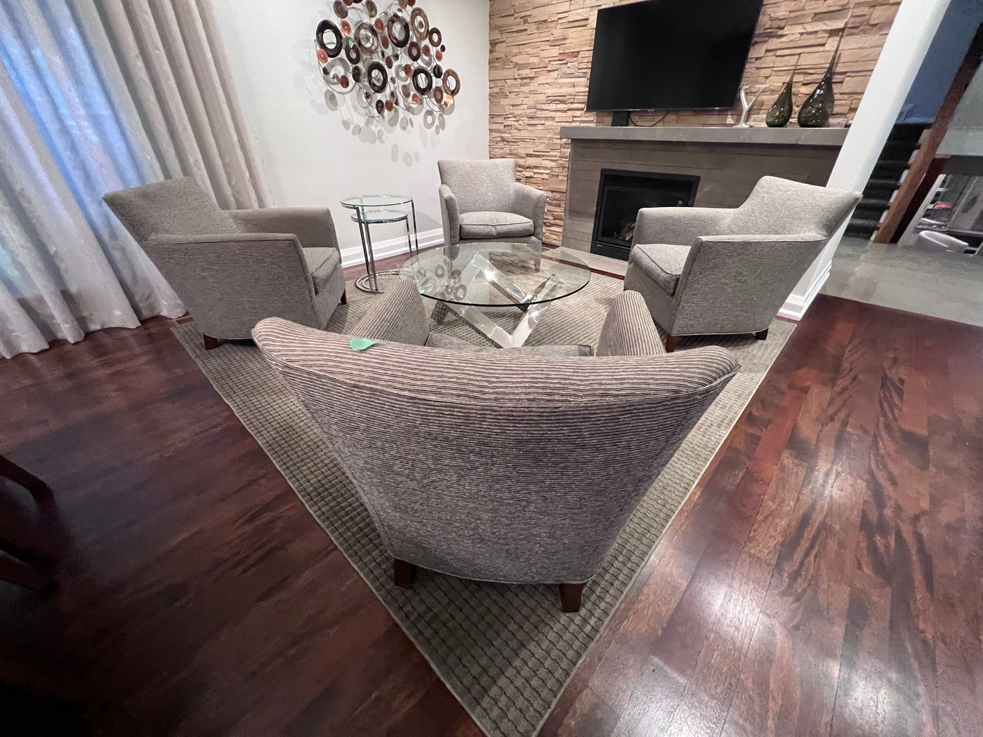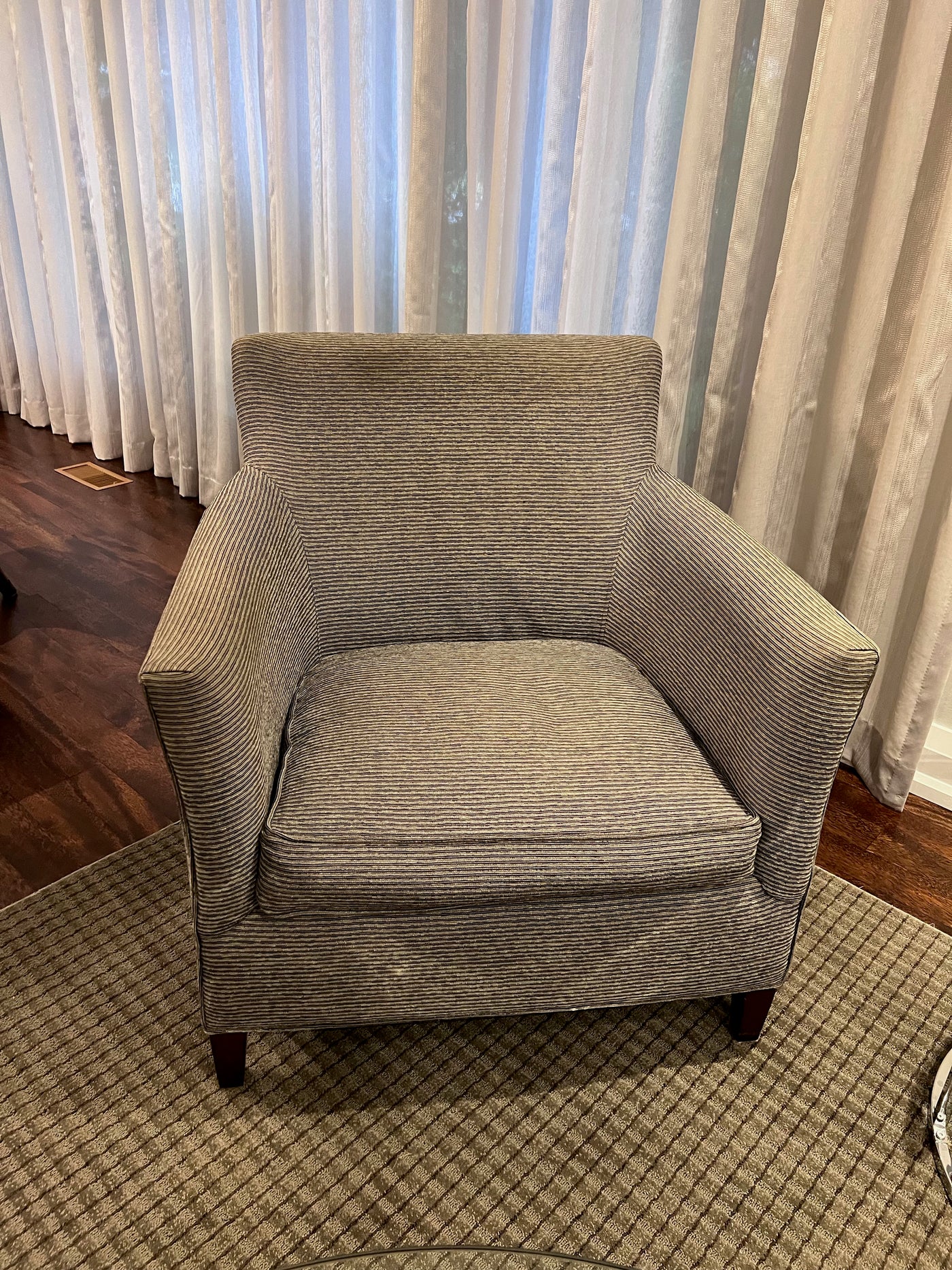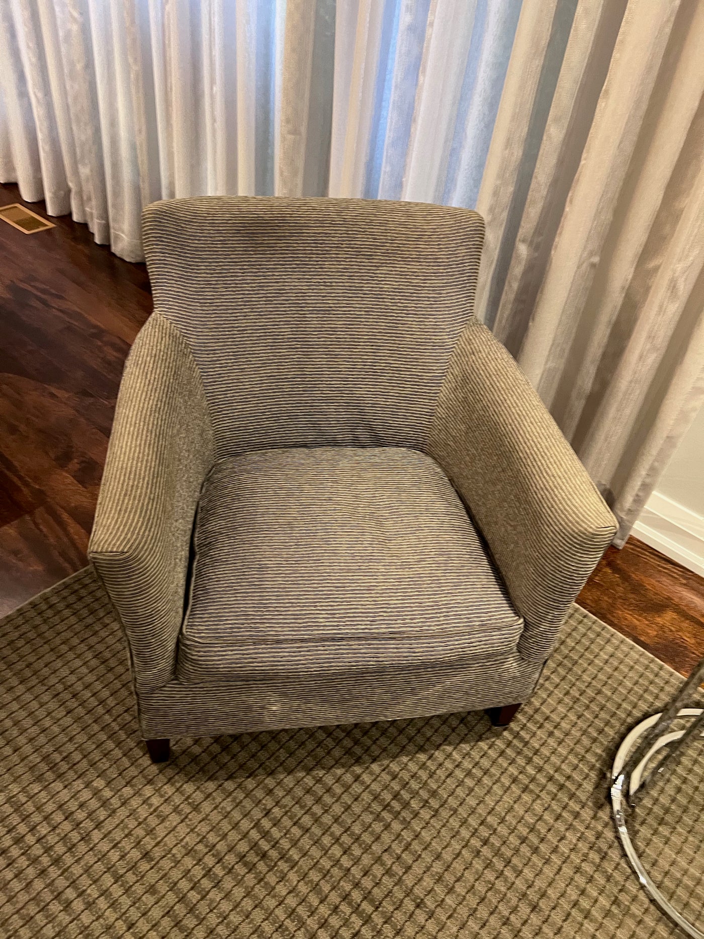 Overall in good condition. No signs of stains, tears or damage. Seat cushions are depressed slightly from normal wear. Please view all pictures.